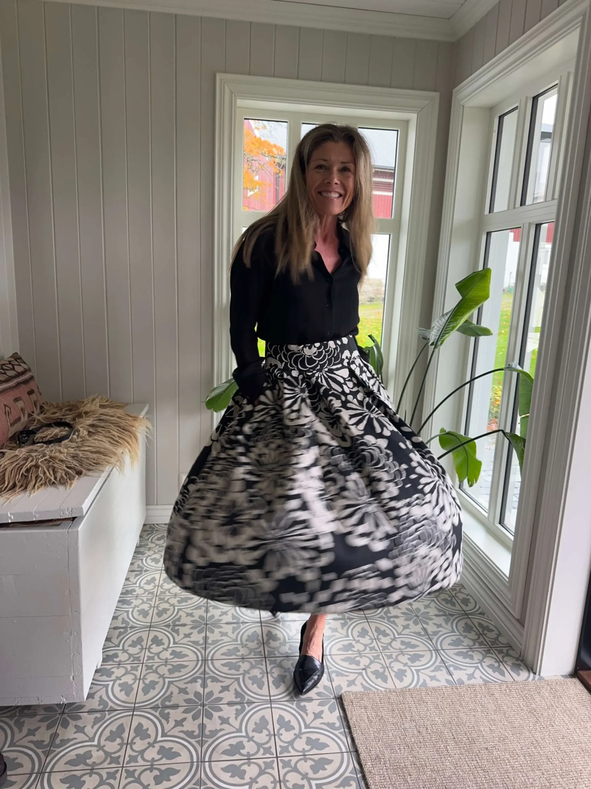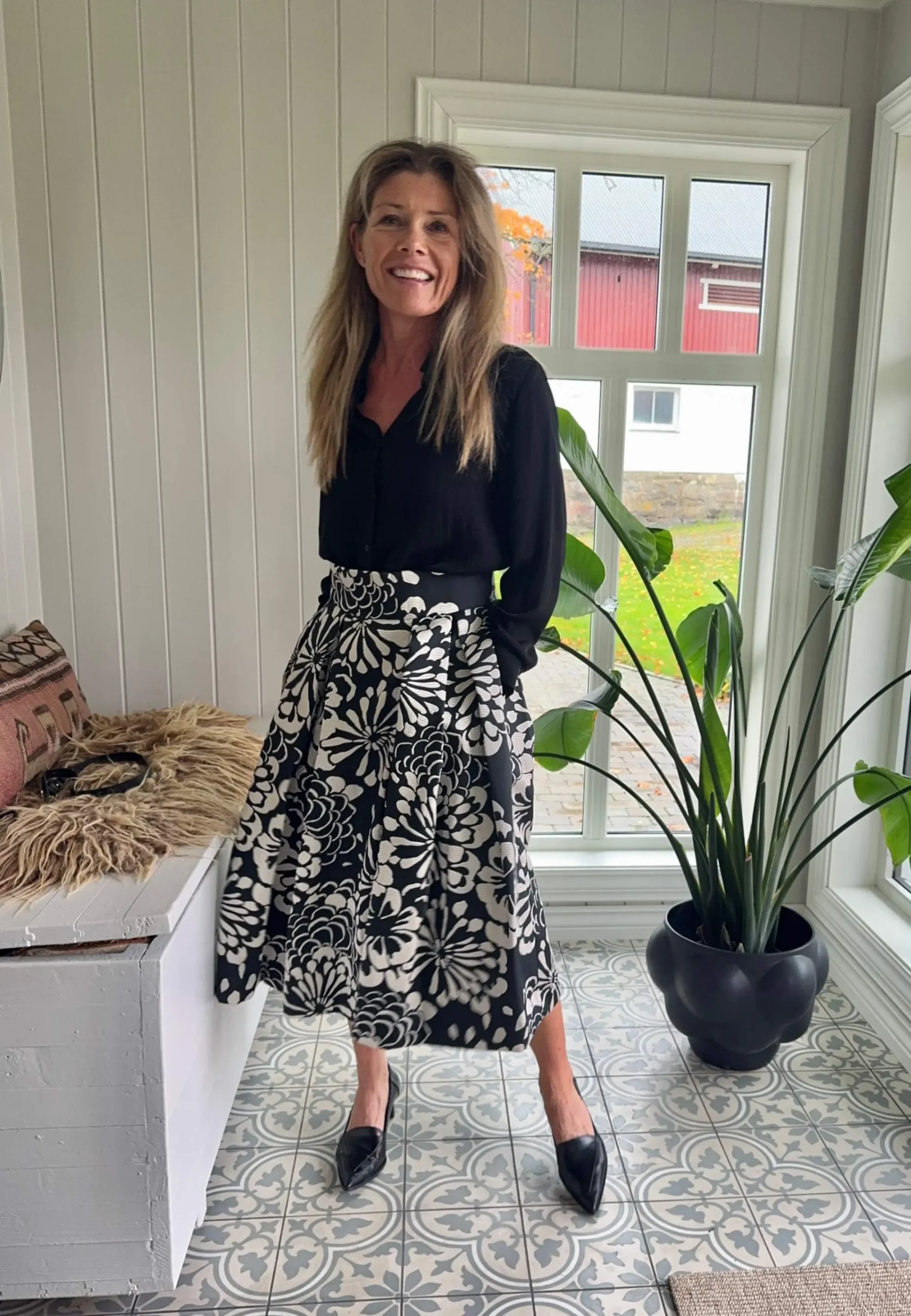 Jacquardskjørt med blomster i ecru og svart som gir et stilsikkert uttrykk. Albis har høy linning, dype legg og midi-lengde som skaper en flatterende, voluminøs fasong. Sidelommer og skjult glidelås bak gir funksjon og god passform, og skjørtet er helfôret for ekstra komfort. Perfekt til fest eller formelle anledninger og er lett å style med bluse og hæler.