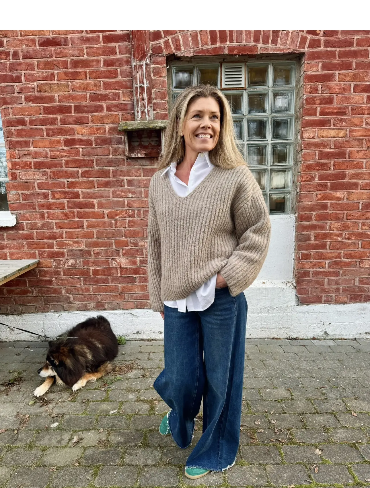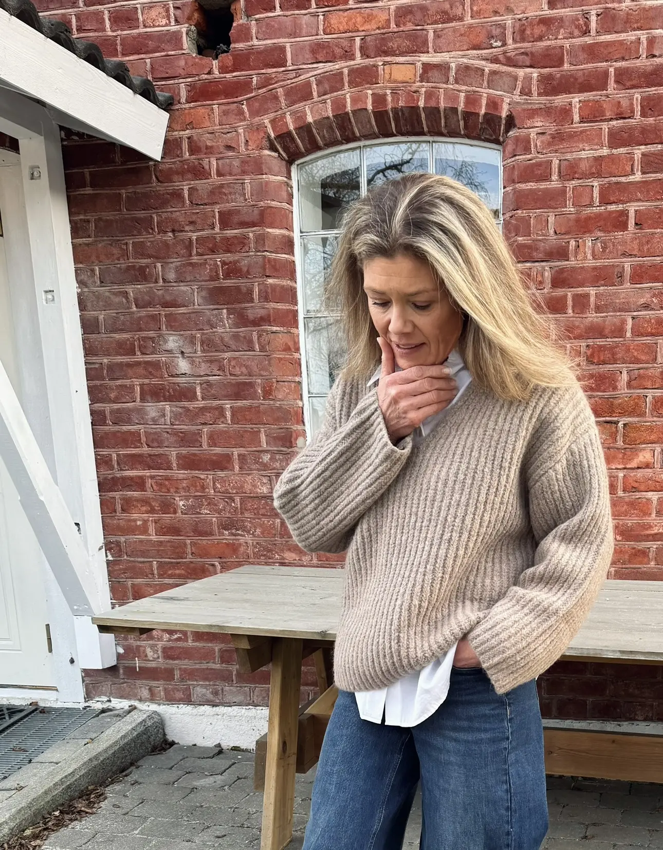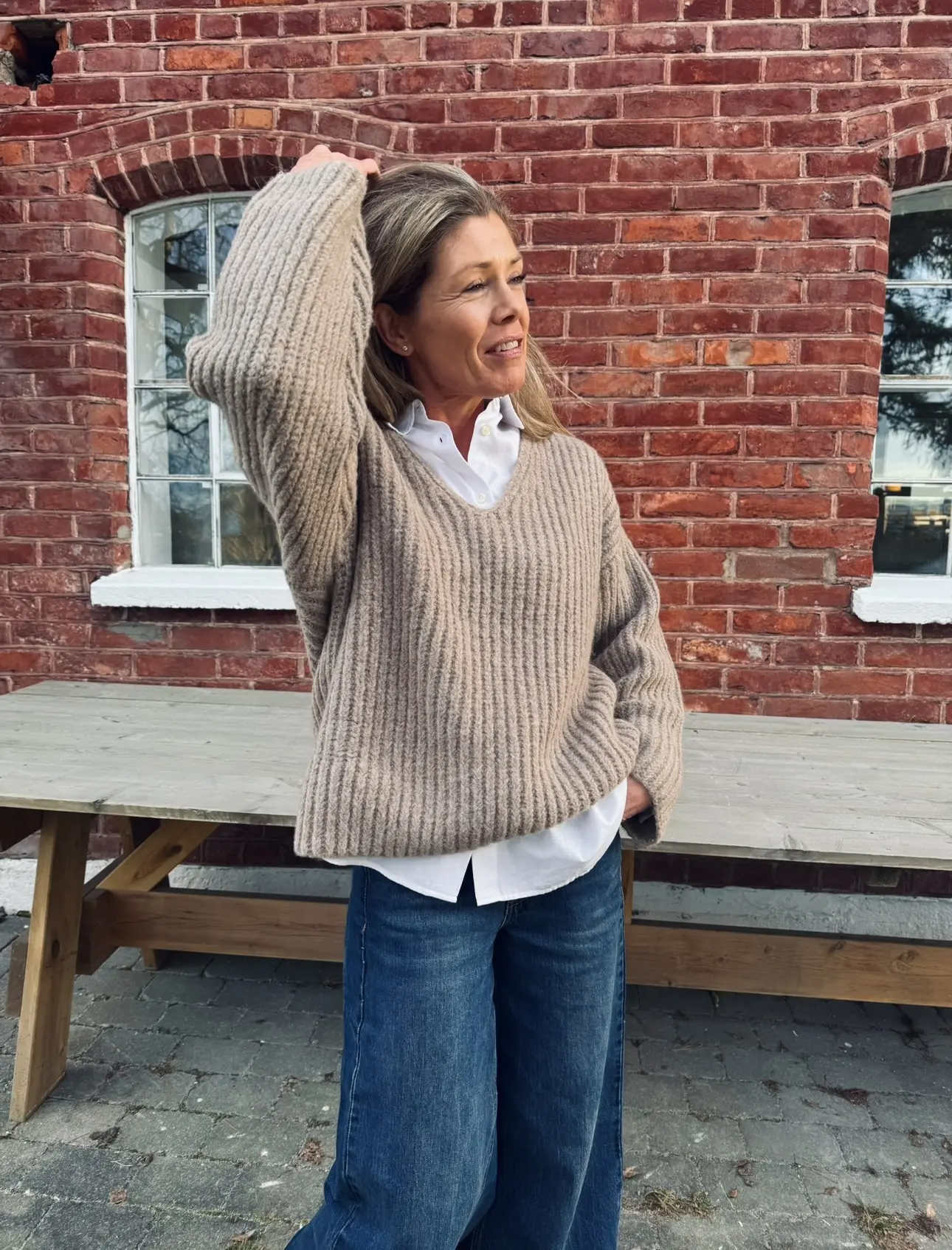 Ribbestrikket genser med dyp V-hals og lange ermer med dropped shoulders som gir en avslappet passform. Perfekt å style med klassiske dressbukser eller et par jeans for en mer uformell look. En tidløse favoritt!