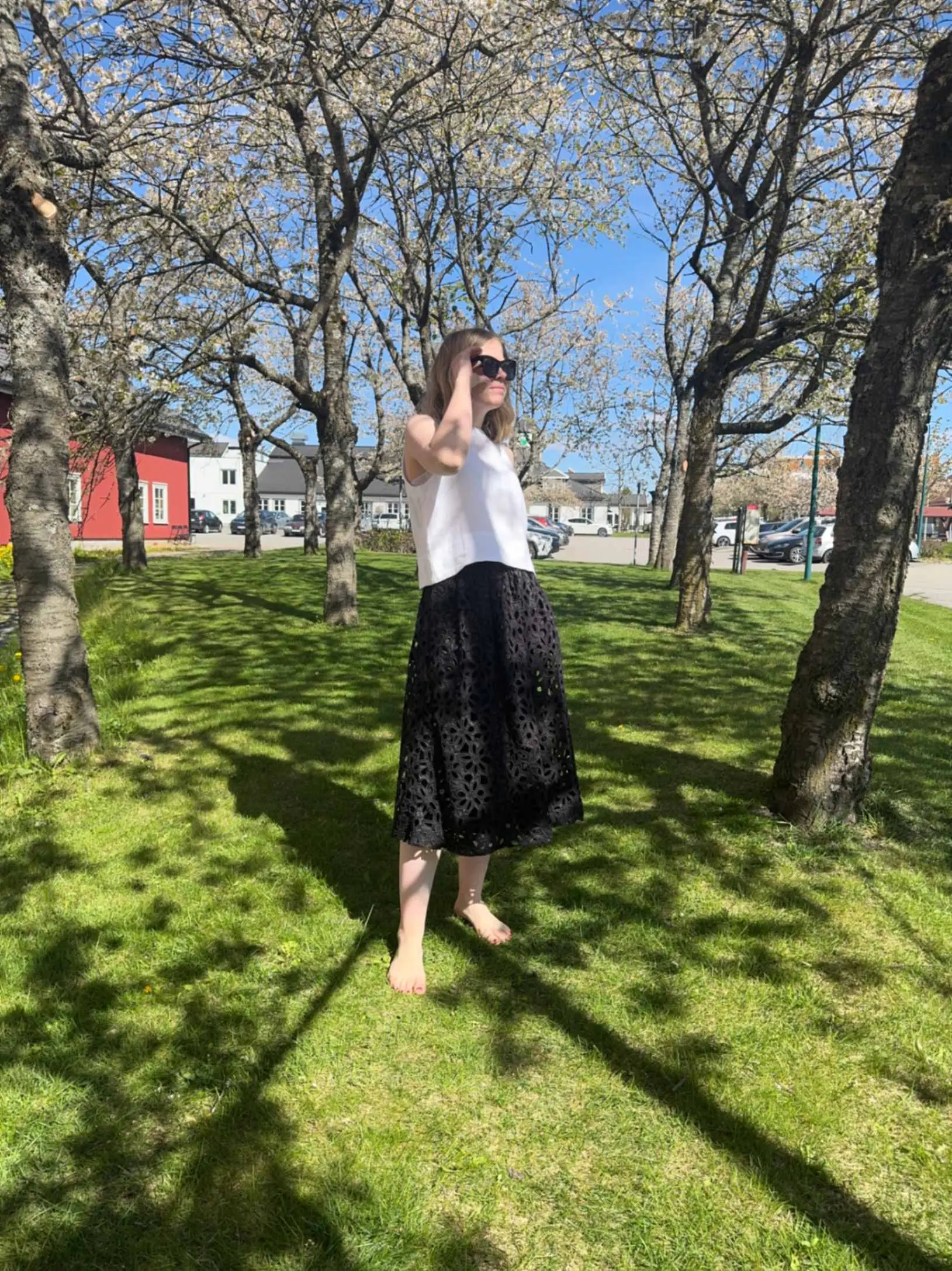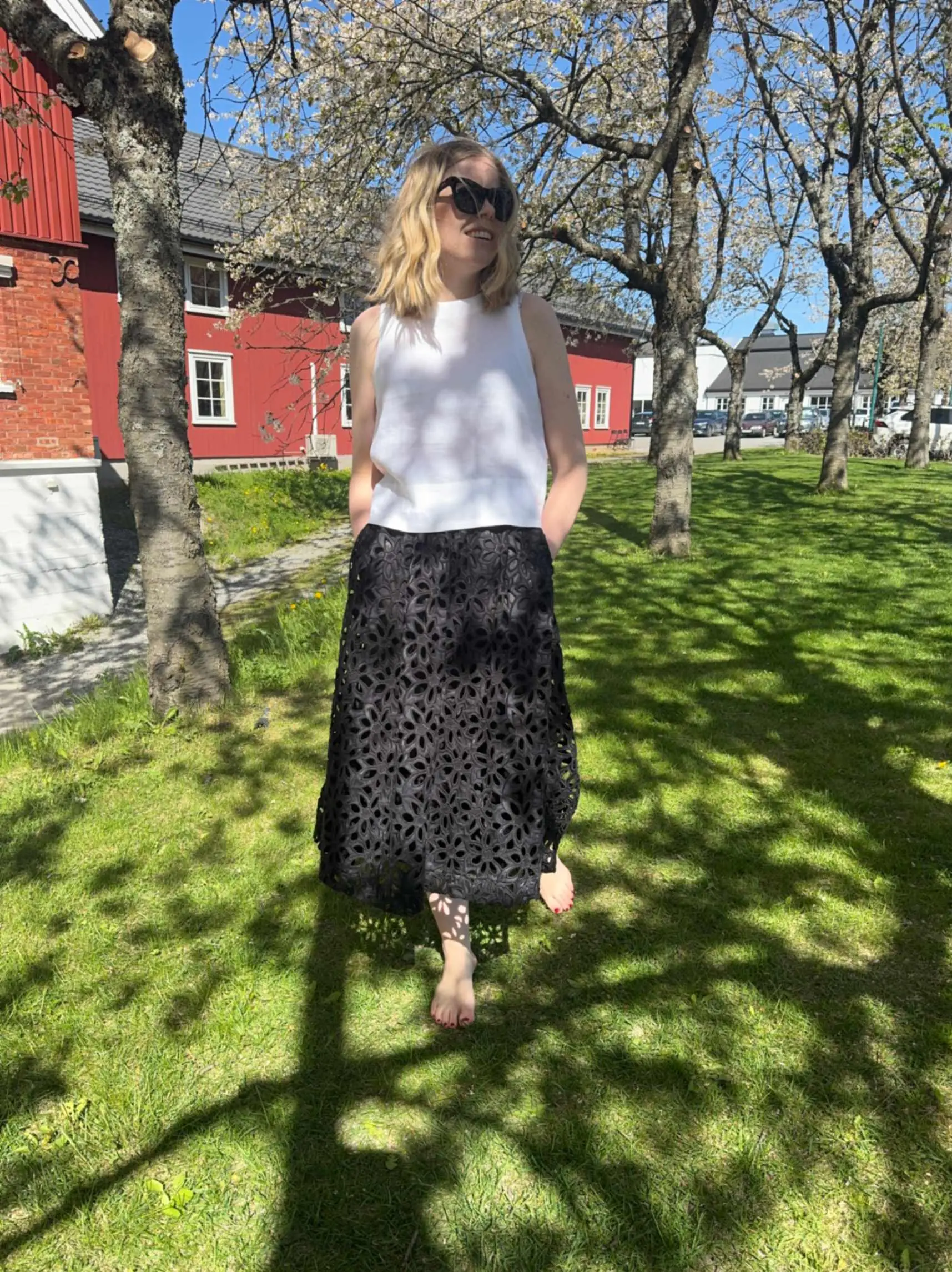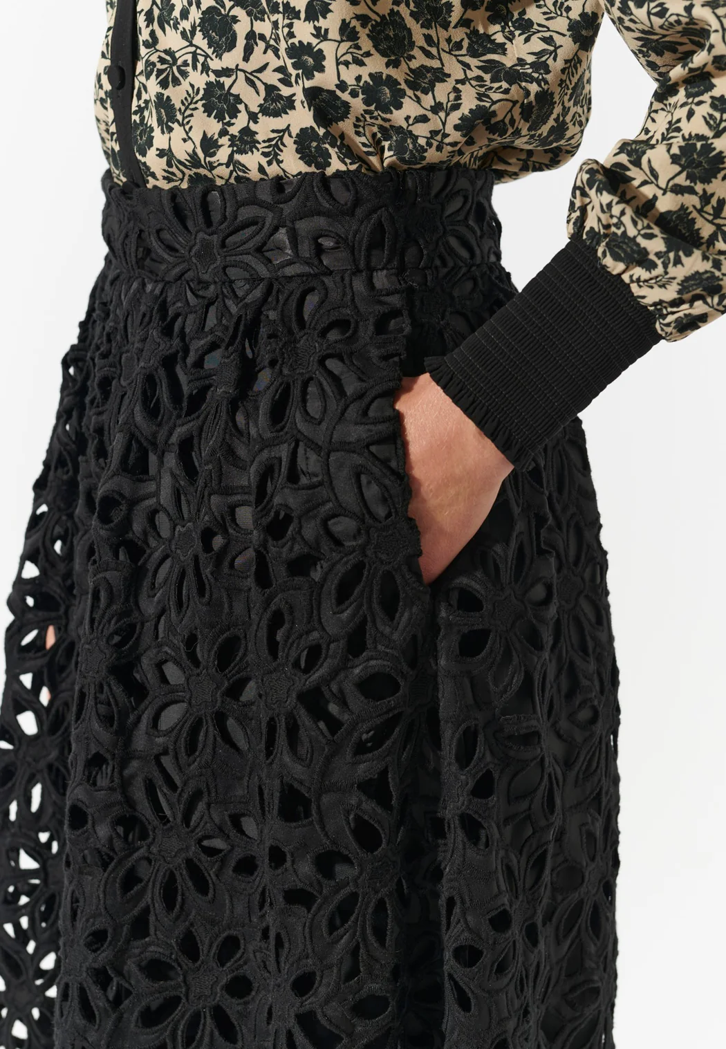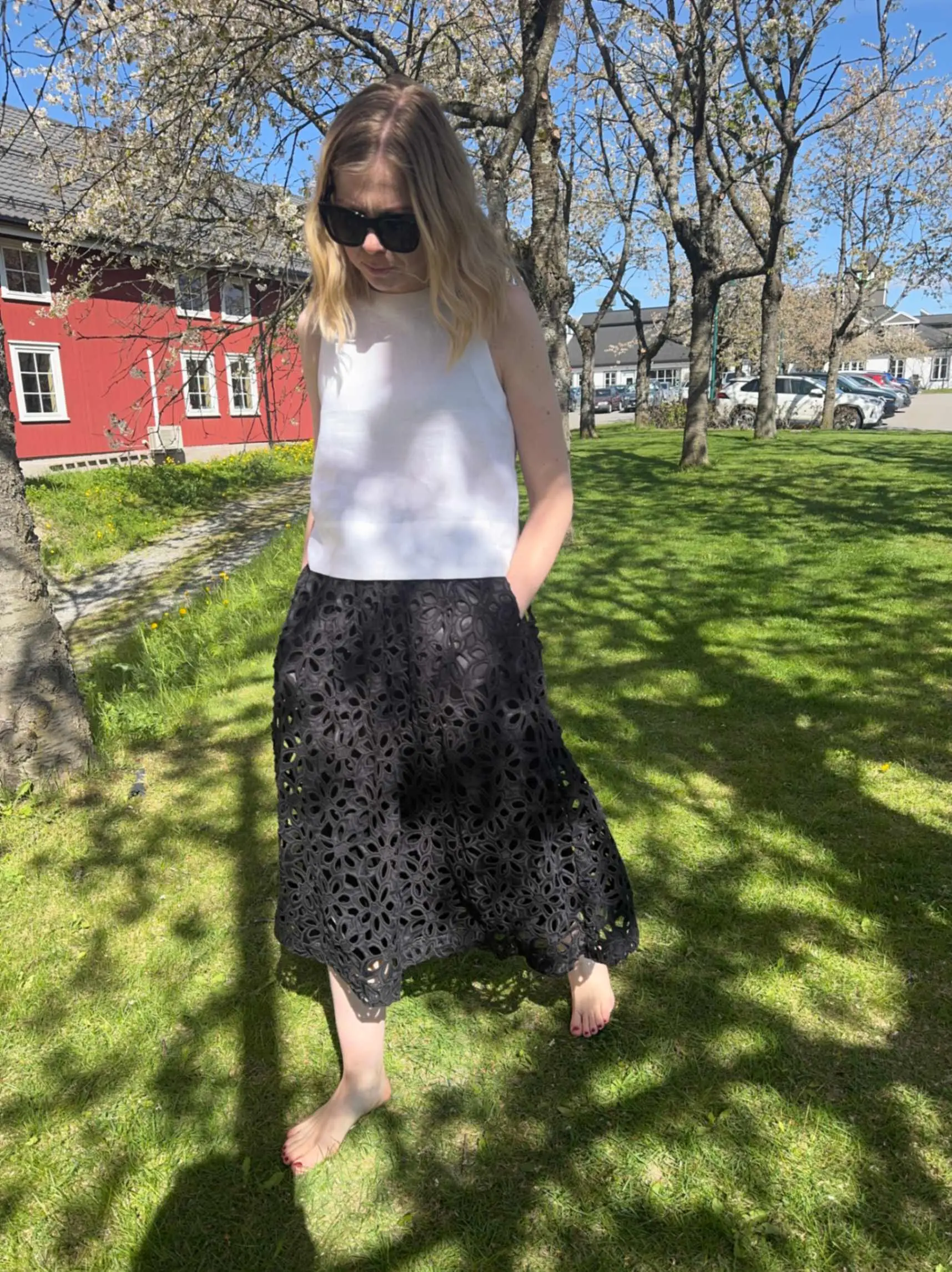 Dette elegante oversized skjørtet i svart Broderie Anglais kombinerer stil med komfort. Det er fullt fôret og har praktiske sidelommer, og faller til midt på leggen. Skjørtet kan styles vakkert med en blazer, skjorte eller det matchende bandeau-toppen for et komplett antrekk. Perfekt for festlige anledninger