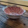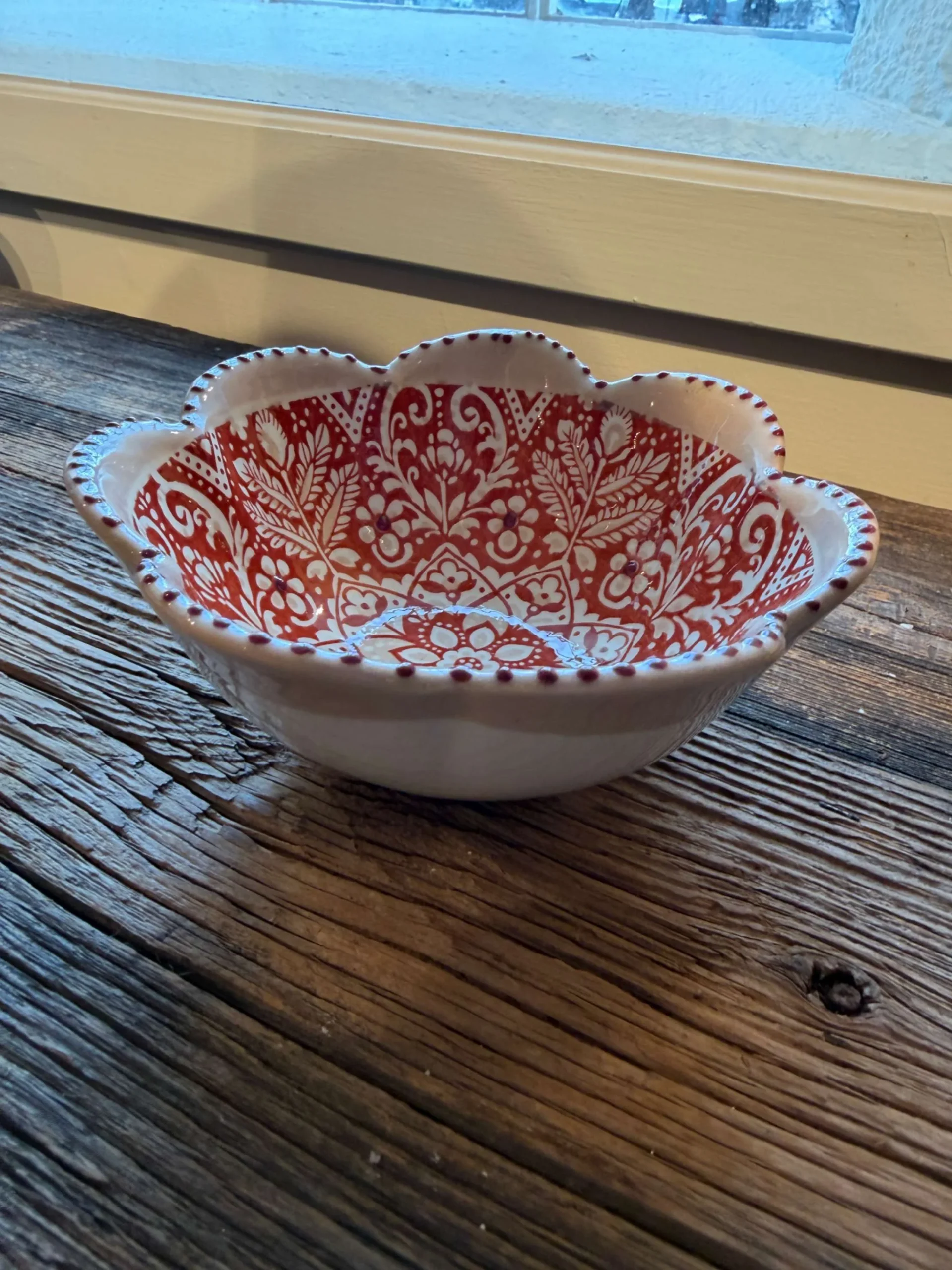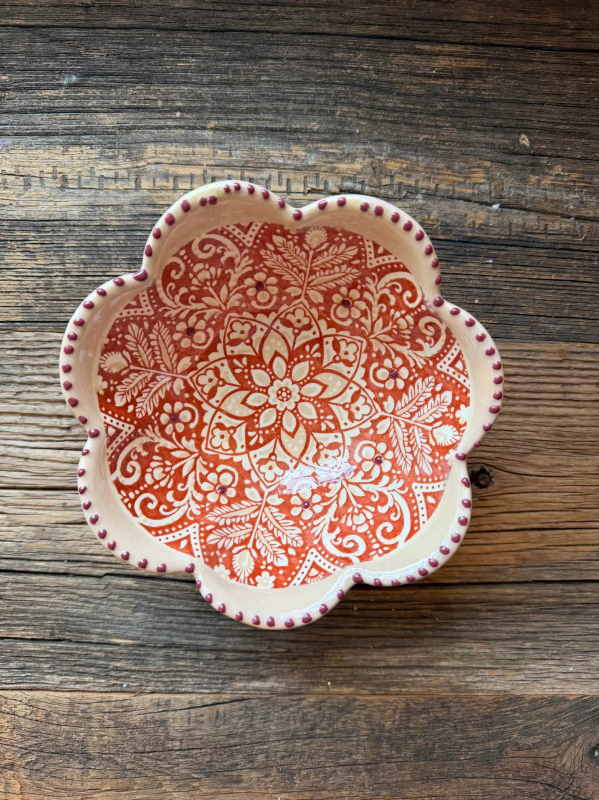 Denne vakre skålen fra Spliid er laget i håndlaget keramikk og har et unikt, dekorativt uttrykk. Den blomsterformede kanten med små håndmalte detaljer gir skålen et sjarmerende og levende preg, mens det fine mønsteret skaper et lunt utykk.