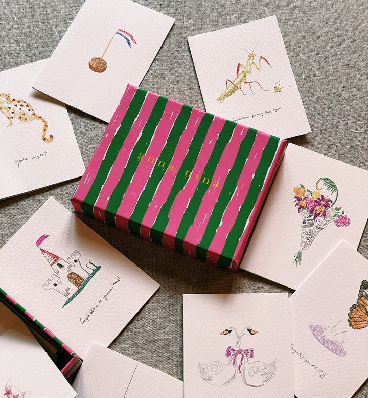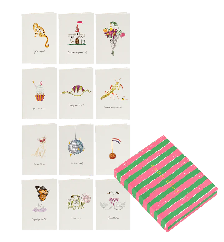 Anna + Nina assorterte gratulasjonskortsett har det perfekte utvalget av kort for så mange morsomme anledninger! Kommer i sett av 12 med fine konvolutter som også følger med. Kortene har en tom plass å fylle med vakre ord og historier. La venner og familie vite at du tenker på dem ved å sende dem et av disse vakre kortene.