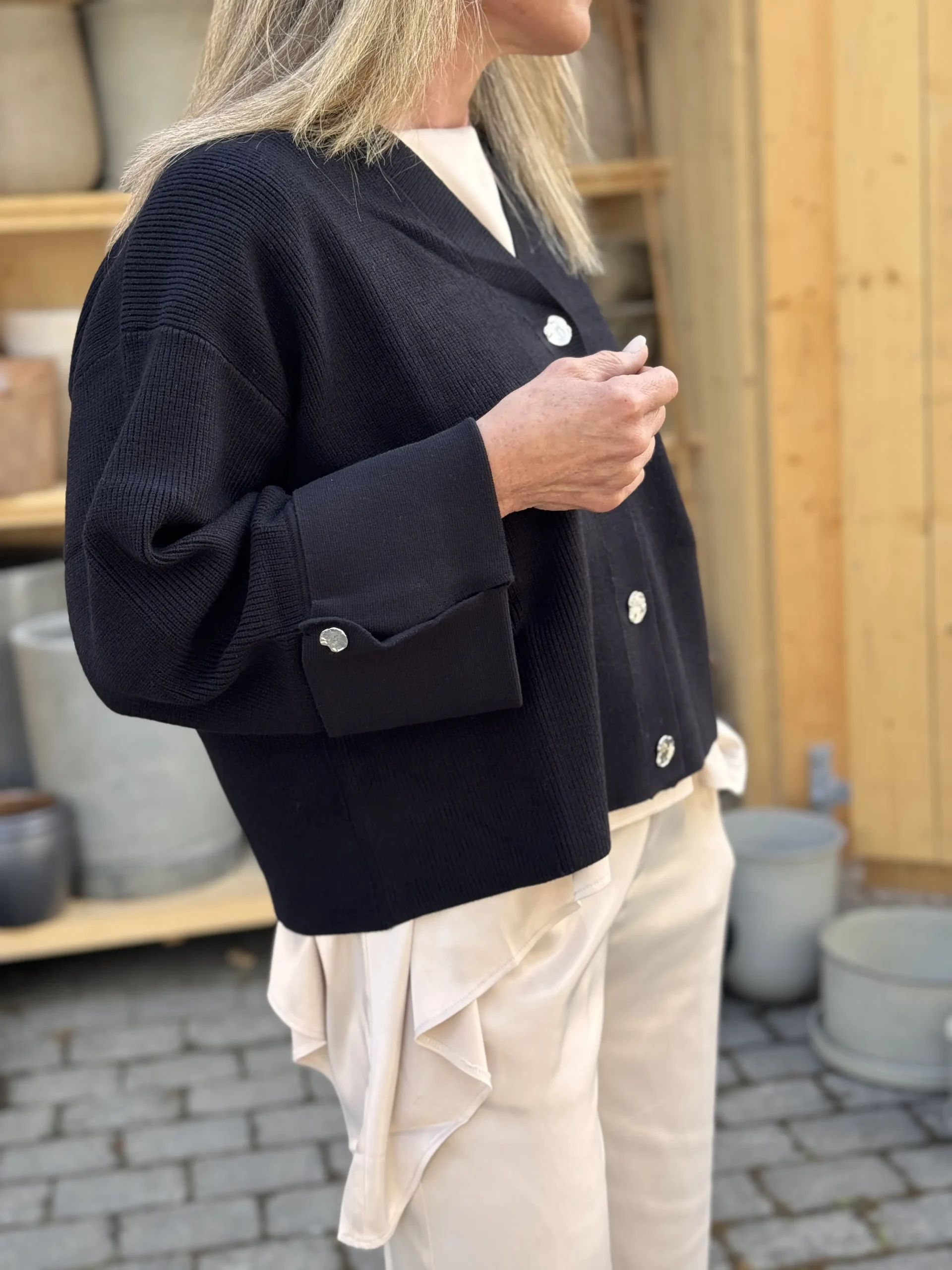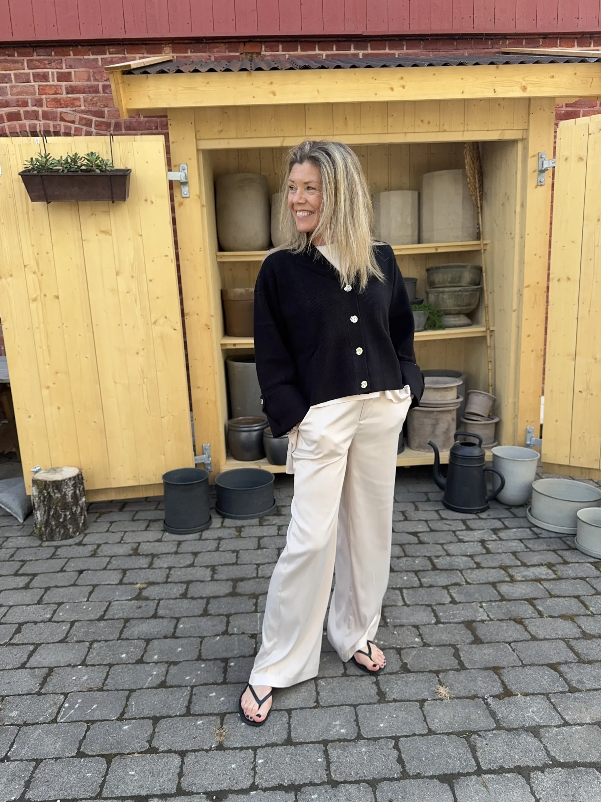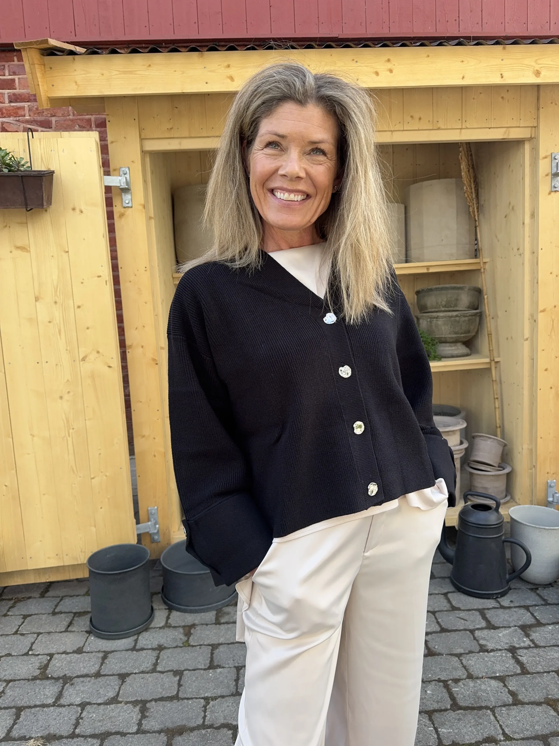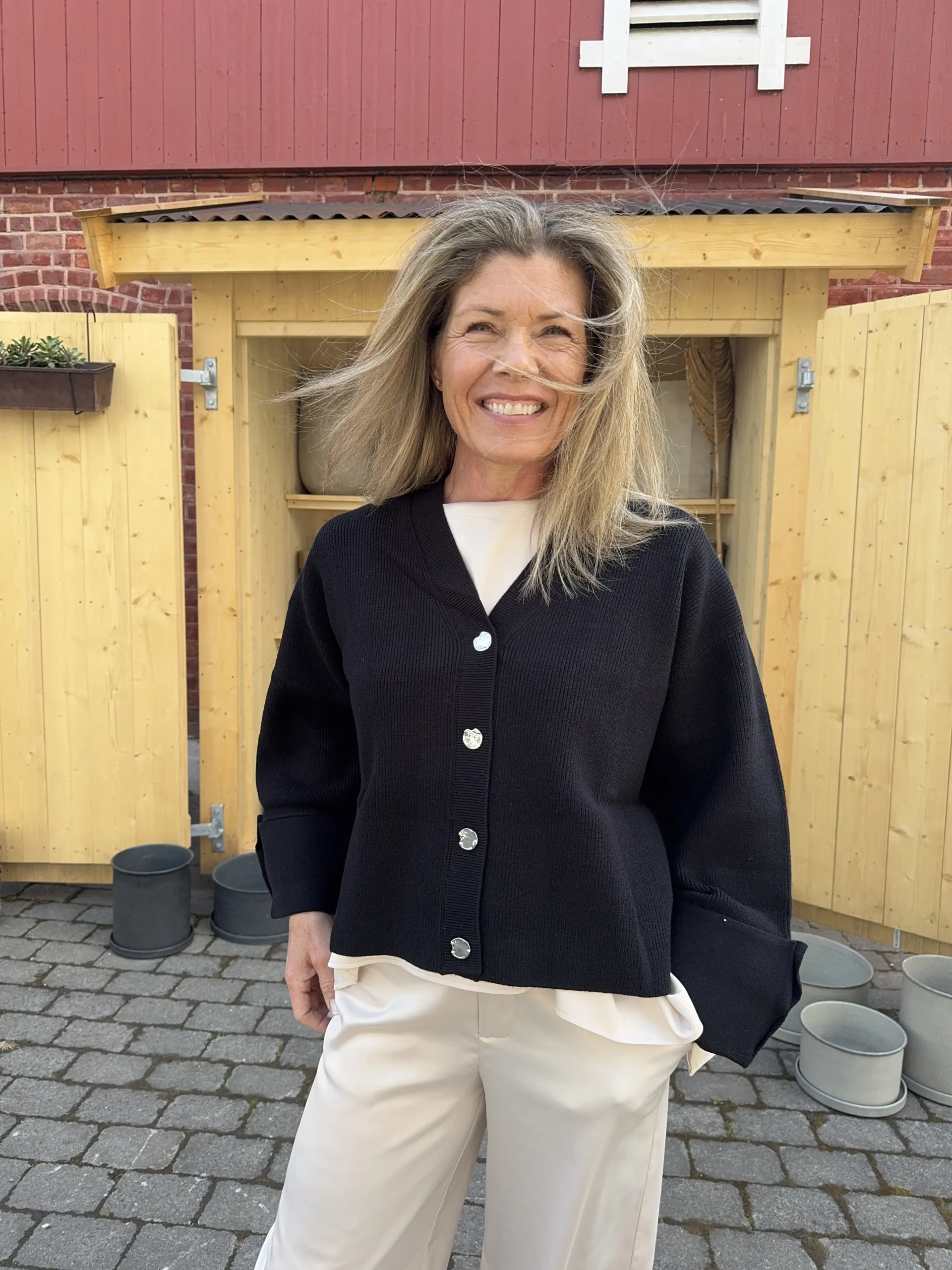 Tari Rib Cardigan i sort er en myk og luksuriøs cardigan i ribbestrikket viskoseblanding. Den har en avslappet, litt oversized passform med droppede skuldre, dekorative knapper og Iben-signaturmansjetter. Perfekt både alene og til lag-på-lag. Normal i størrelsen.