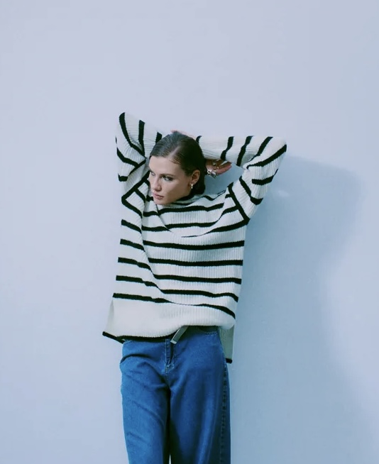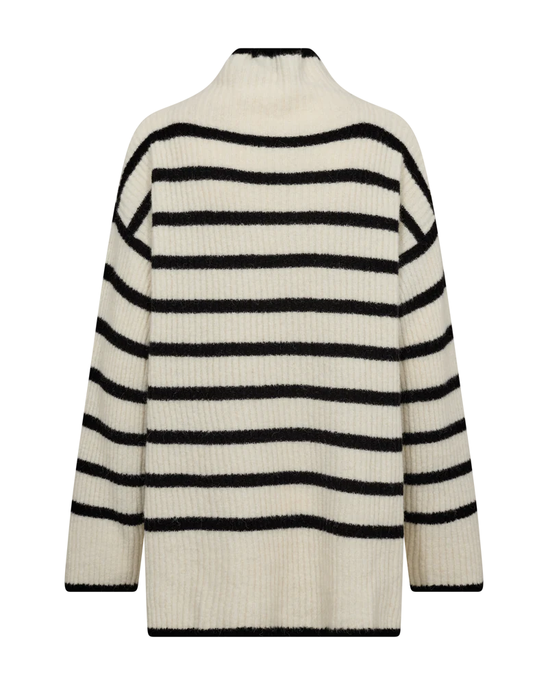 BIANCA er en lang, ribbestrikket genser med striper, høy hals og lange ermer med drop shoulders som gir en avslappet og uanstrengt passform. Den stilige ribbestrukturen og de strikkede detaljene gjør den både komfortabel og trendy – perfekt for en uformell look.