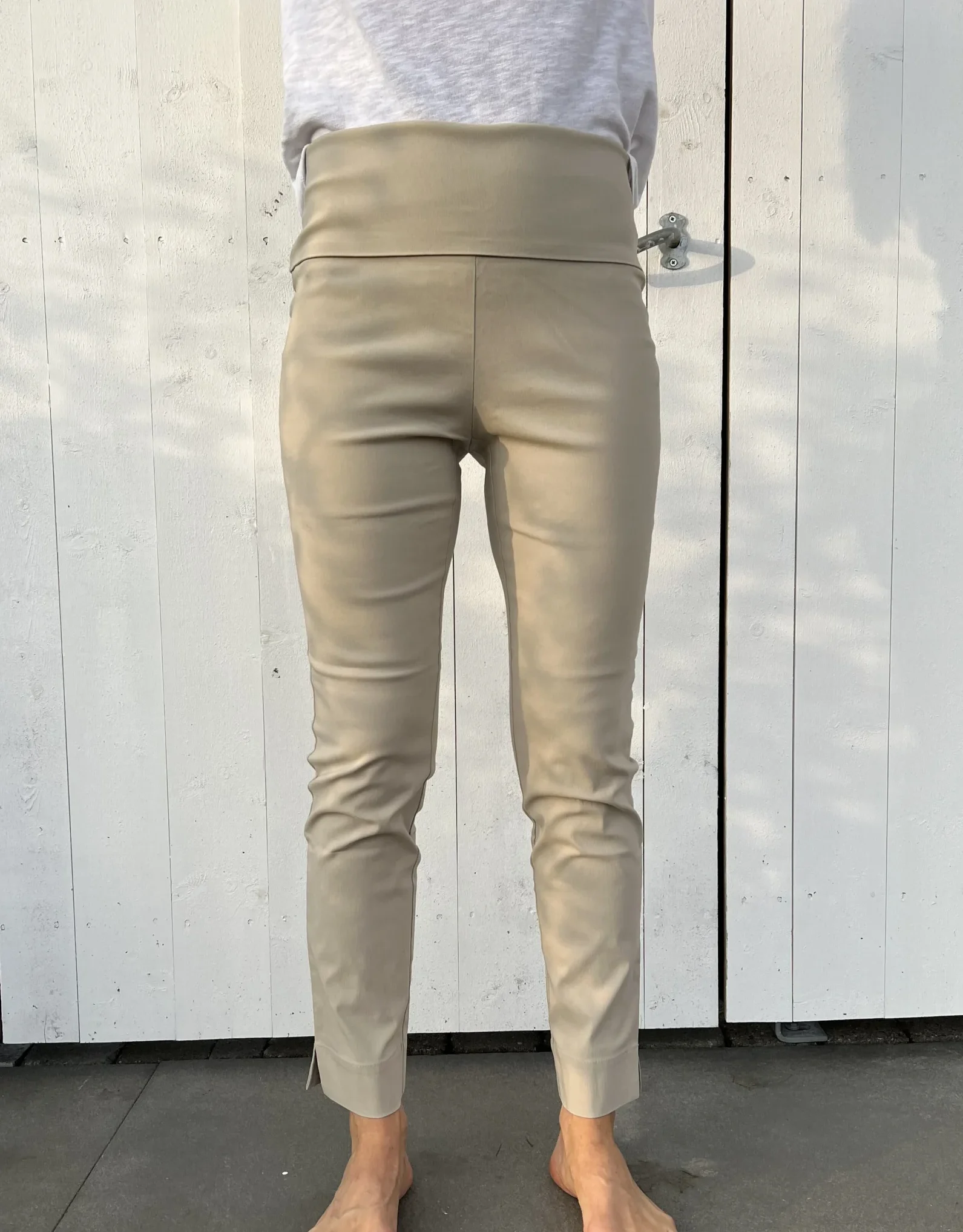 Vår populære basisbukse med tettsittende passform og stretch, som sikrer god bevegelsesfrihet. Buksens brede linning kan trekkes opp over magen eller brettes ned til normal midjehøyde. Denne effekten gjør den svært komfortabel å ha på seg. Det er en liten splitt nederst på buksebeinene.