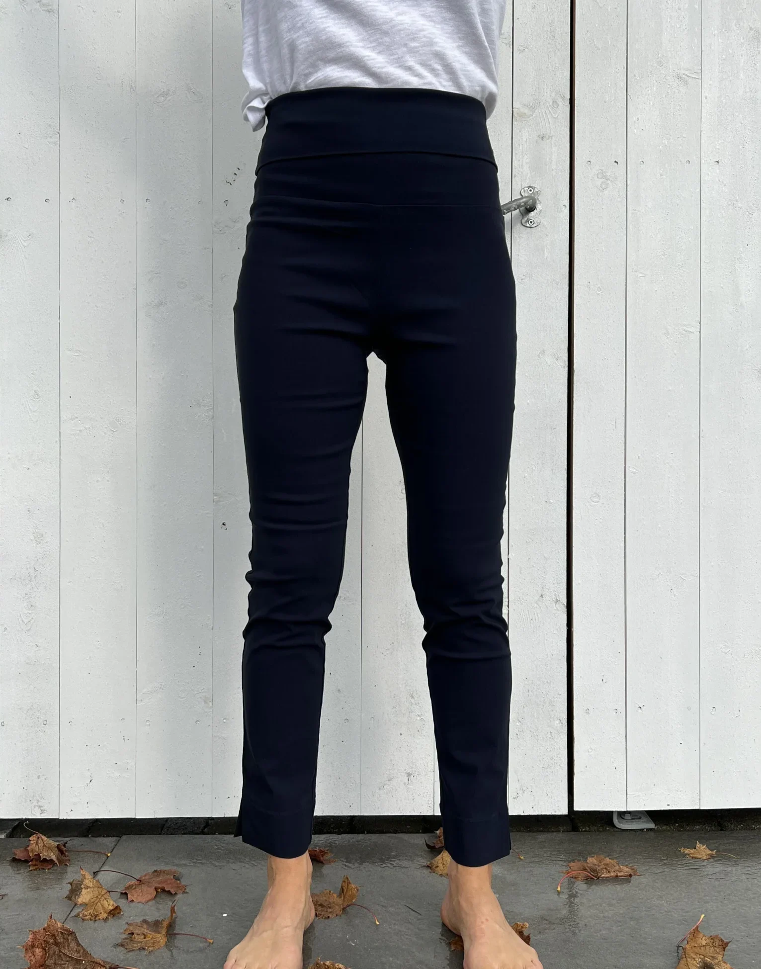 Vår populære basisbukse med tettsittende passform og stretch, som sikrer god bevegelsesfrihet. Buksens brede linning kan trekkes opp over magen eller brettes ned til normal midjehøyde. Denne effekten gjør den svært komfortabel å ha på seg. Det er en liten splitt nederst på buksebeinene.