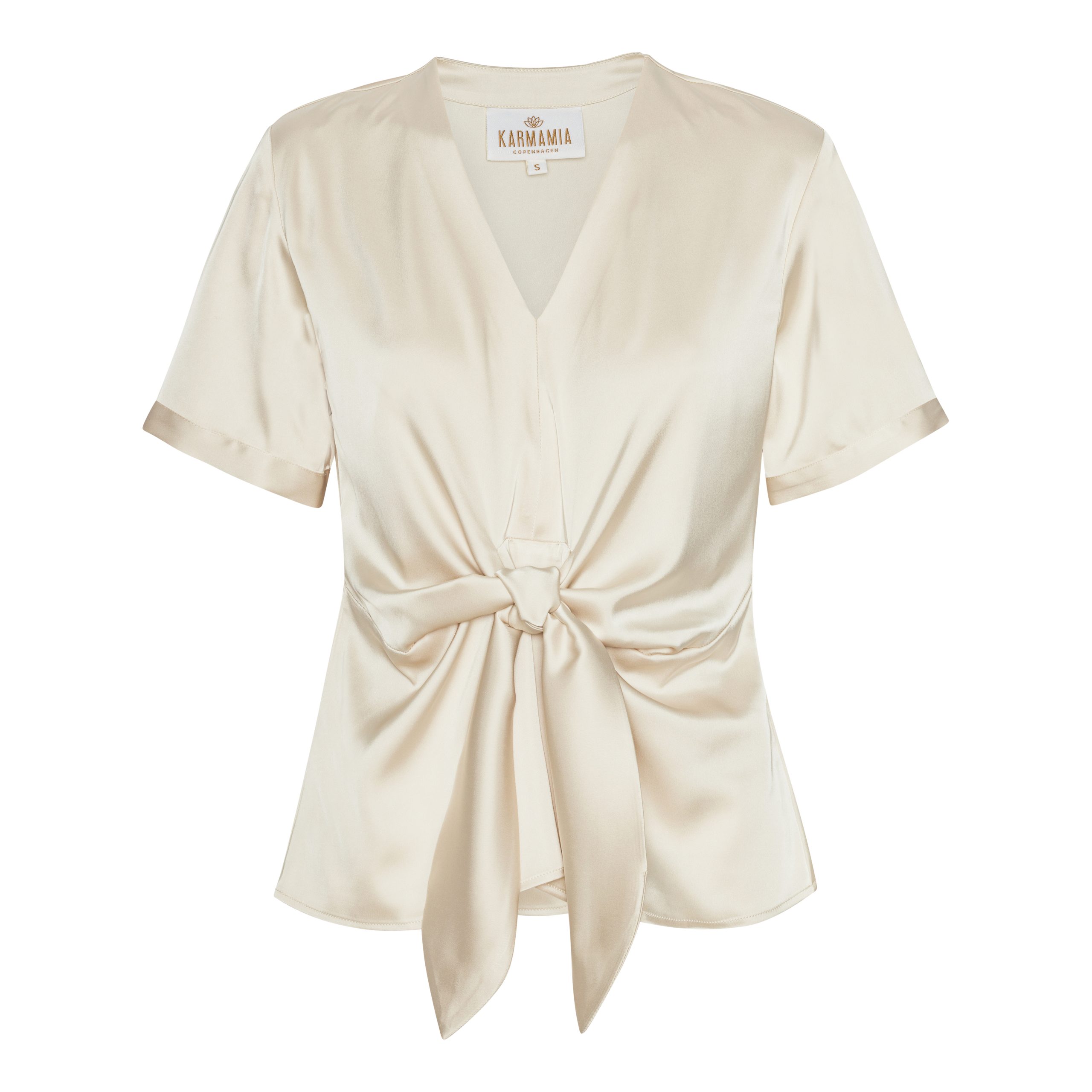 Elegant bluse i vår eksklusive Semi Rich-satin med kort erm, V-hals og knyting i livet. Lett glans og myk finish – perfekt til både hverdag og fest.