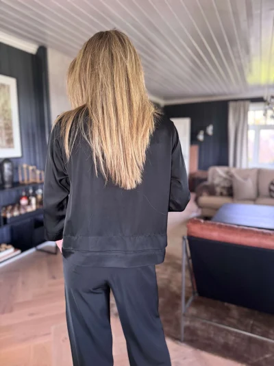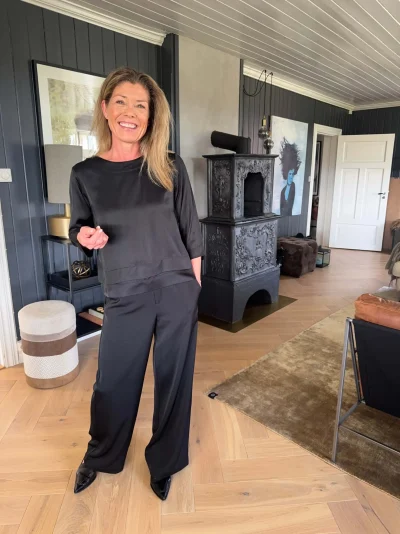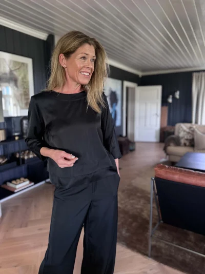 Klassisk, ekker sort bluse med rund hals fra Bitte kau Rand. Kobiner den med dressbukser eller jeans.