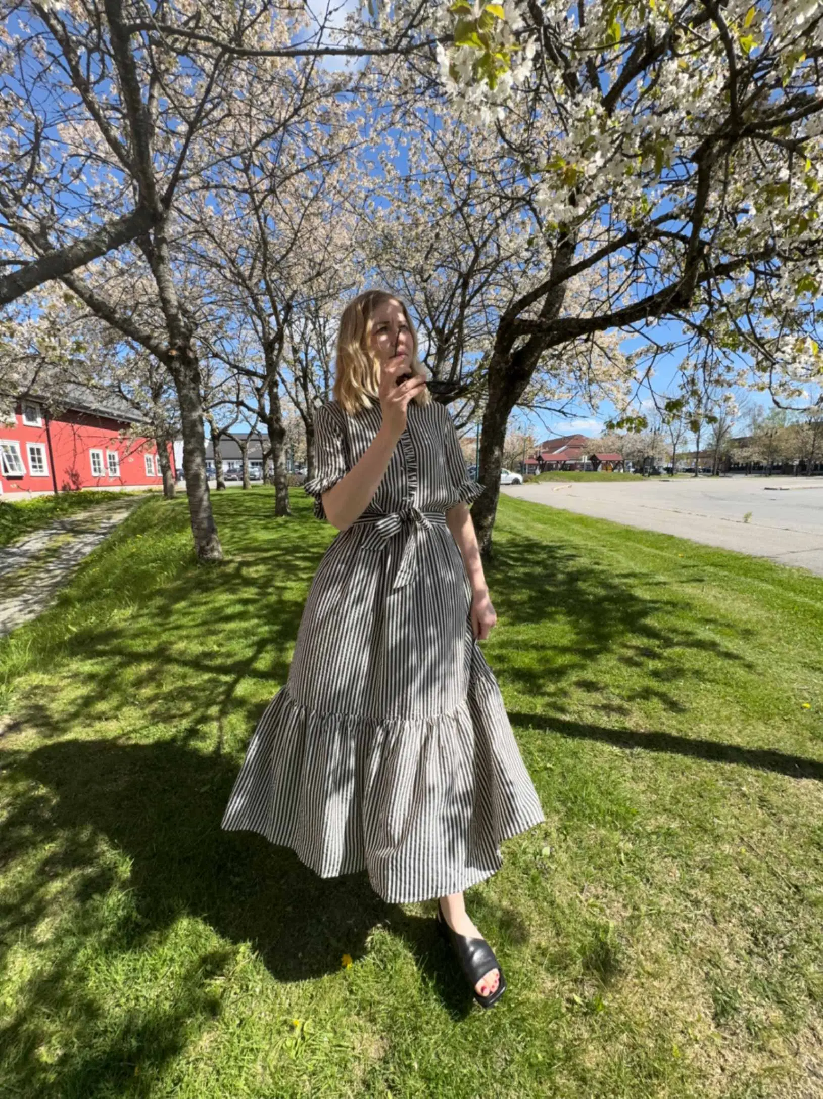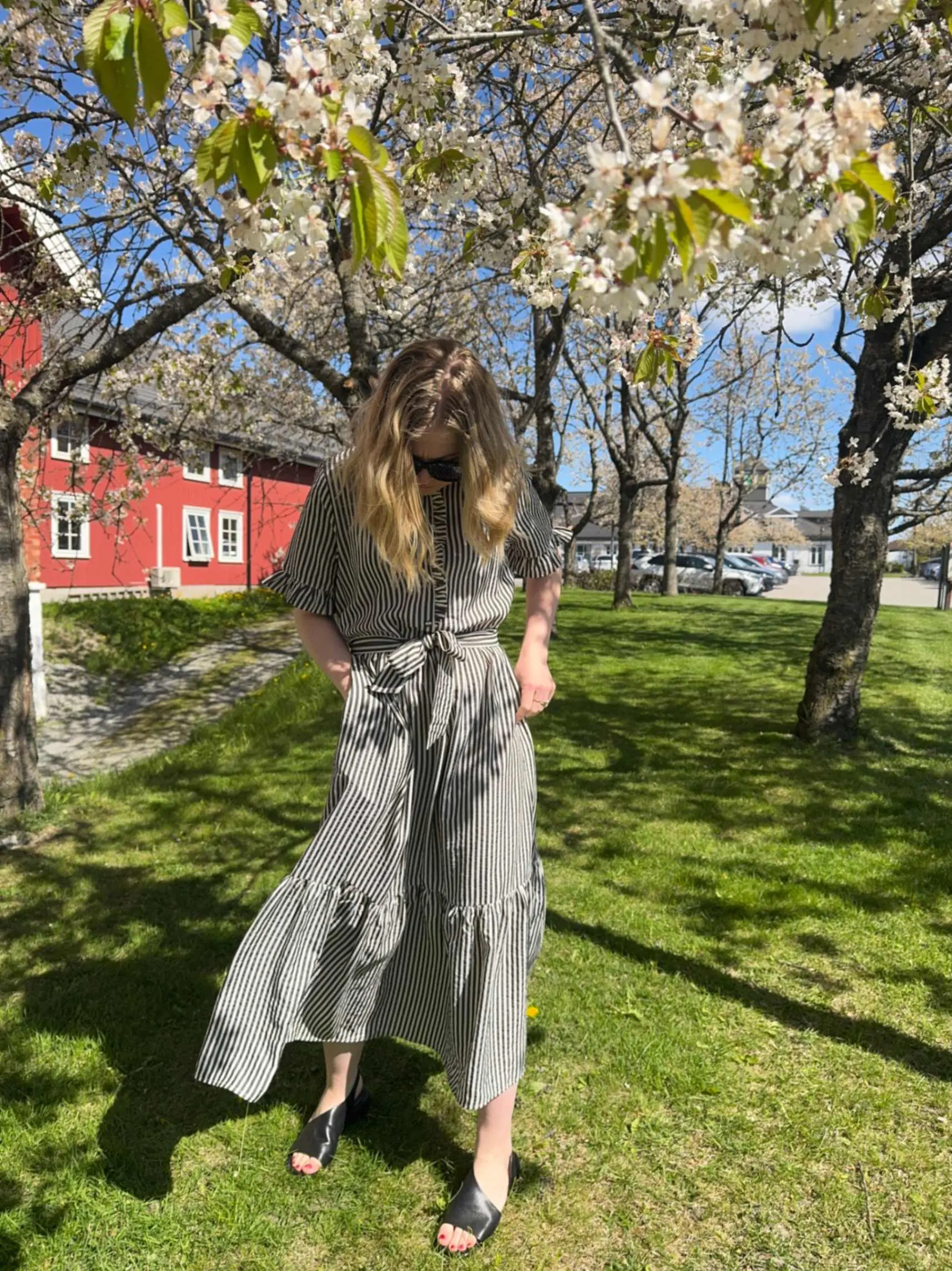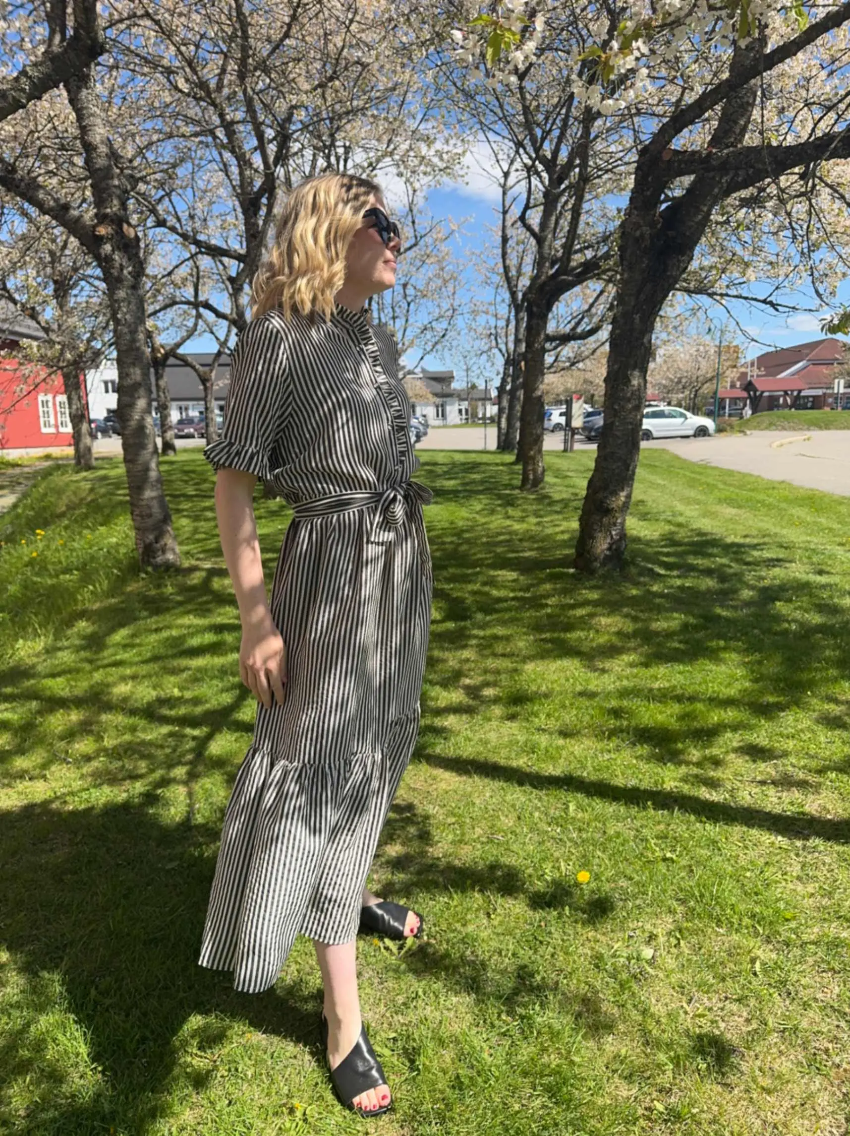 Elegant kjole med striper og fine rysjedetaljer langs knappestolpen. Knapper fra hals til liv og justerbar knyting i midjen gir en feminin og flatterende fasong.