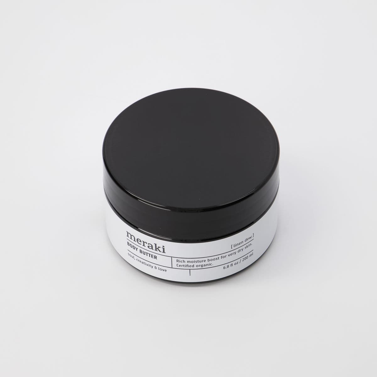 Hold huden myk og smidig med dette sertifiserte organiske body butter fra Meraki. Aloe vera, sheasmør og en rekke nærende oljer fra oliven, solsikke og mandler smelter sammen for å lindre tørr hud og tilsette fuktighet uten å føles fettete. Sertifisert økologisk av Ecocert Cosmos.