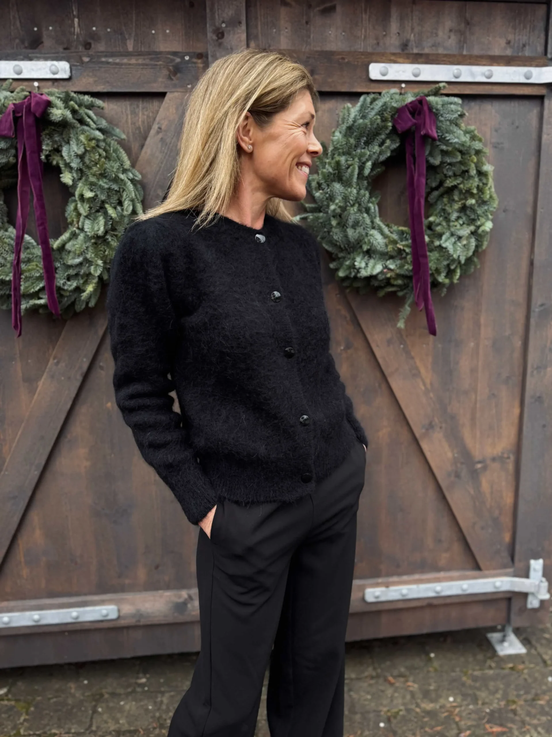 Elegant cardigan med lett puff i skuldrene og blanke sorte knapper. Myk, varm og behagelig – perfekt til hverdags, men også nydelig over en kjole.