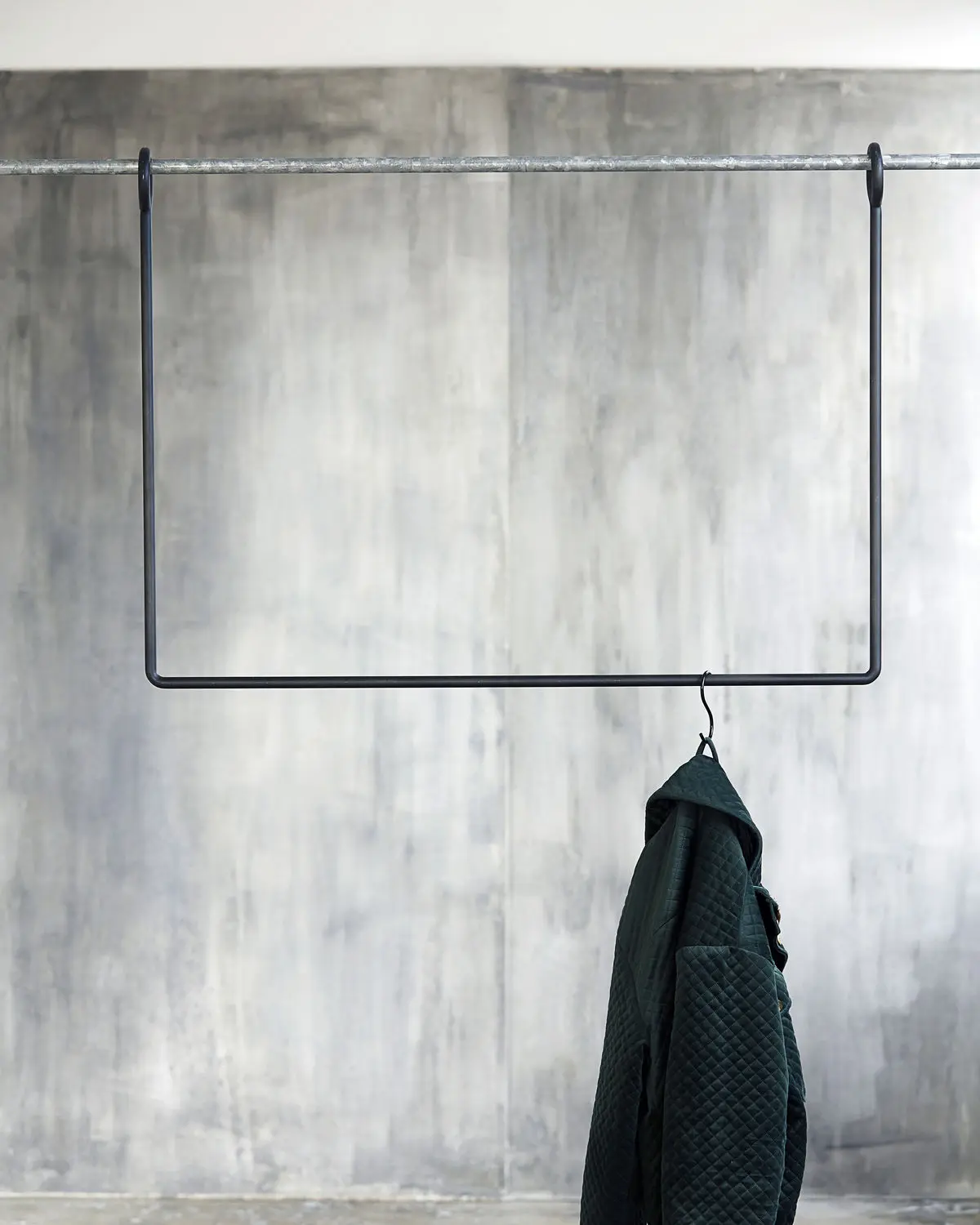 Enkel og diskré klesstativ fra House Doctor. Stativet er laget av sort jern, som klemmes inn mellom to kroker i veggen. Enkel og elegant oppbevaringsløsning for yttertøy eller andre klær.