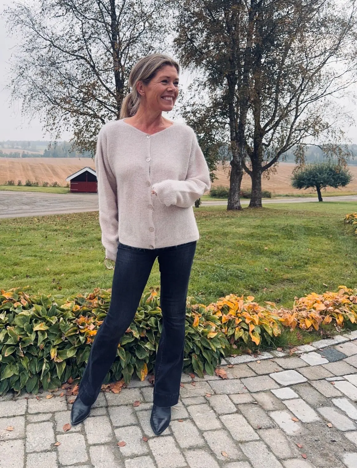 Daisy Cardigan er fantastisk deilig med myk miks av alpakka og ull. Denne cardiganen er perfekt for enhver anledning med sin rette, kortere fasong og elegante knapper hele veien i front. Laget i ribbestrikket materiale som gir et tidløst uttrykk. Bruk den over en sommerkjole for sene sommerkvelder, eller kombiner den med skinnbukser for et chic høstantrekk. En garderobefavoritt du vil elske året rundt!