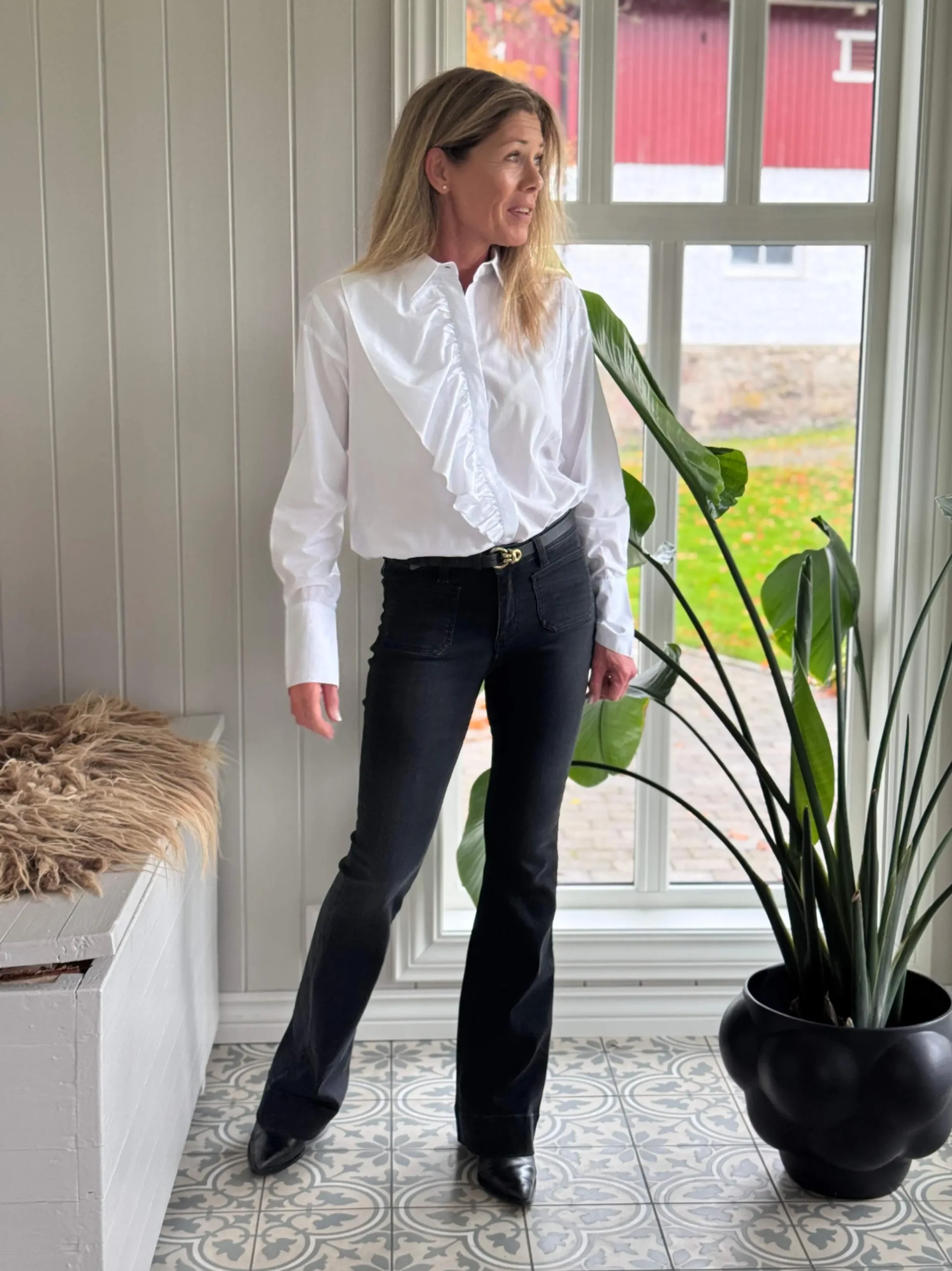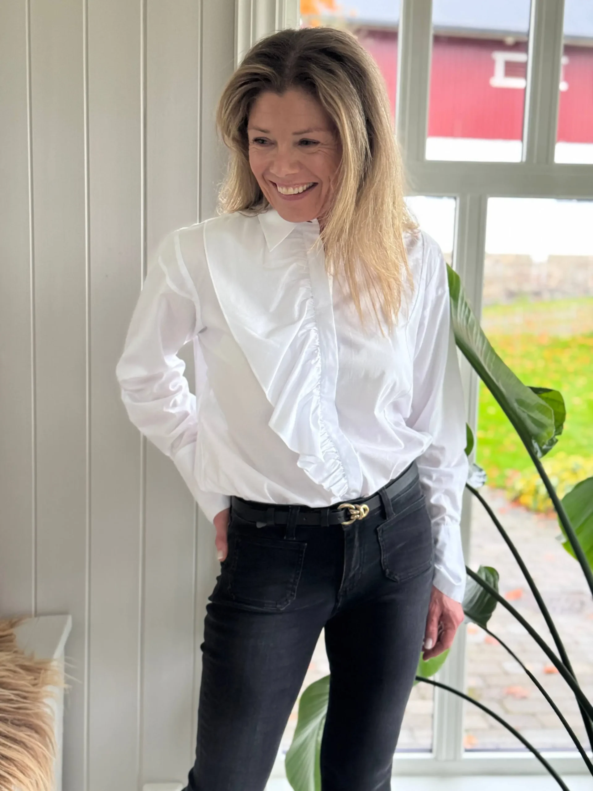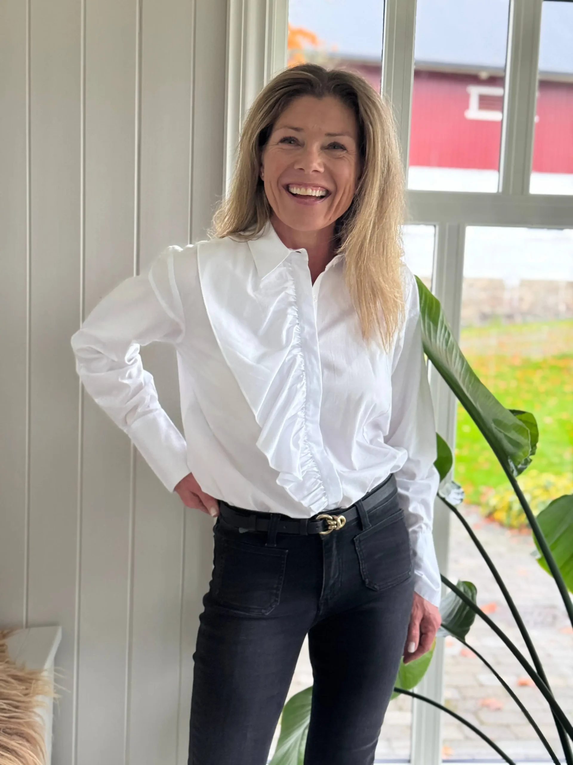 Hvit skjorte fra Karmamia med elegant ruffle-detalj på én side. Klassisk krage, knappelukking og lange ermer – en stilren og feminin favoritt til både jobb og fest.