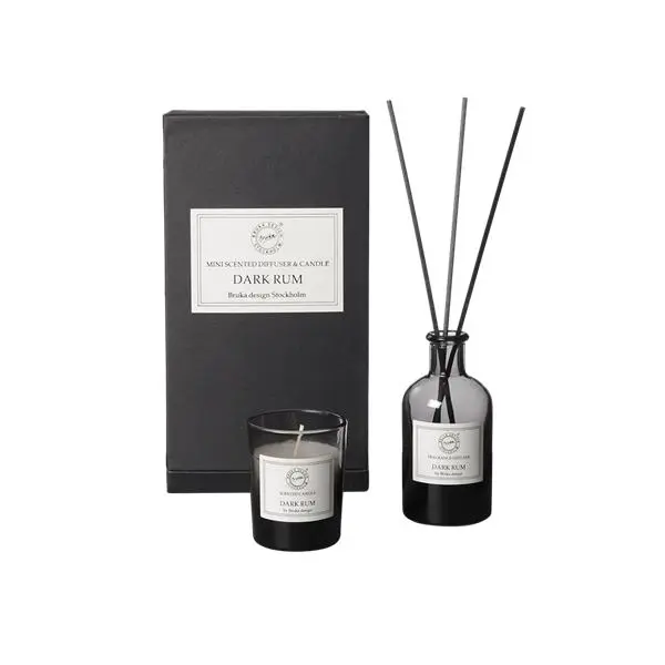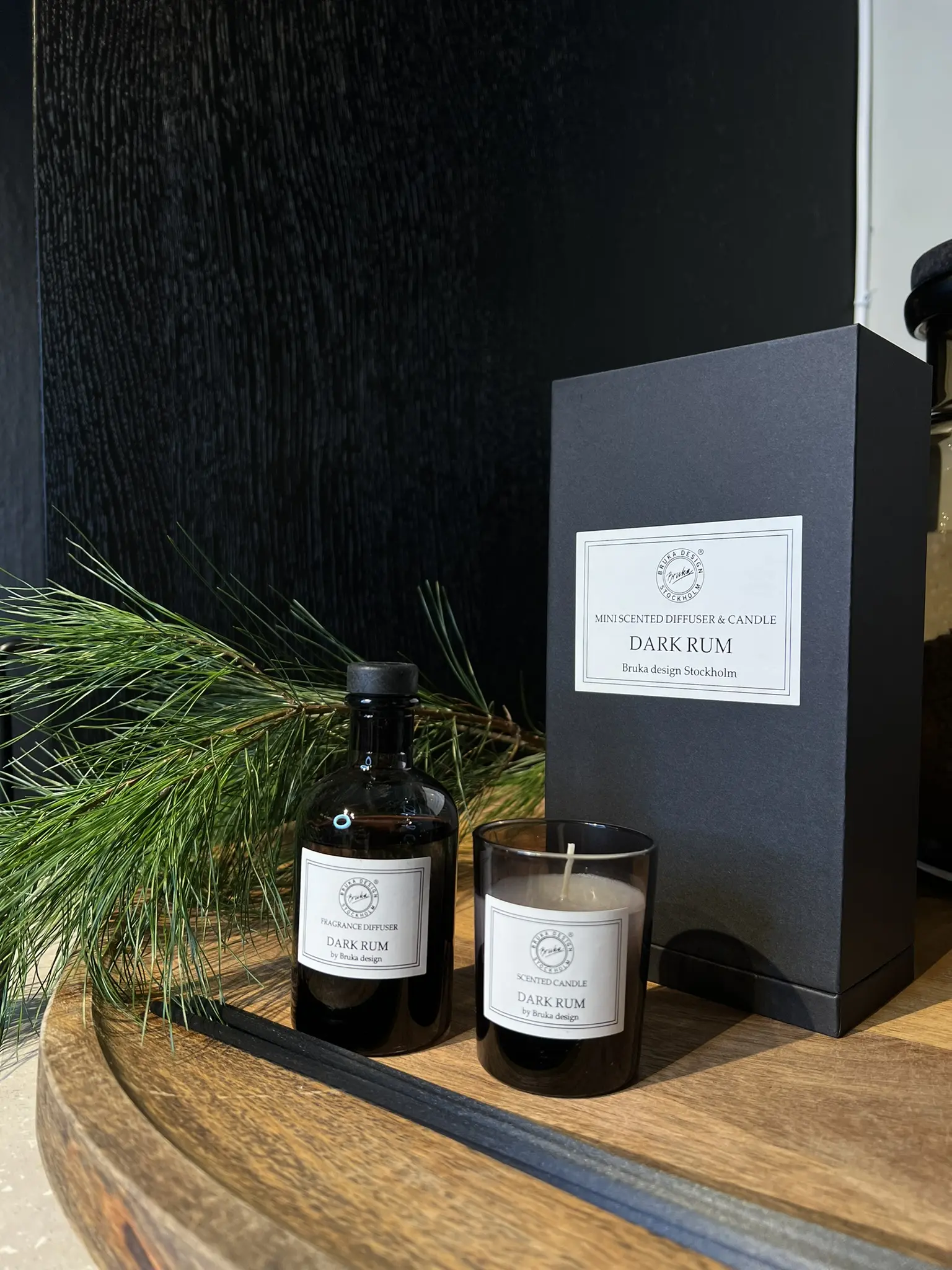 Lekkert gavesett med svart dark rum duftlys og pinner i mini versjon.