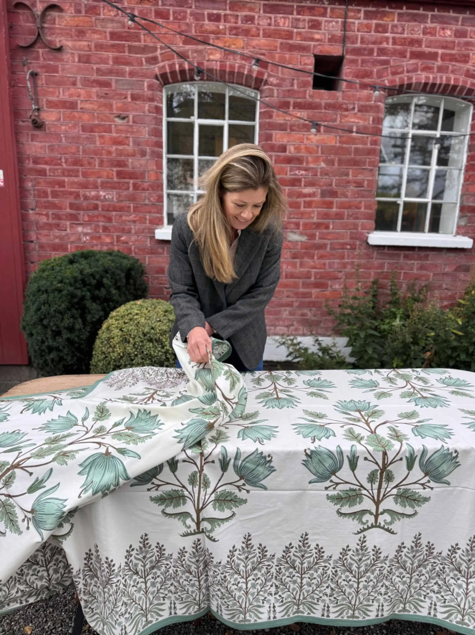 Nydelig duk med håndlaget blokktrykk i grønne toner, laget i 100 % bomull. Hver duk fra Bungalow er unik – små variasjoner i farge og mønster er en naturlig og sjarmerende del av det håndlagde uttrykket. En vakker detalj som skaper glede i hjemmet.