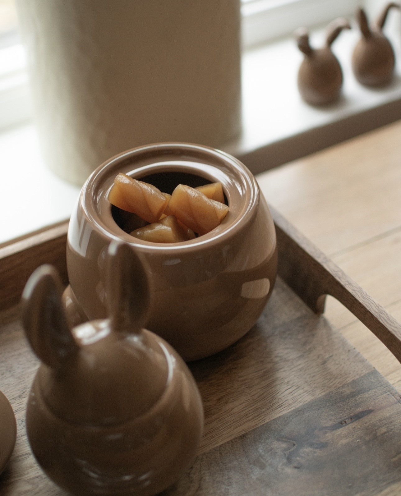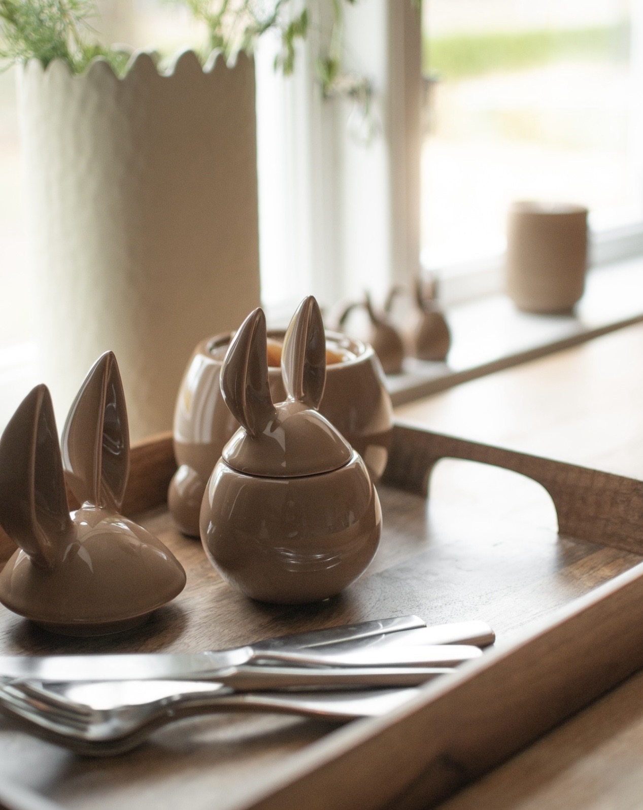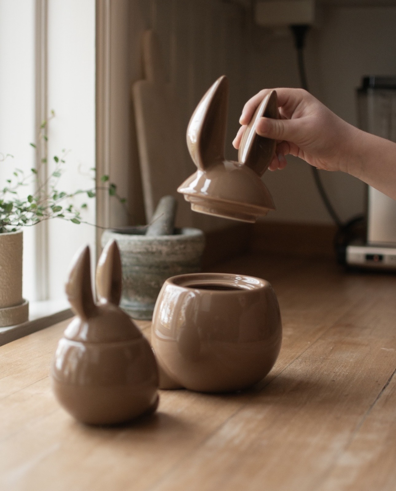 Krukke formet som en hare fra DBKD, laget i keramikk med et stilrent og lekent design. Det morsomme lokket gjør den perfekt til påske, samtidig som den fungerer som en dekorativ og praktisk oppbevaringsløsning. Kombiner gjerne krukken med andre påskedekorasjoner fra DBKD for en komplett påskestemning.