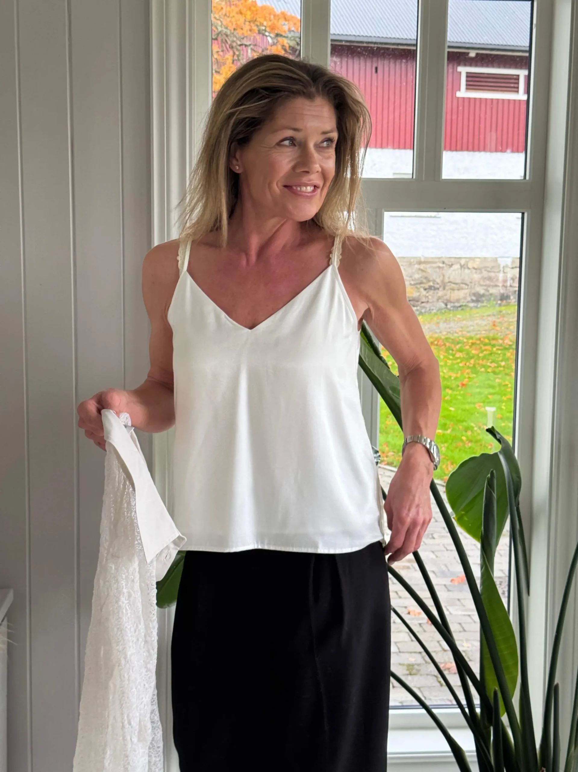 Estelle Singlet i snow white fra My Essential Wardrobe – myk, behagelig og tidløs. Laget av pustende viskose- og polyesterblanding, perfekt alene eller som lag under andre plagg. Enkel, klassisk og allsidig.