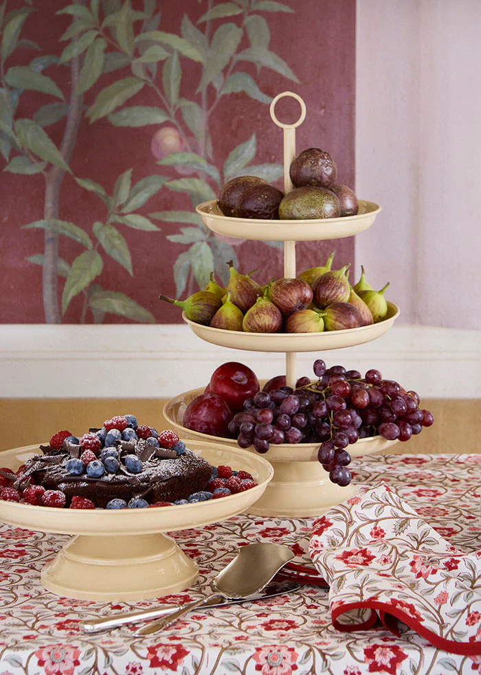 Treetasjet metallstativ med kremfarget emaljeoverflate. Perfekt for å servere delikate bakverk, snacks eller frukt.