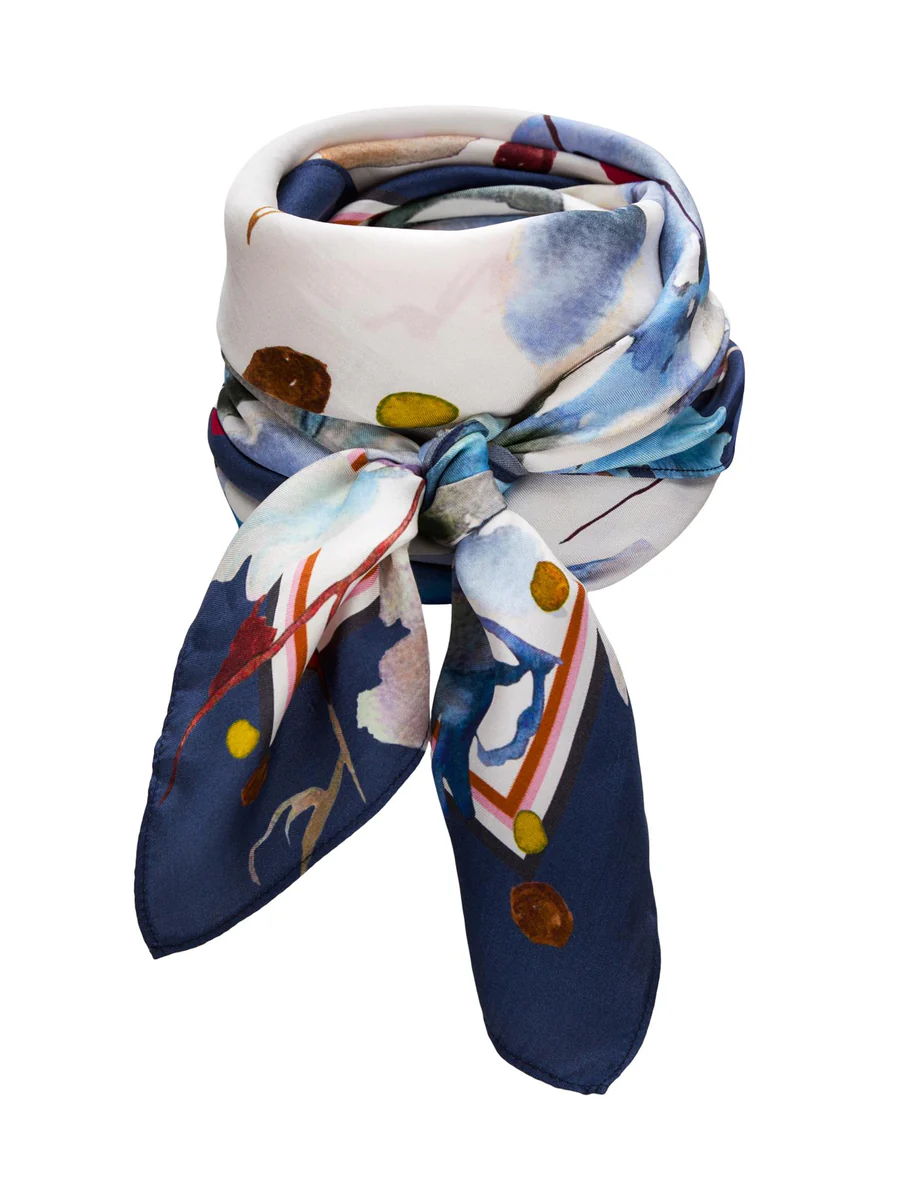 Pent skjerf med friske farger i 100% silke fra Katrin Uri. Fullfør antrekket ditt med det lille ekstra. Bruk det rund halsen, i håret, på vesken… mulighetene er mange.