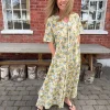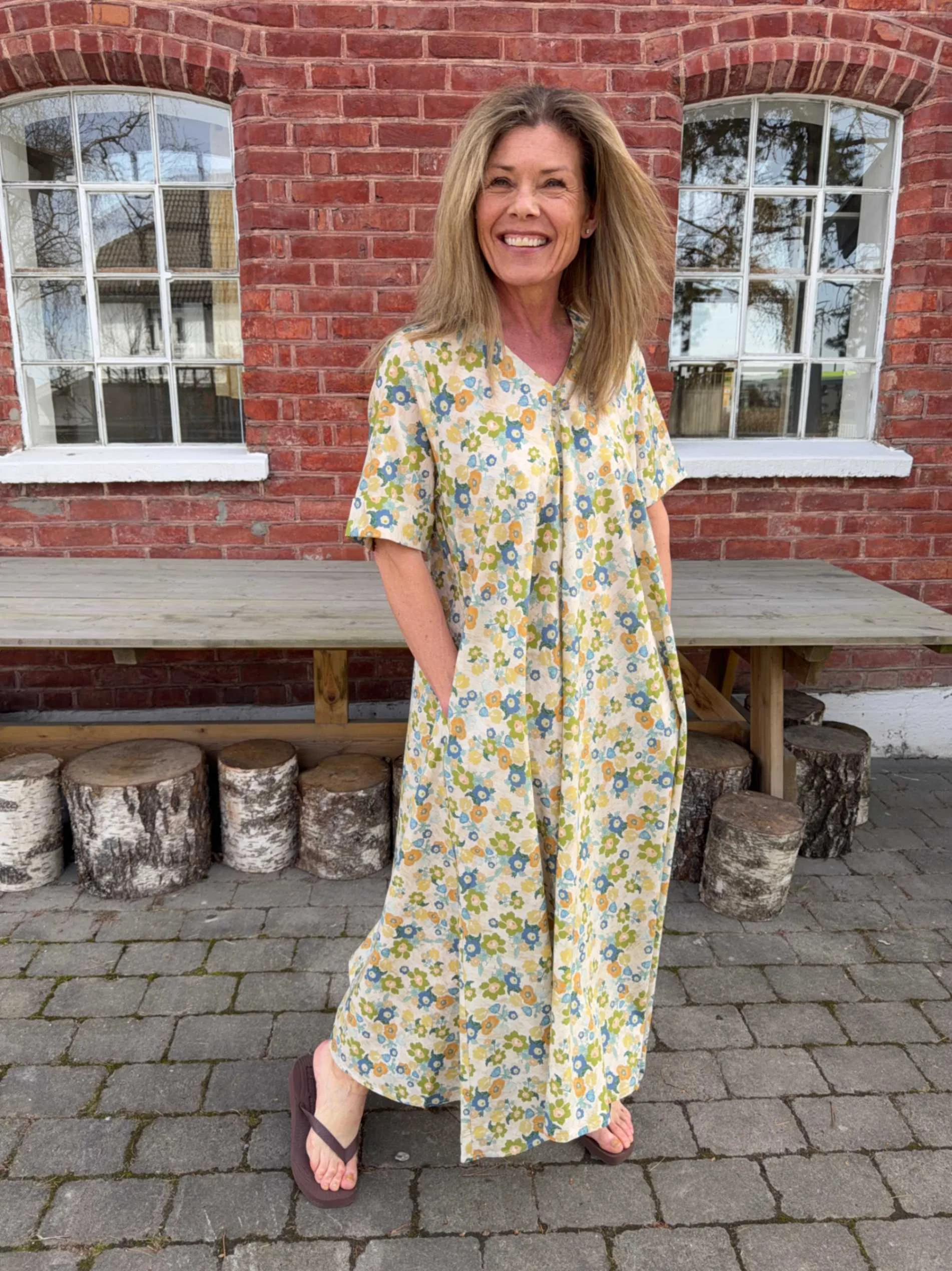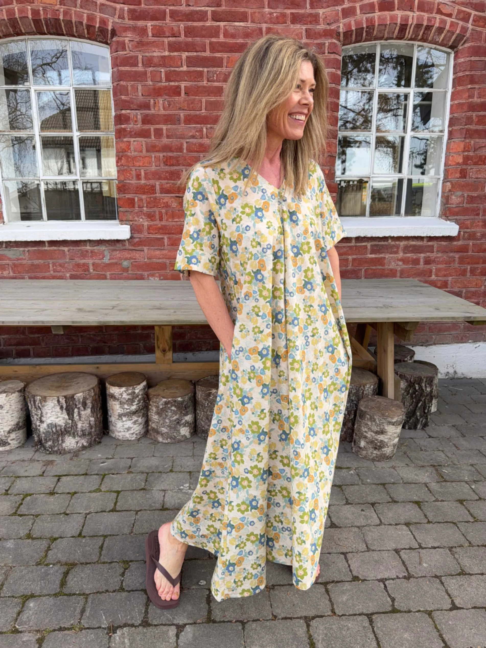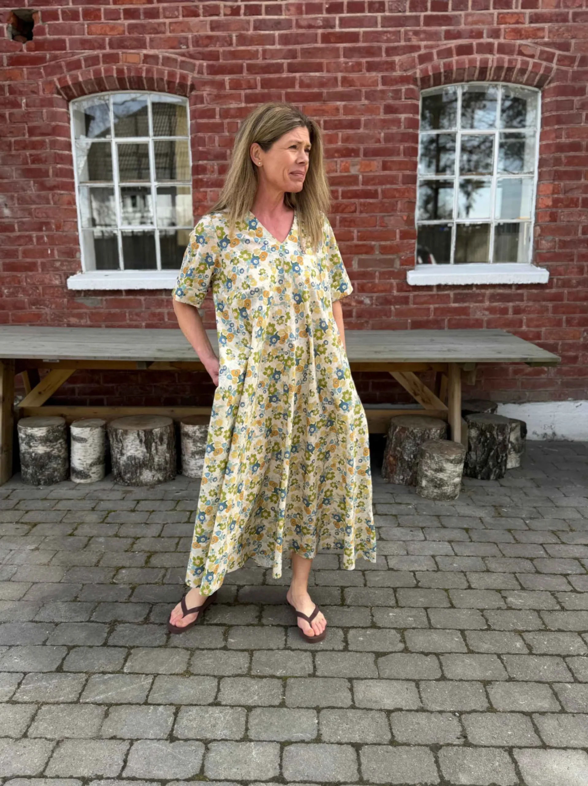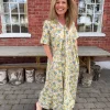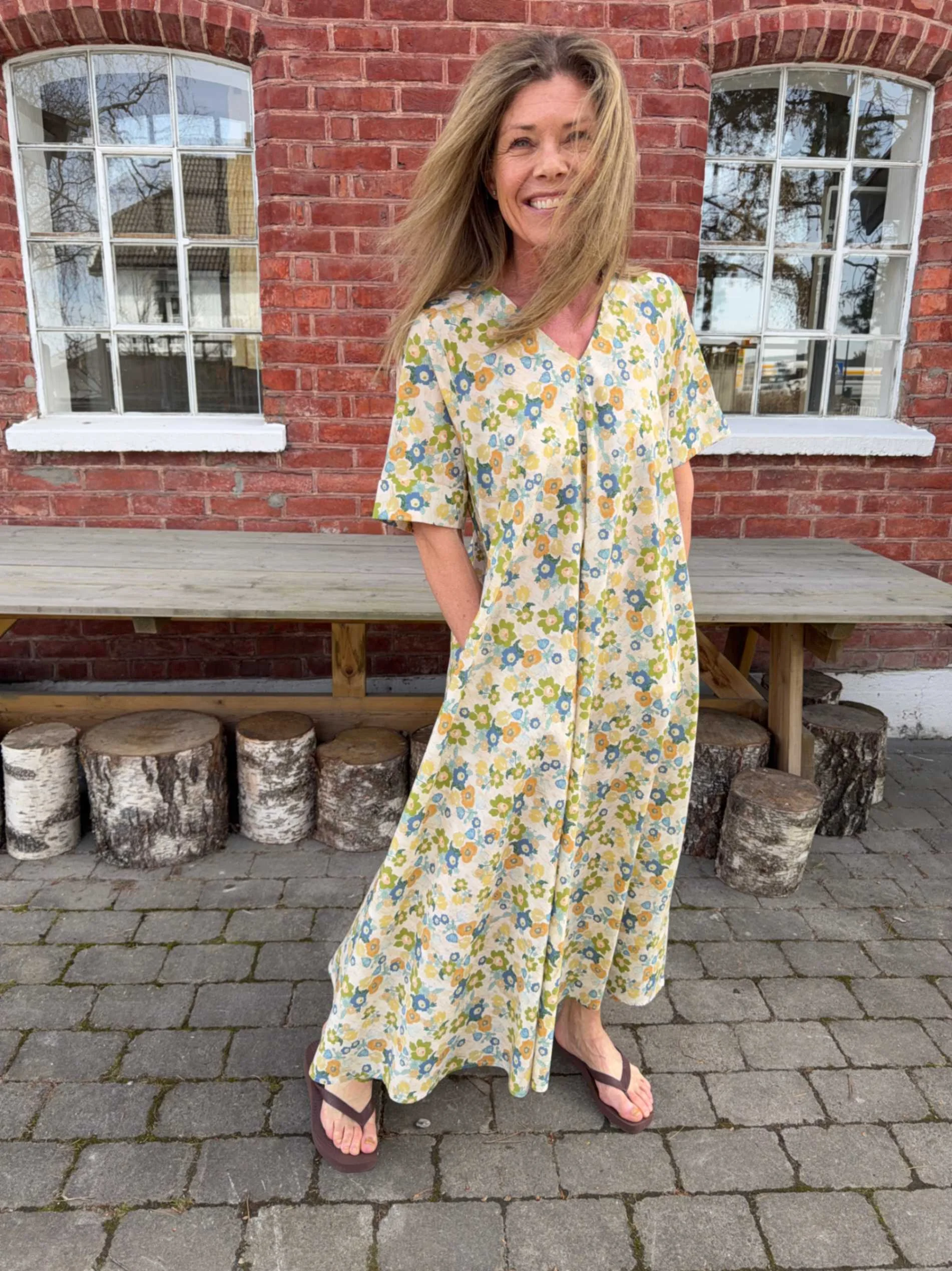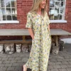 Eva Flower Print Dress er en komfortabel og elegant maxikjole med flatterende V-hals og A-fasong. Den faller pent på kroppen og har praktiske sidelommer. Ermene har fine brettede detaljer, og blomsterprintet i grønt, blått og gult gir et friskt uttrykk. Perfekt til både hverdag og sommerlige anledninger – bruk den med sandaler eller hæler.