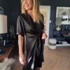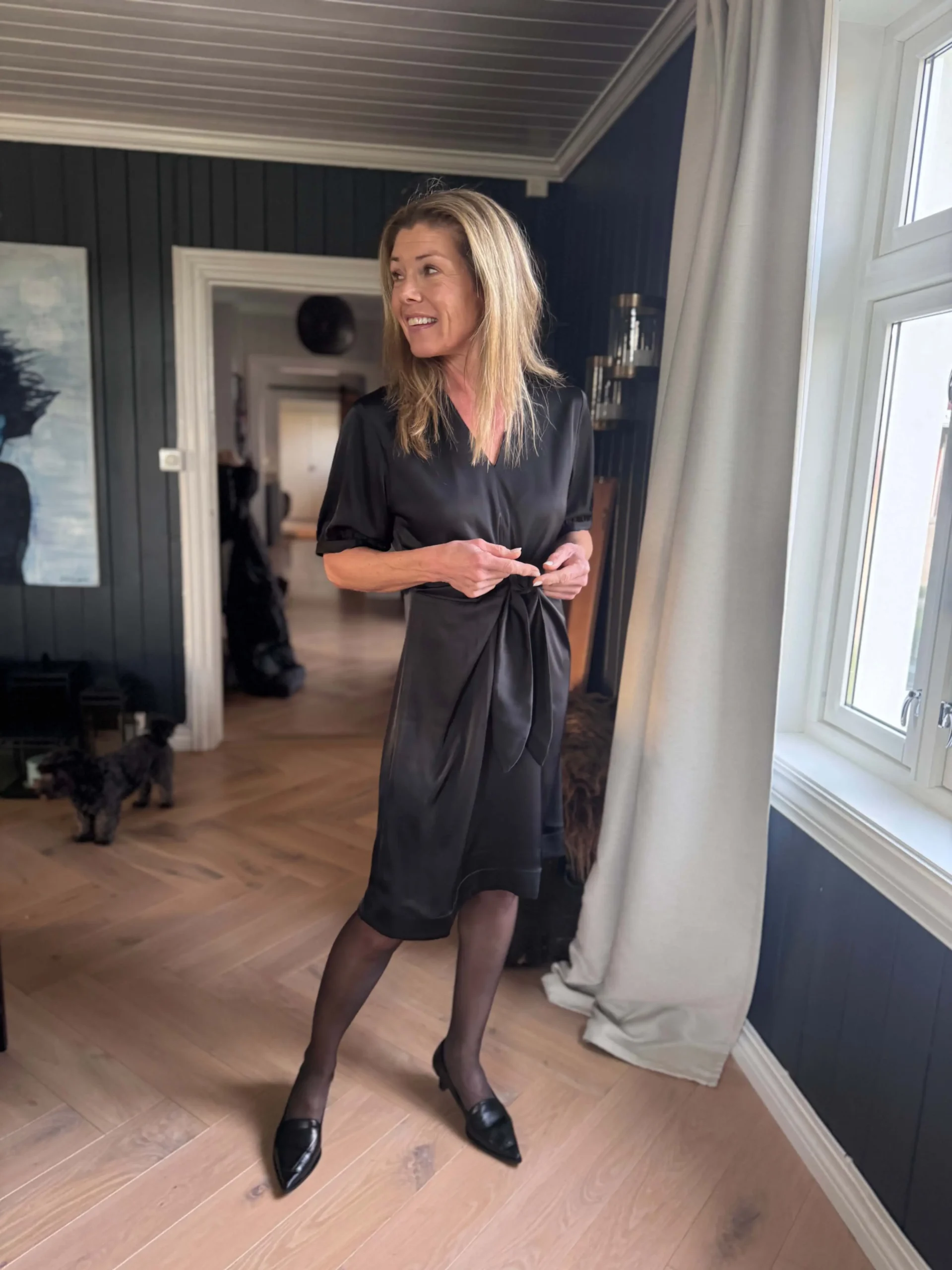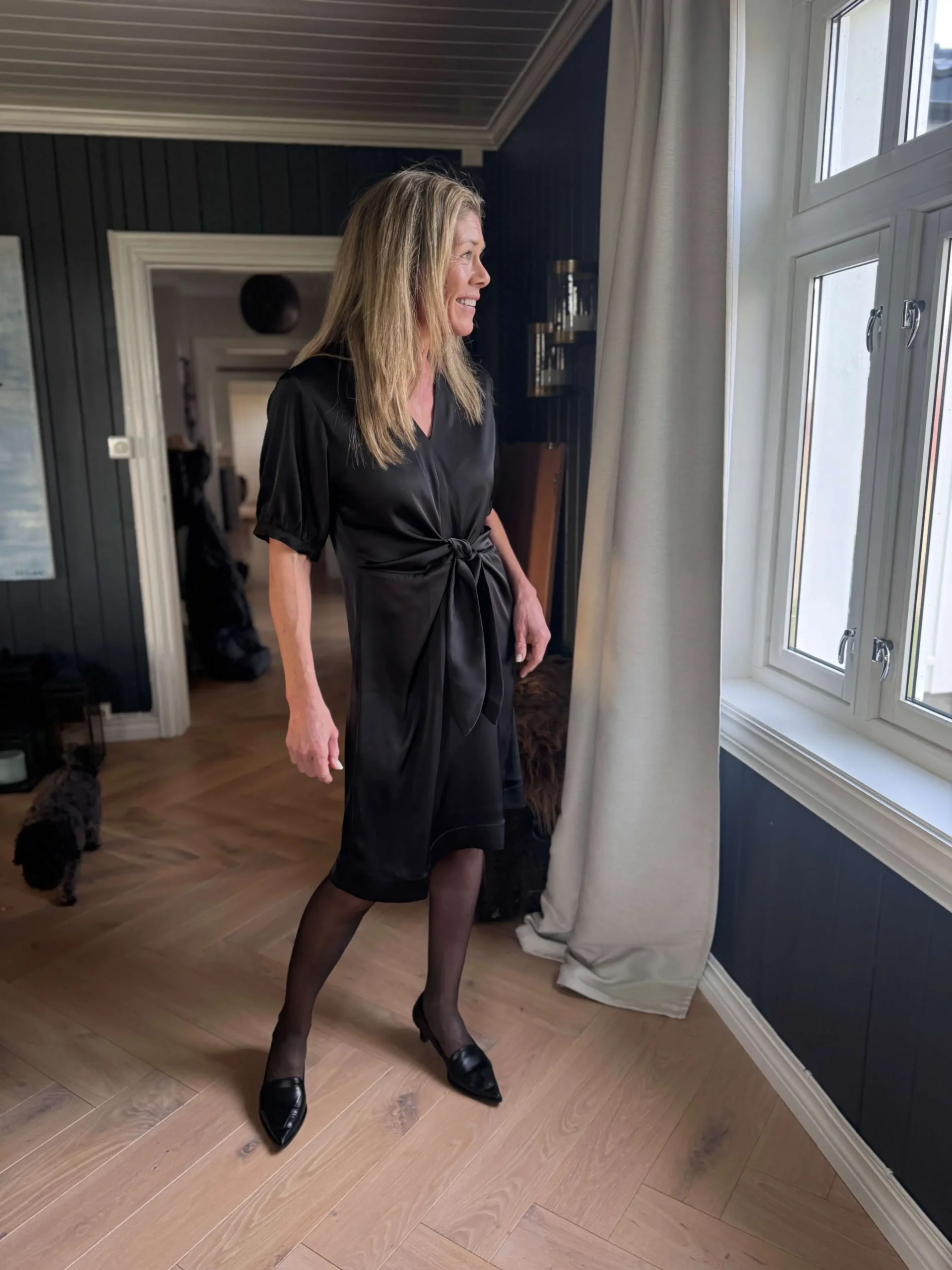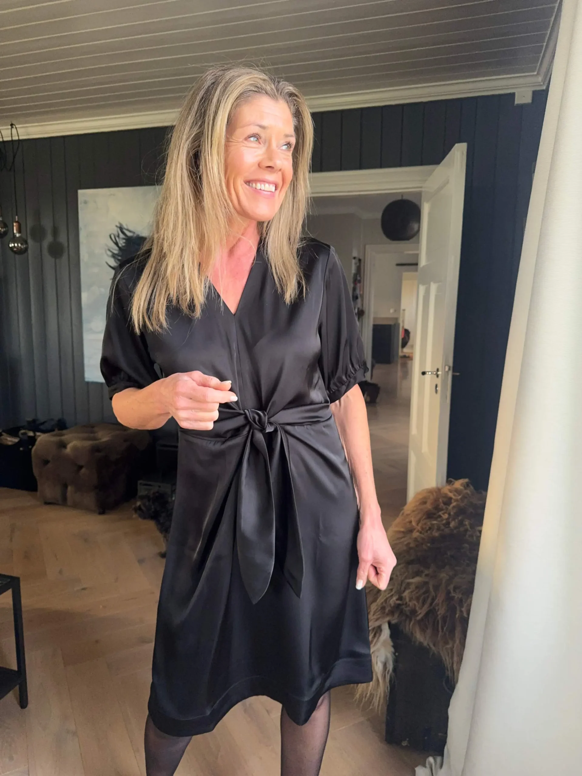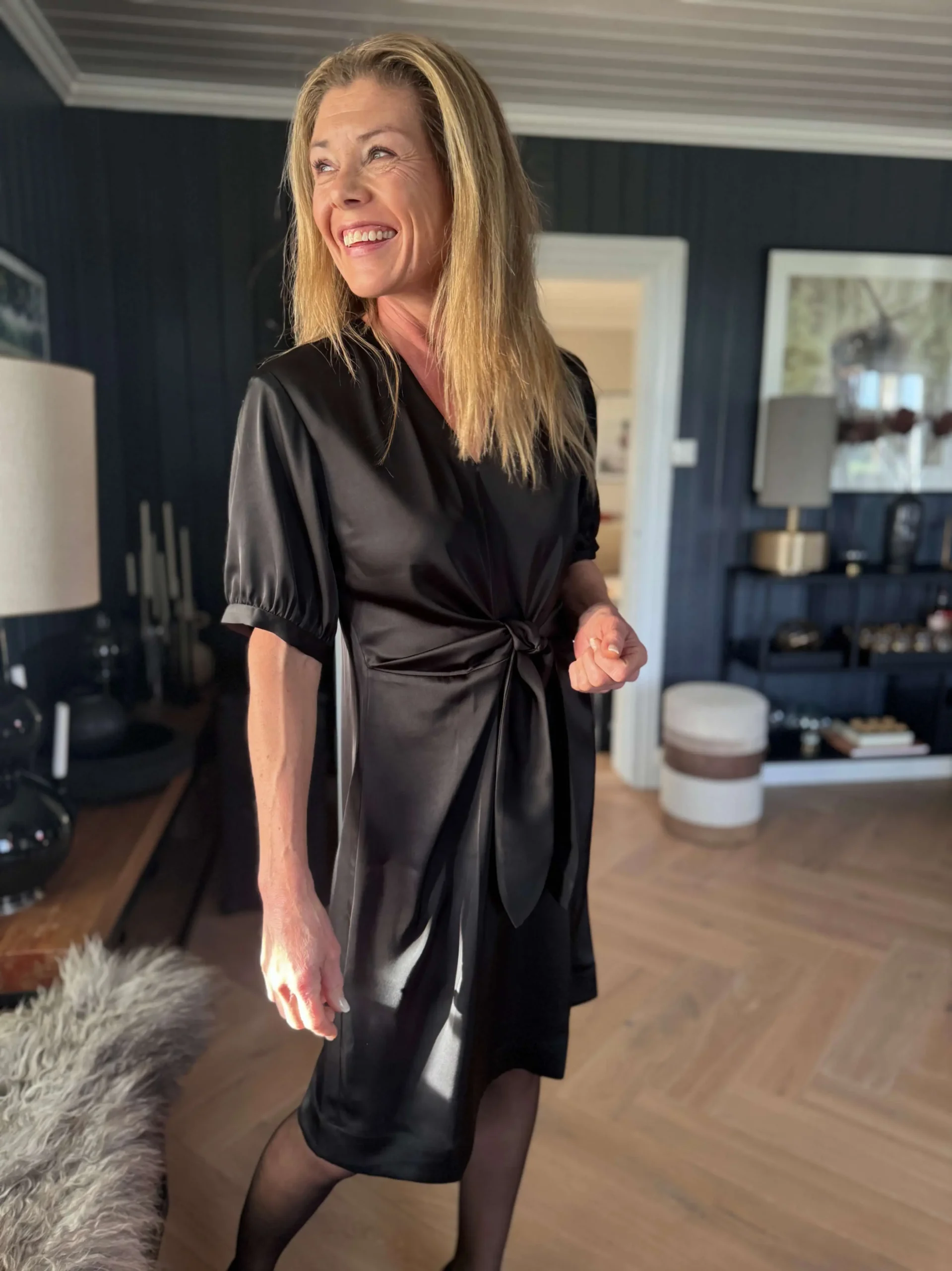 Elegant, kort kjole i klassisk sort med knytedetalj som gir en flatterende passform. V-hals og korte ermer gjør den feminin og tidløs. Perfekt med pumps og smykker for en stilfull look.