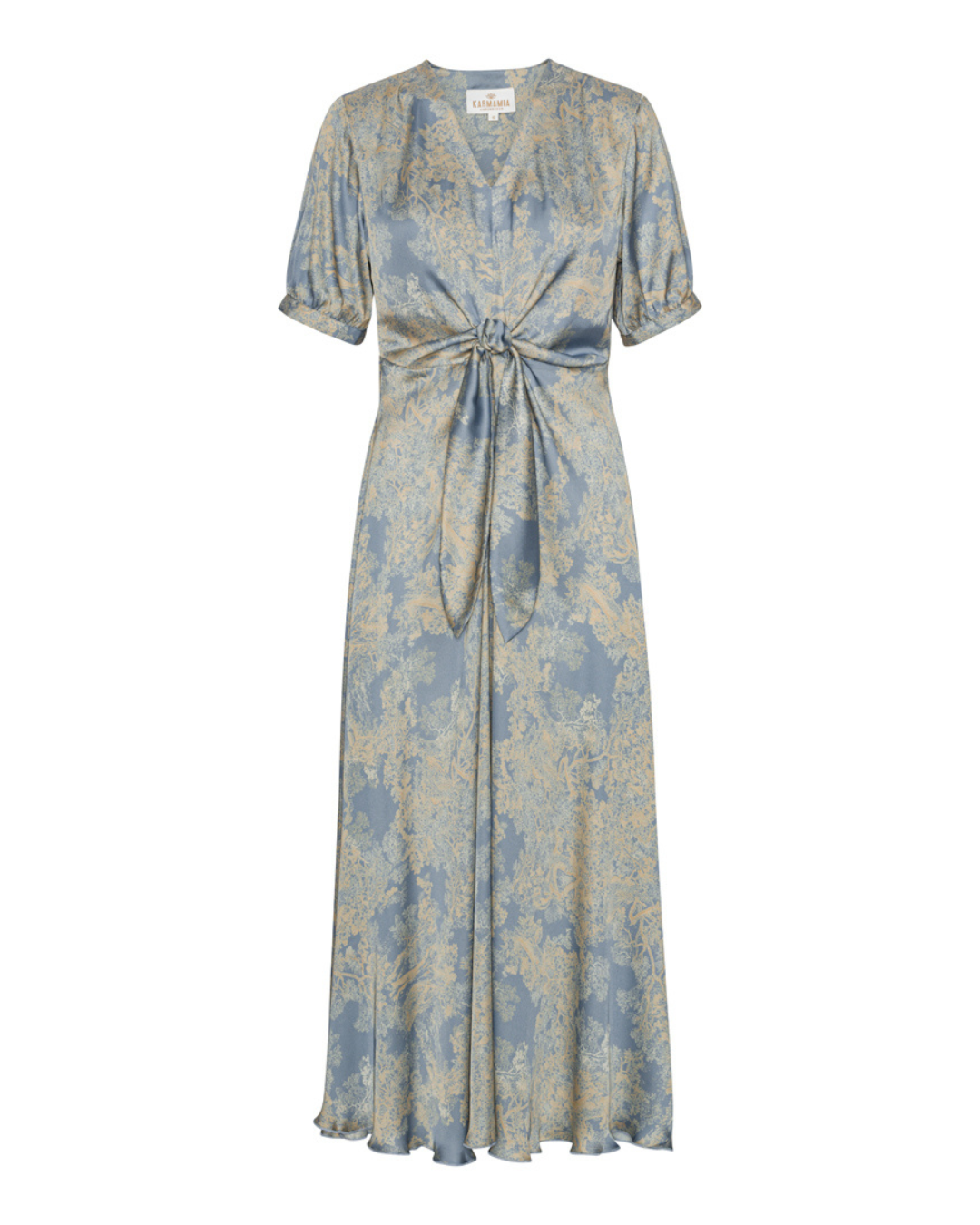 Lekker kjole fra Karmamia Copenhagen i blå-beige nyanse. Passer til mange anledninger og har et flatterende, naturlig fall. Stoffet krøller lite og er laget av miljøvennlig, resirkulert polyester – sydd av merkets egne skreddere i Dubai.