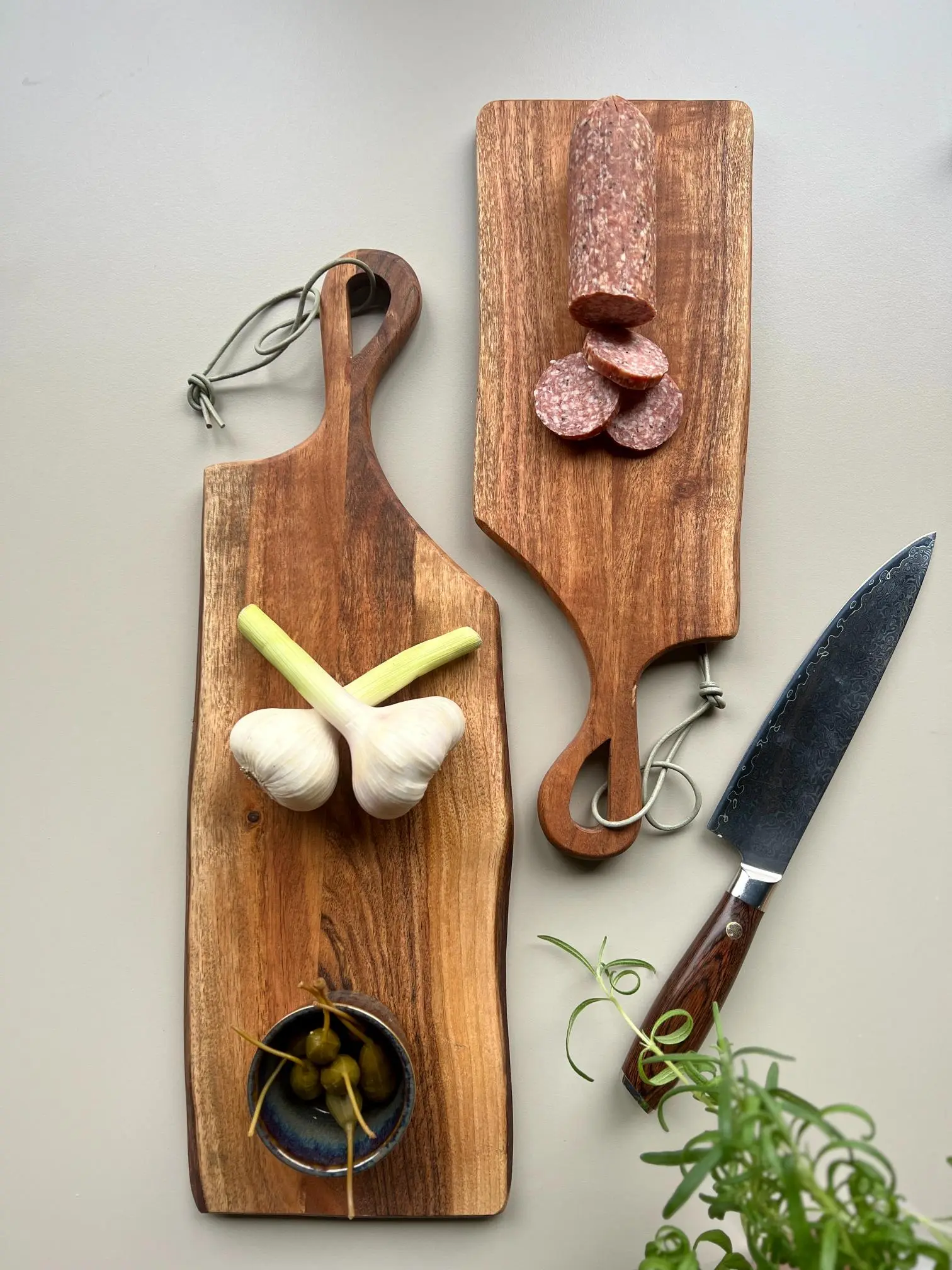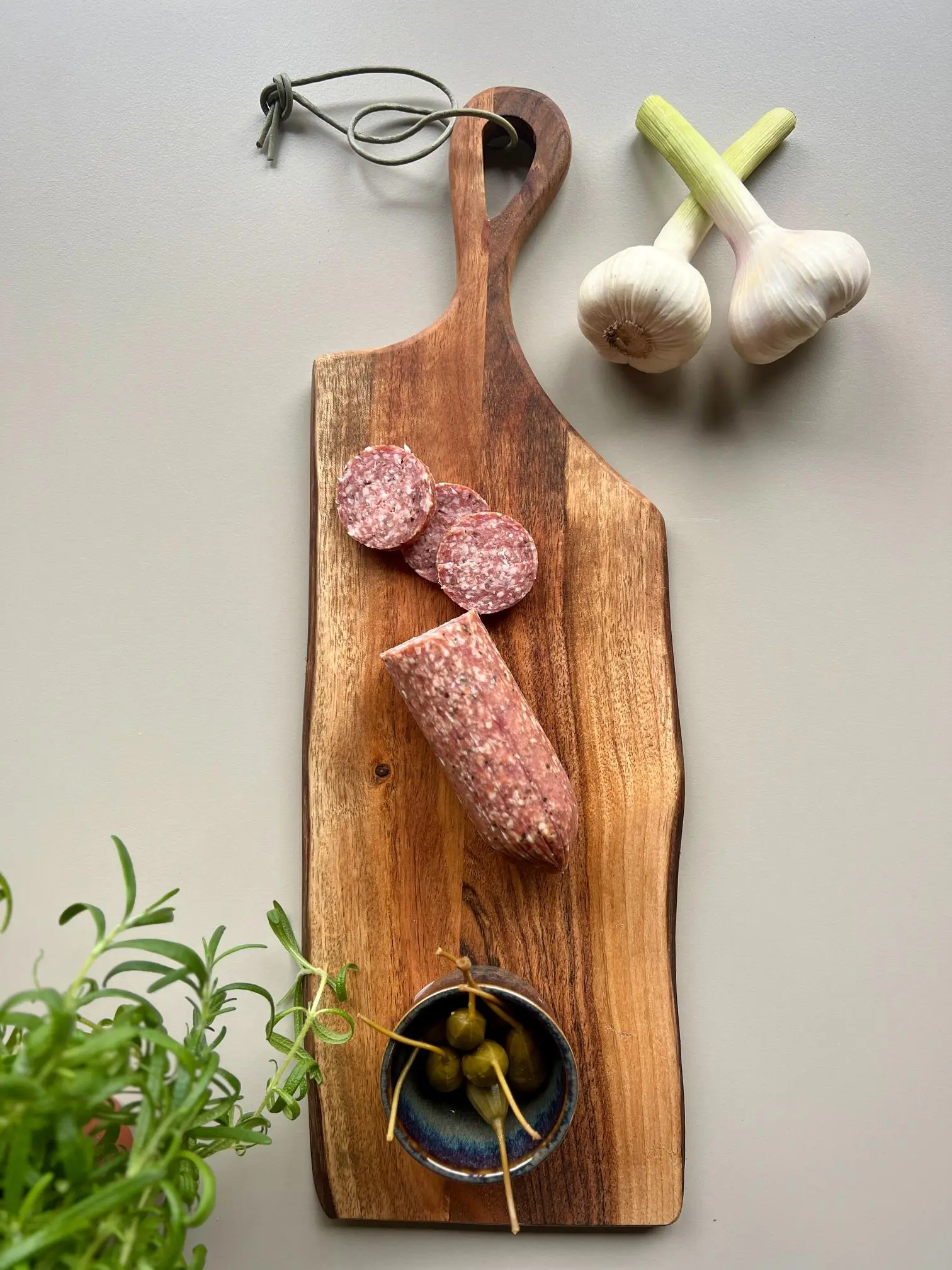 Fin fjøl med røffe kanter i størrelse 15 x 50 cm. Laget i acasie tre.