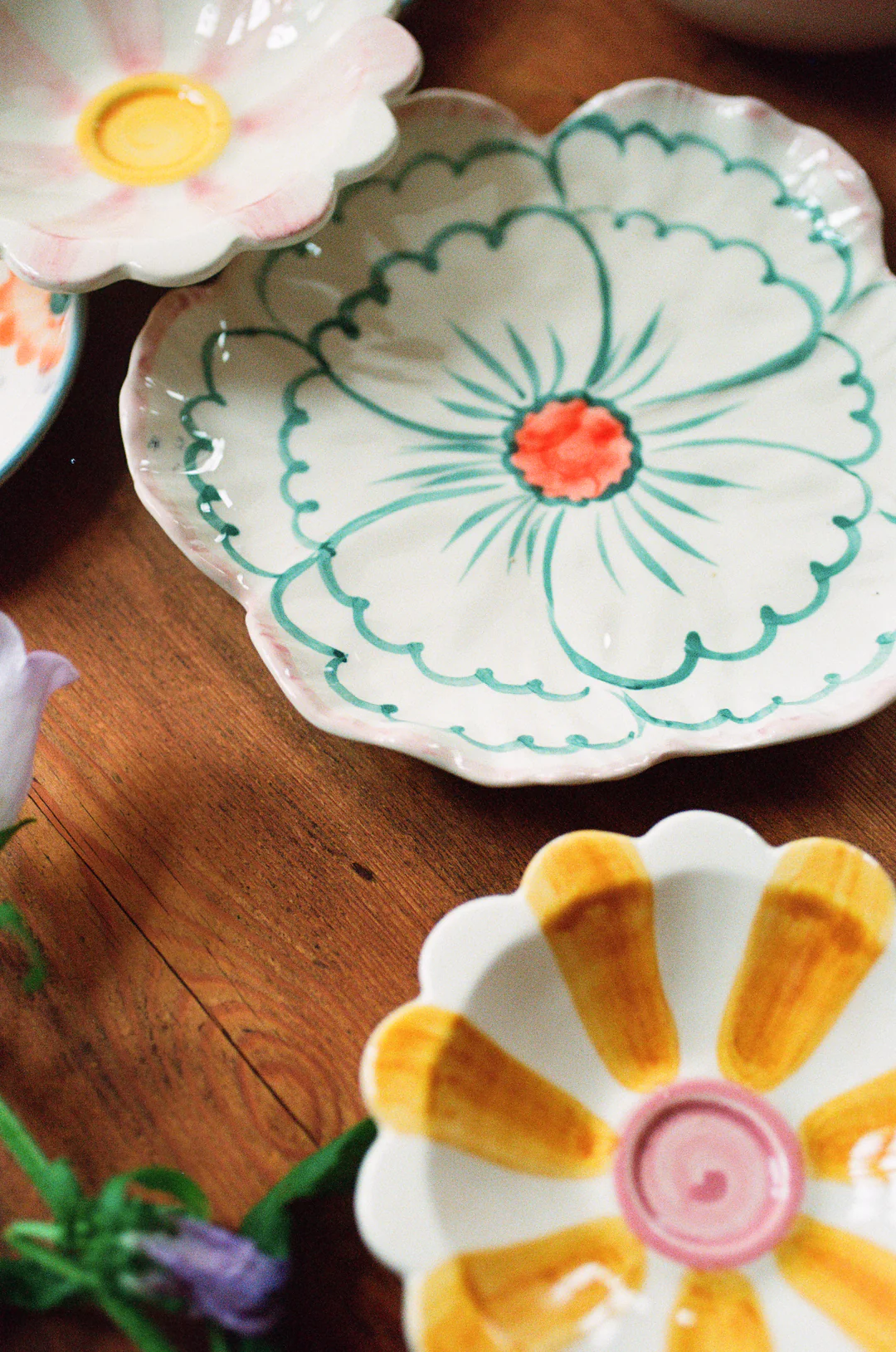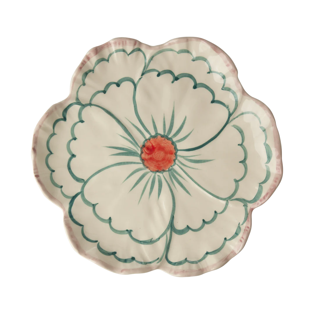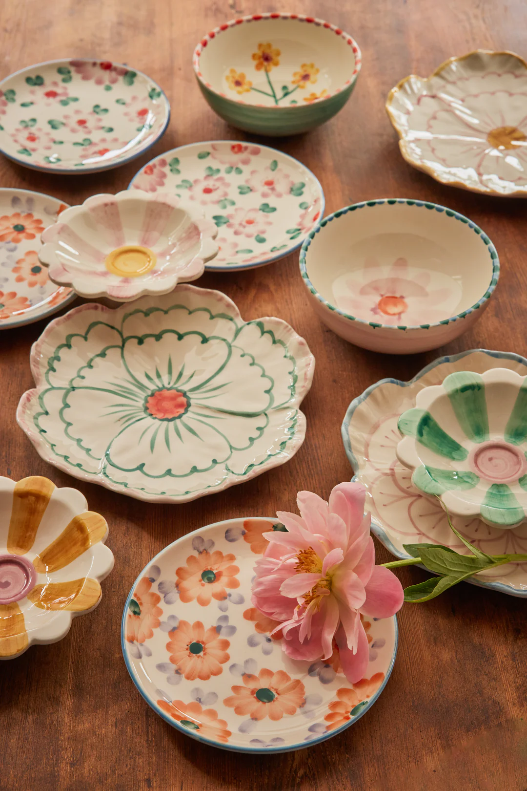 Skap vakker stemning på bordet med denne herlige blomsteraskjetten eller bruk den som et elegant serveringsfat. Den er beriket med håndmalte detaljer i grønt og rosa, ingen tallerkener like; hver og en er helt unik.