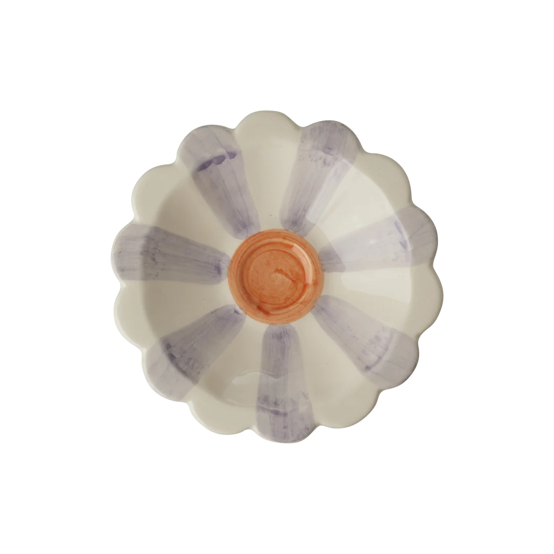 Vi er helt forelsket i denne nydelige, lille skålen med et blomsterinspirert design og vakre lavendel-fargede striper. Den er håndmalt, noe som sikrer at hver skål bærer penselstrøkene fra hånden som malte den. Hver skål er derfor helt unik, og vi synes den er utrolig sjarmerende!
