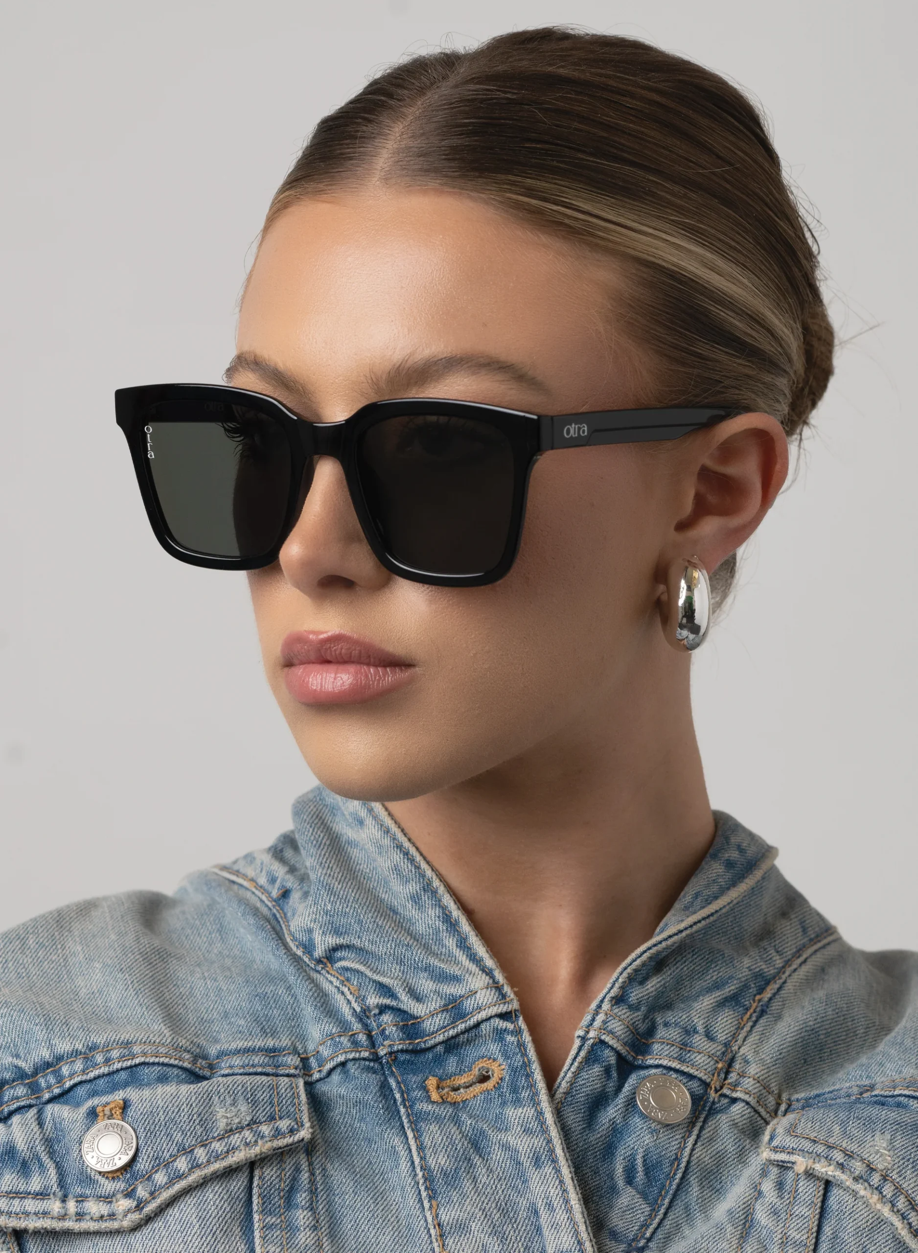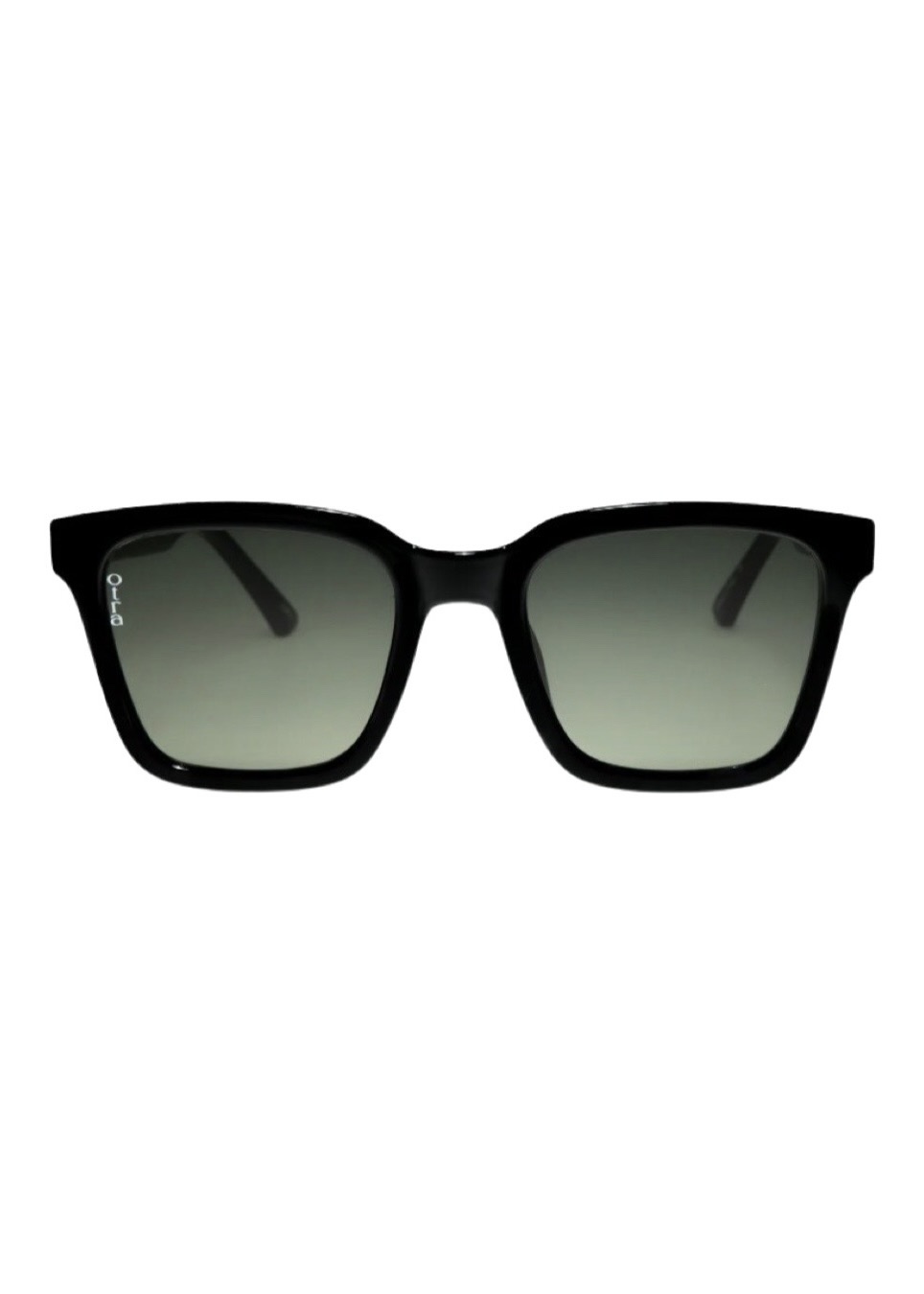 Klassisk oversized solbrille med svart ramme og mørkegrønt glass fra Otra Eyewear.