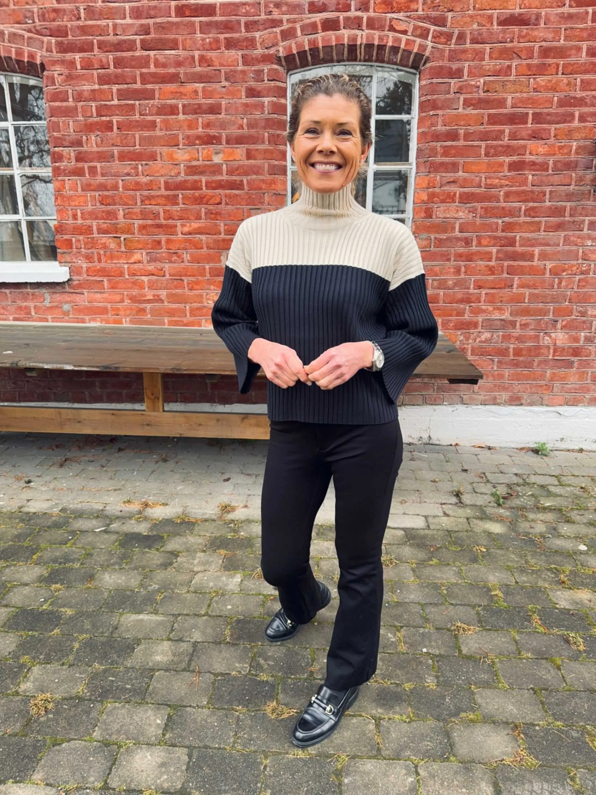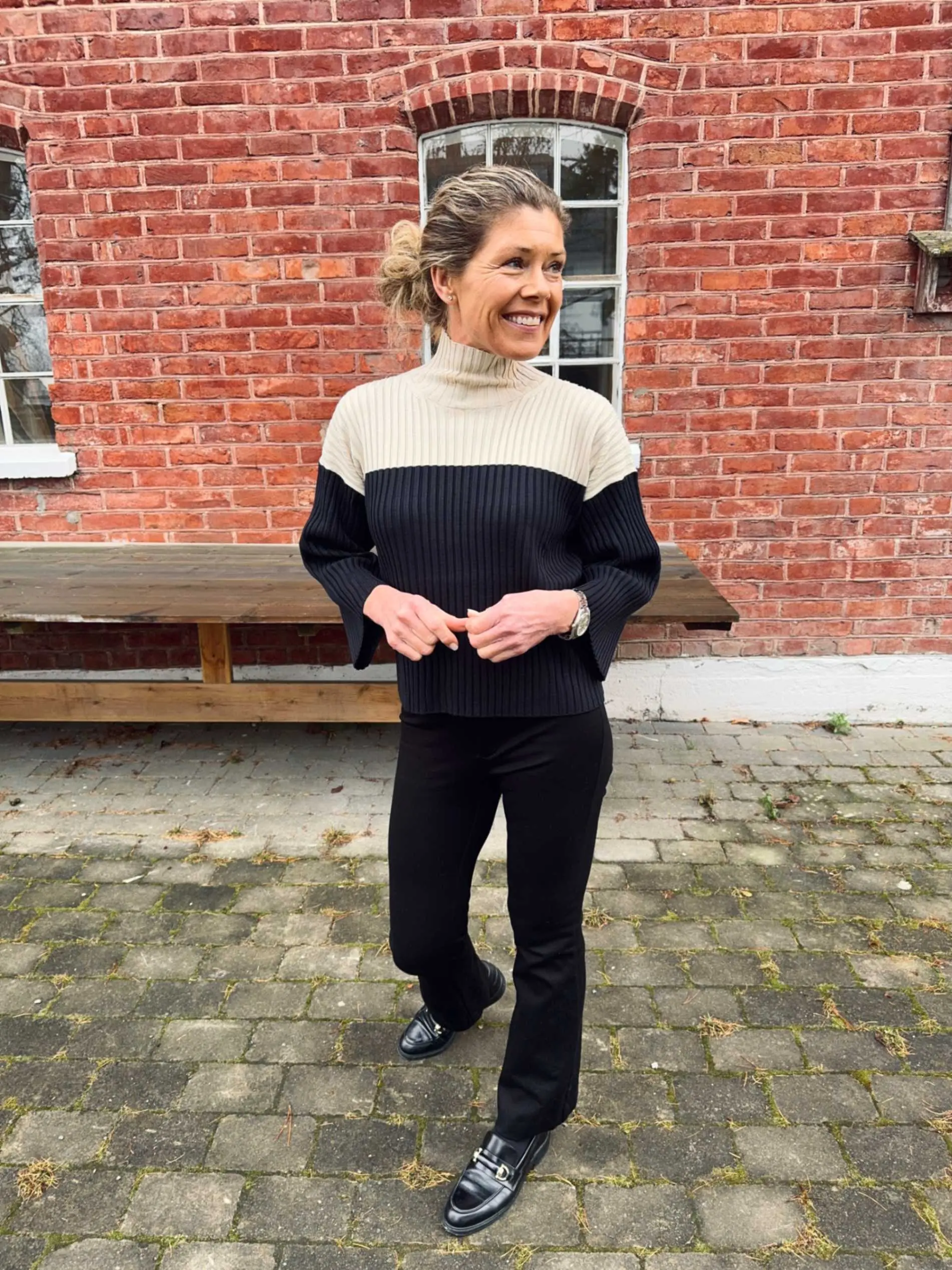 Lekker ribbestrikket genser i sort og beige. Passer til både bukser og skjørt.