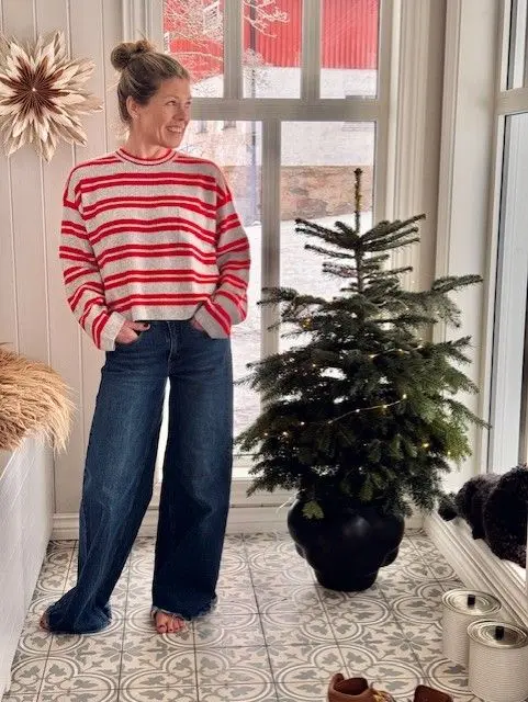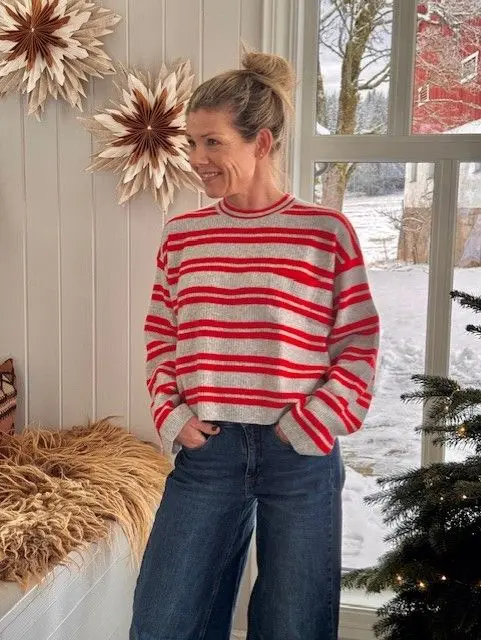 Langermet genser med rund hals – grå med røde striper. Komfortabel og allsidig genser i mykt materiale. Grå base med røde striper gir et stilrent og moderne uttrykk. Perfekt til både hverdagsbruk og avslappede anledninger.