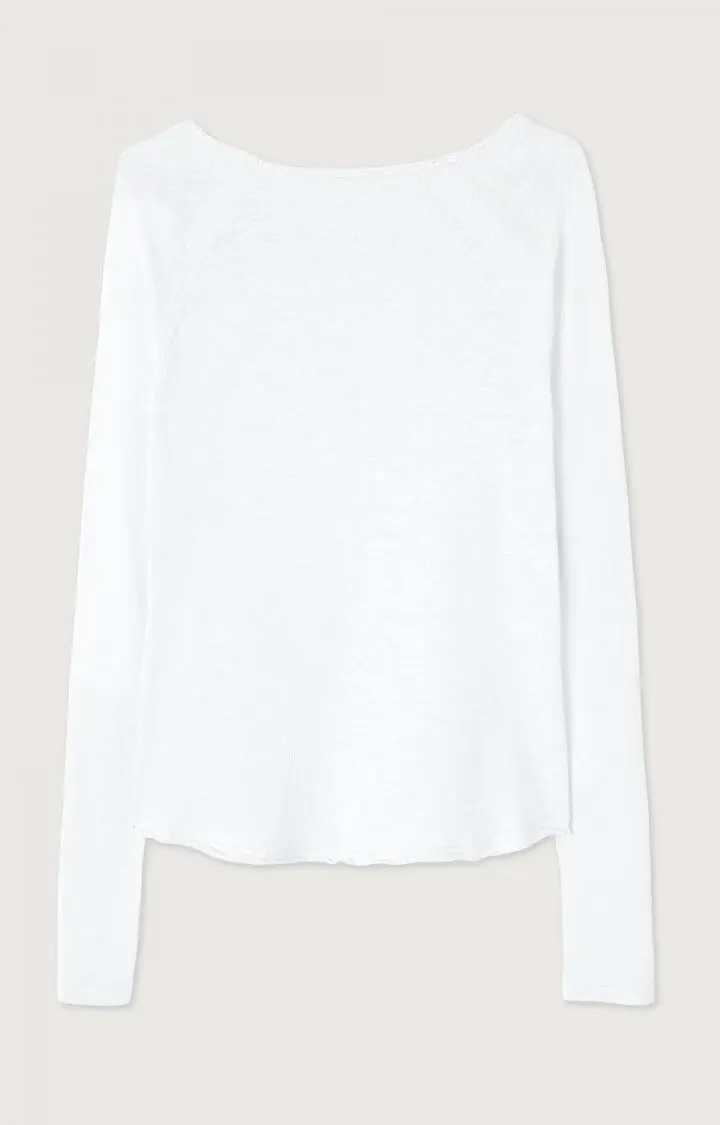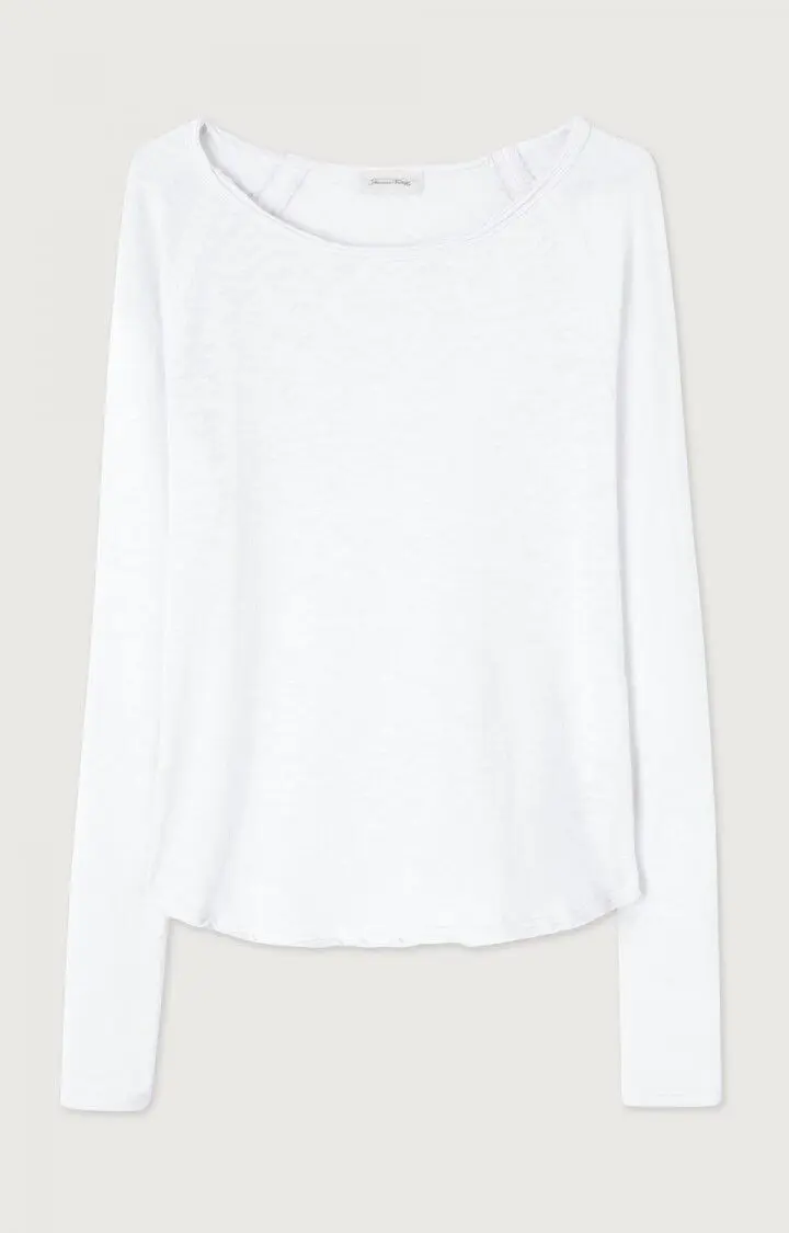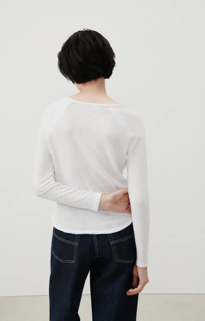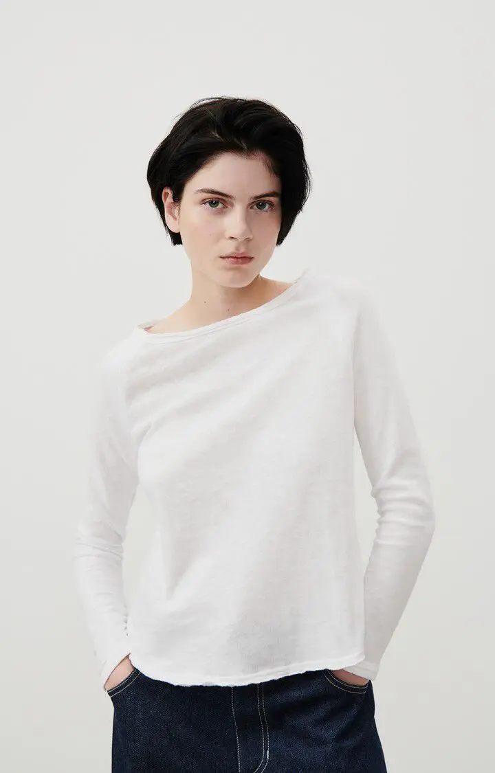 Hvit og enkel genser fra American Vintage i god bomullskvalitet – perfekt til basegarderoben. Genseren har et rett snitt, båthals og rå kant rundt halsen.