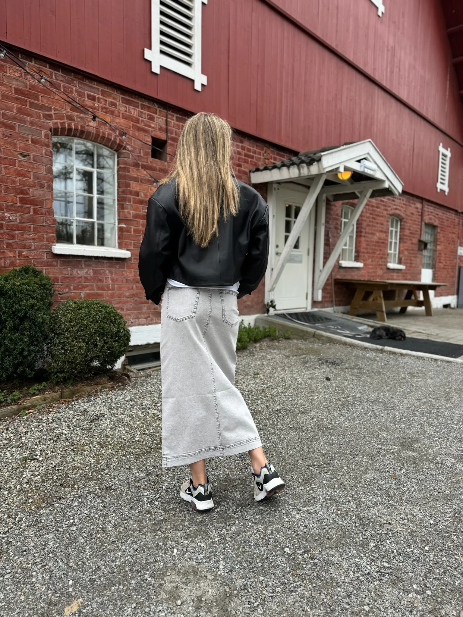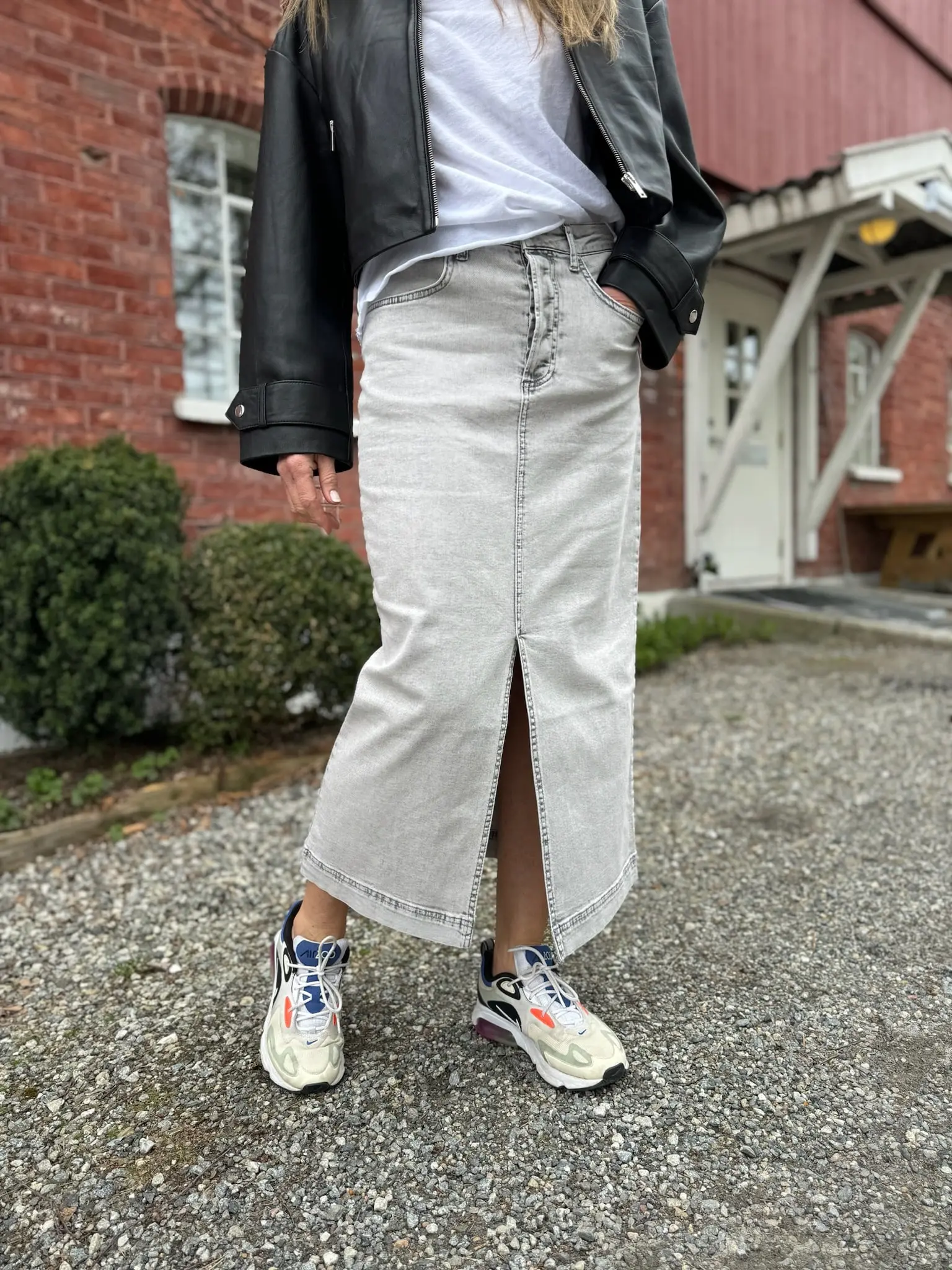 Midi-langt denimskjørt laget av bomull med stretch. Skjørtet har splitt foran og klassisk design.