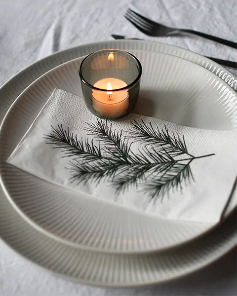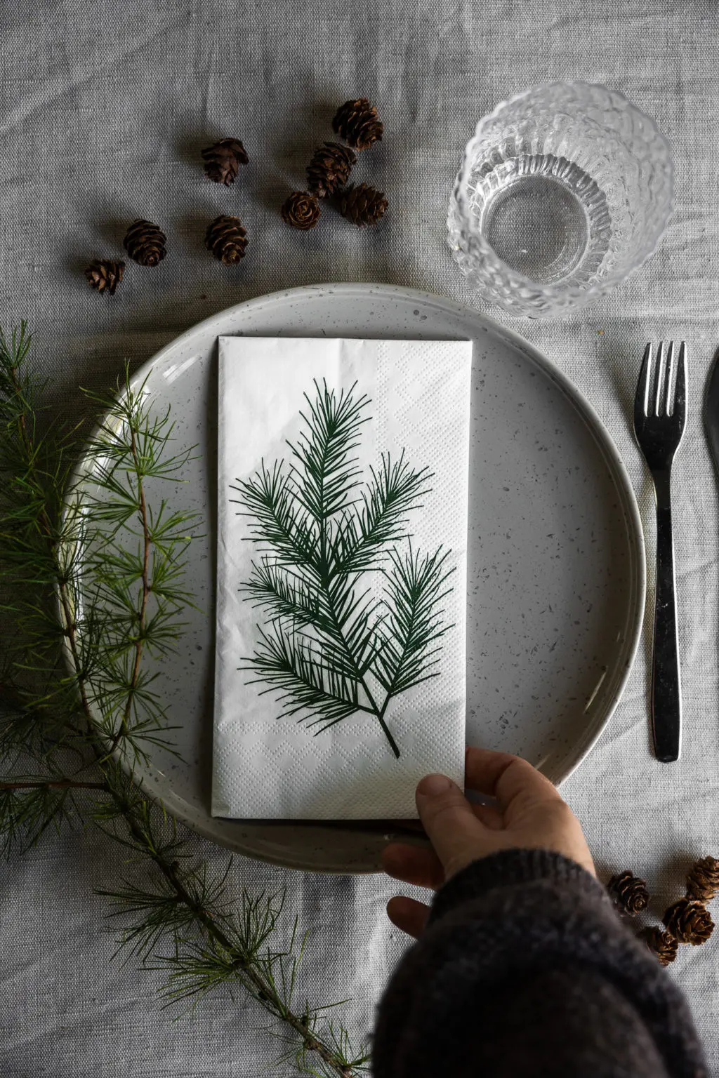 Papirserviett med kvist-motiv. En elegant serviett som gir borddekkingen et stilrent preg og hever julestemningen. Hver pakke inneholder 16 servietter.
