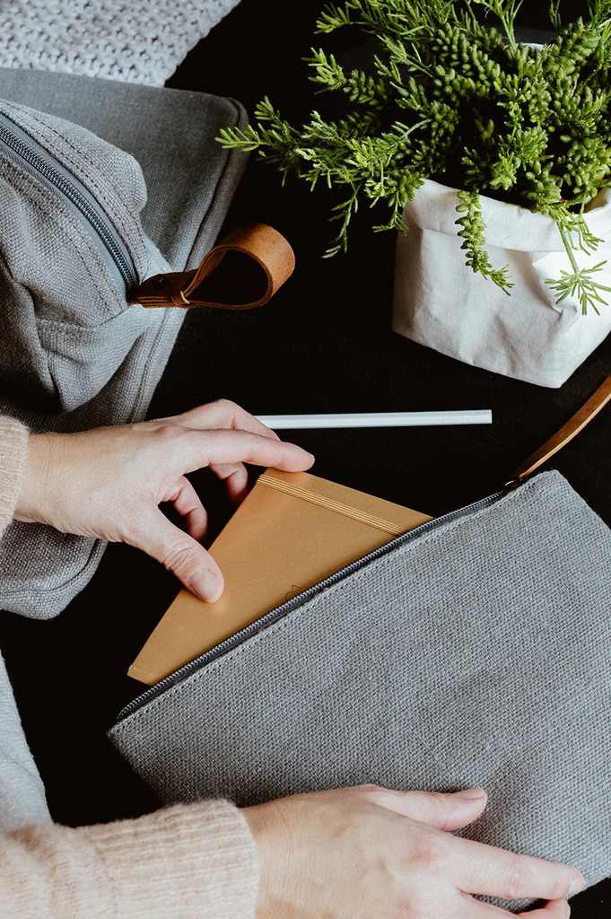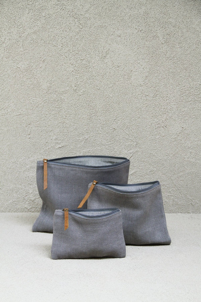 Stilfull mellomstor toalettveske i myk, vasket jute-canvas med skinndetaljer og blå- og hvitstripet fôr. Perfekt for ladekabler, sminke, skrivesaker eller annet utstyr man skulle trenge å ta med i farta. Denne vesken er både praktisk og elegant, og passer perfekt som gave.
