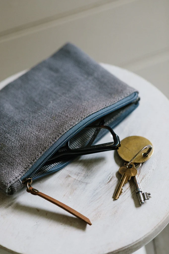 Stilfull liten toalettveske i myk, vasket jute-canvas med skinndetaljer og blå- og hvitstripet fôr. Perfekt for småting som nøkler, kort og pass, sminke eller smykker. Denne vesken er både praktisk og elegant, og passer perfekt som gave.
