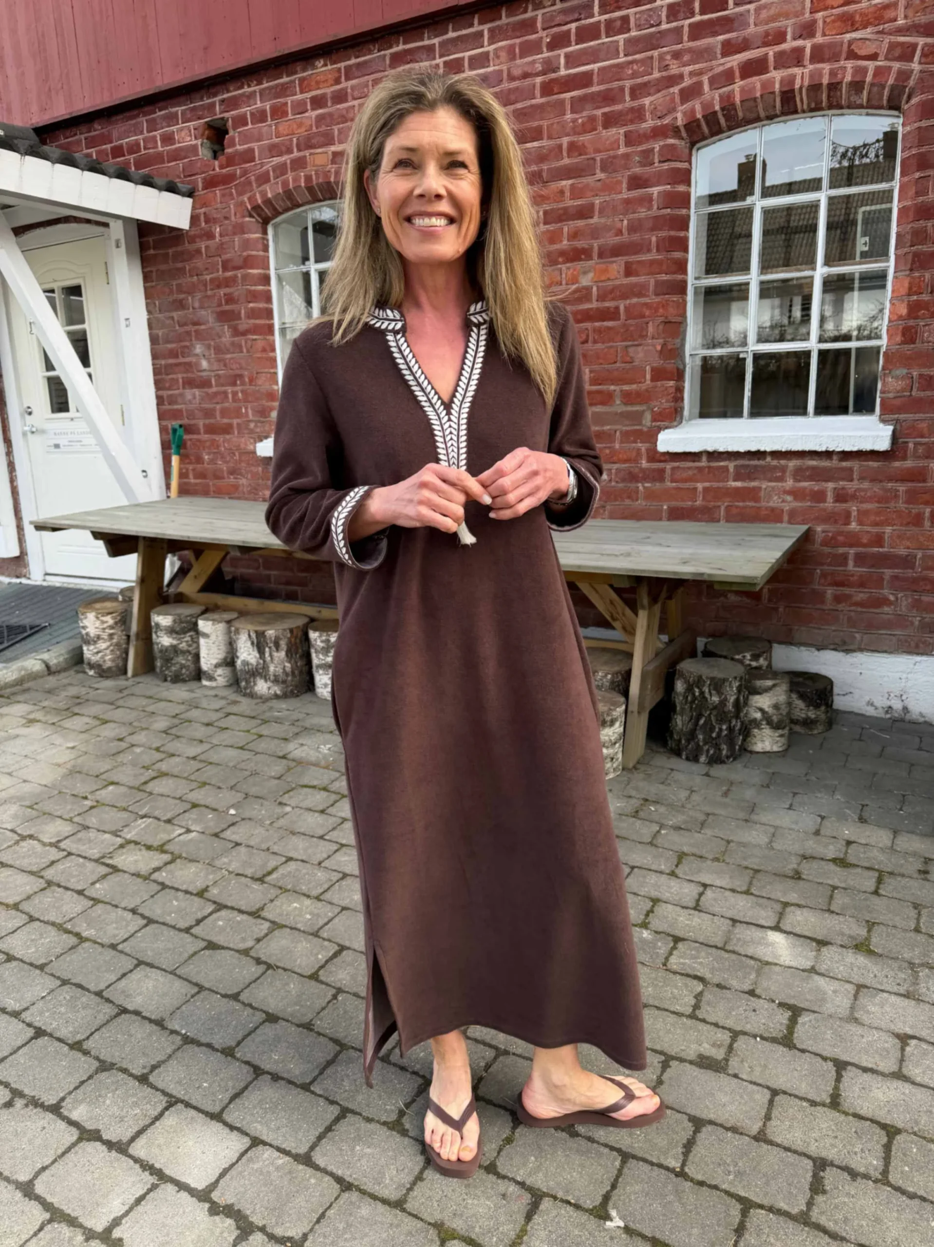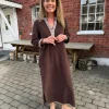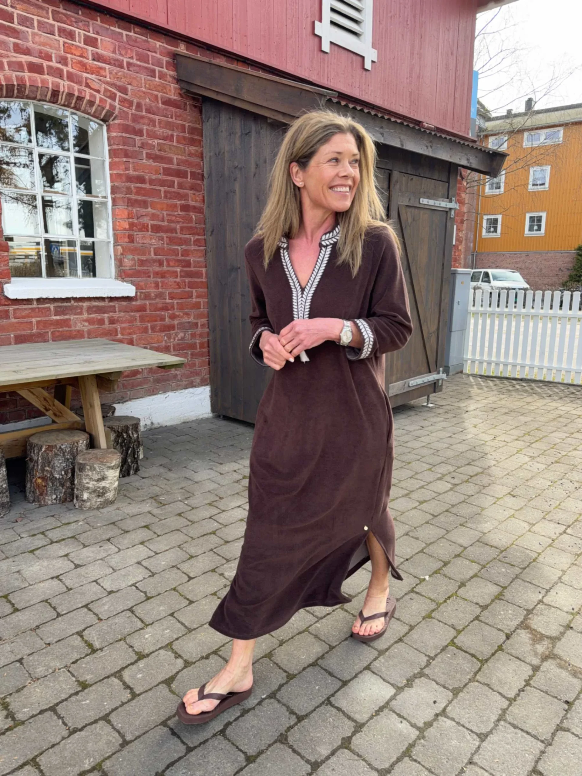 Myk frottékjole i en varm brun tone. Den har en rett, avslappet passform med V-hals pyntet med dekorative broderier, samt matchende detaljer på ermene. Praktiske sidelommer og splitter i sidene gir god komfort og bevegelighet.