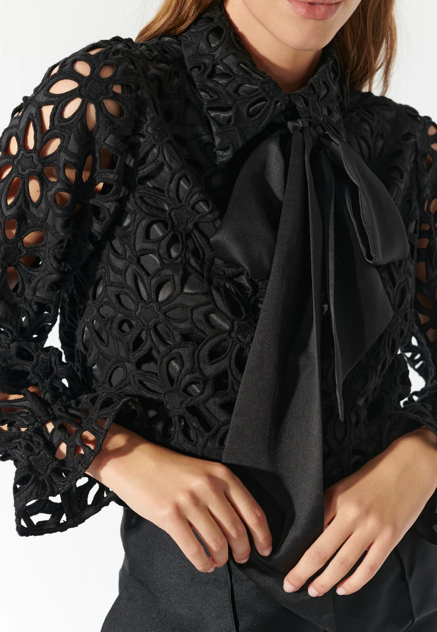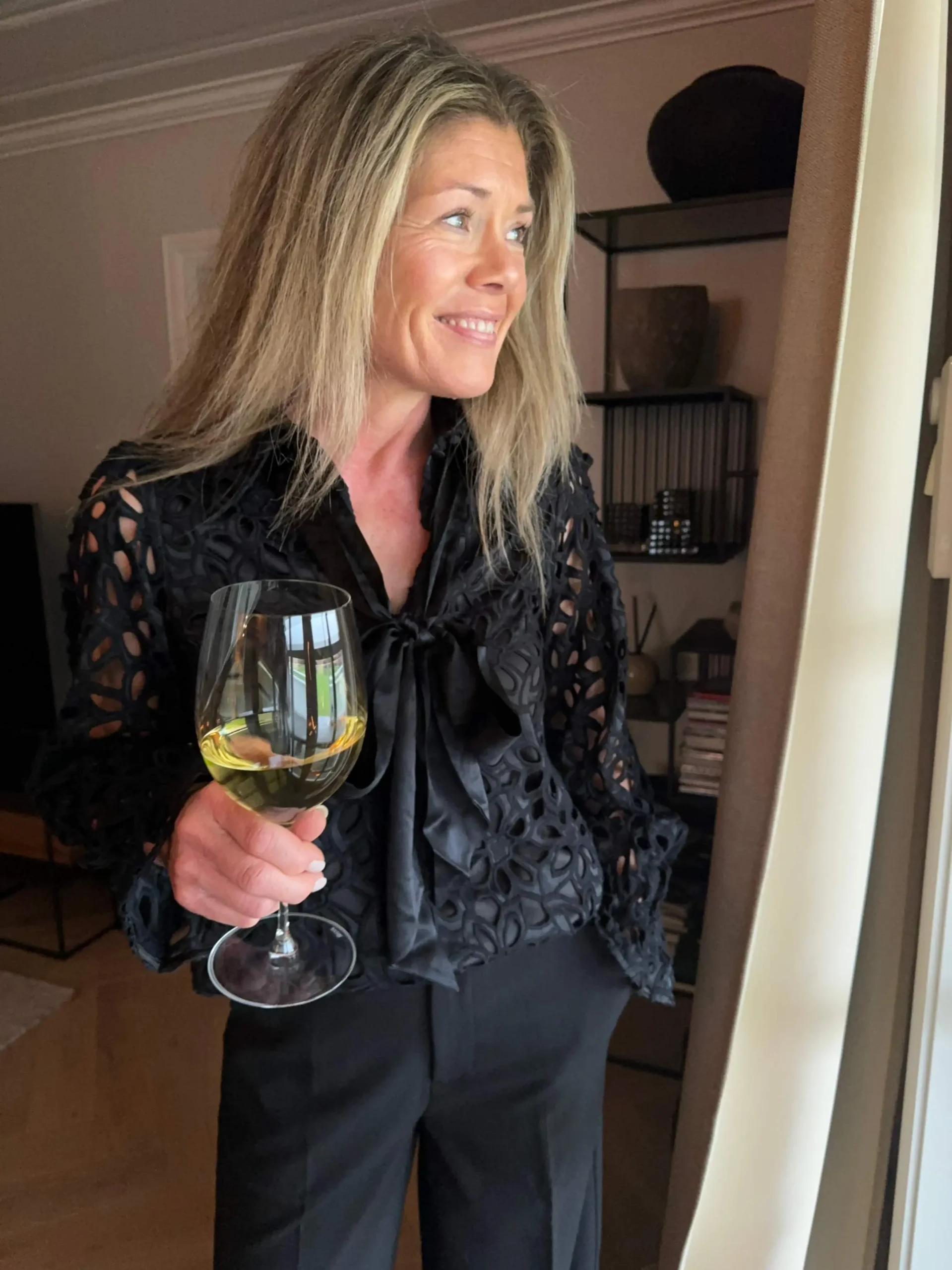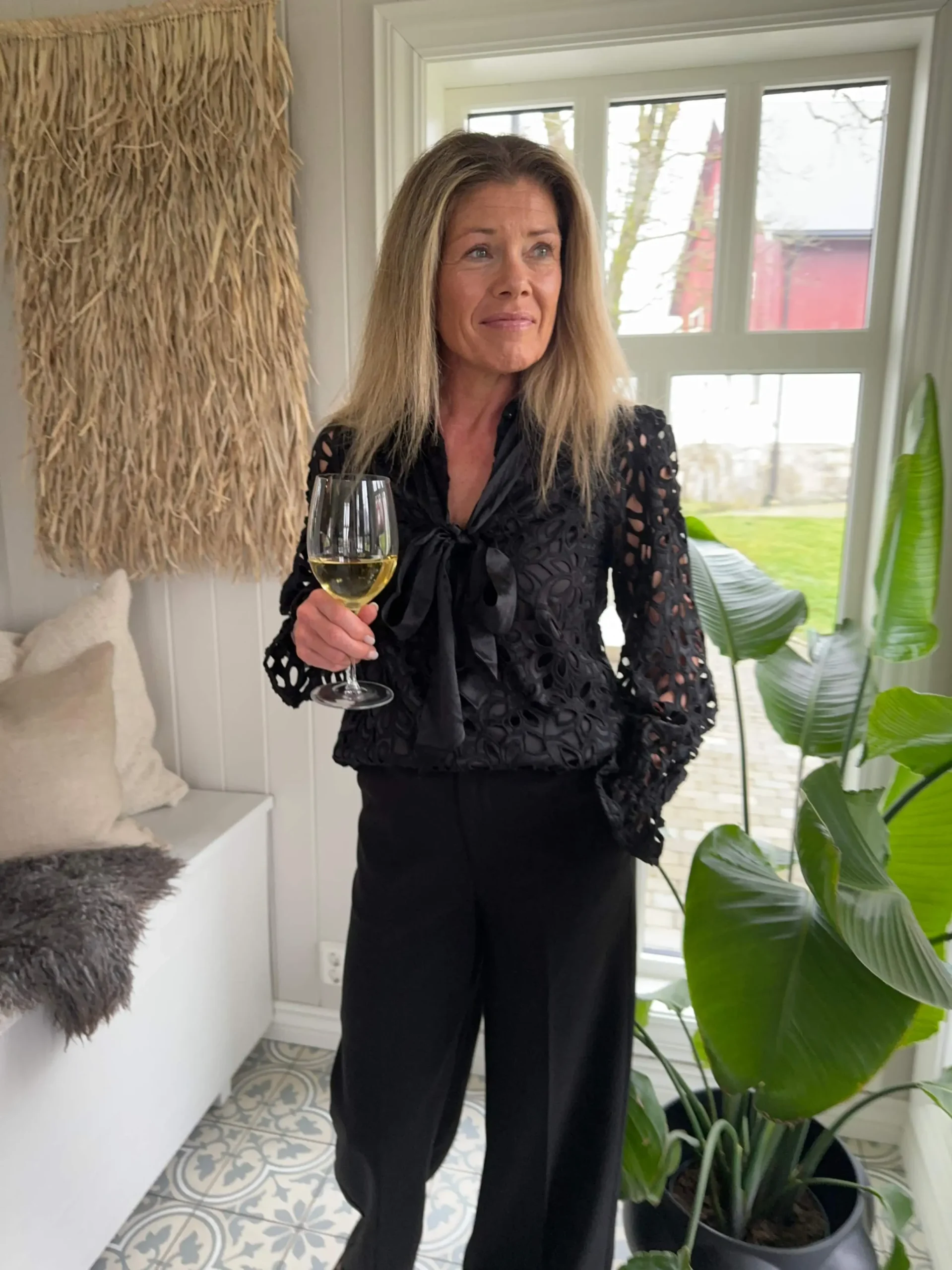 Lekker og feminin bluse med nydelig broderi og fôret for komfort. Den har en krage, valgfri satinbånd ved halsen og en nøkkelhull- og dobbel knappelukking. De lange blousonermene med elastisk volangmansjett gir et elegant preg. Perfekt for både hverdags og fest!
