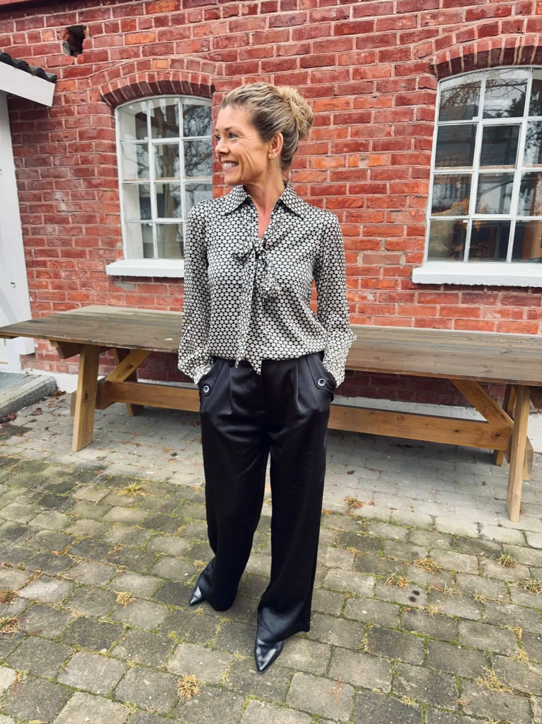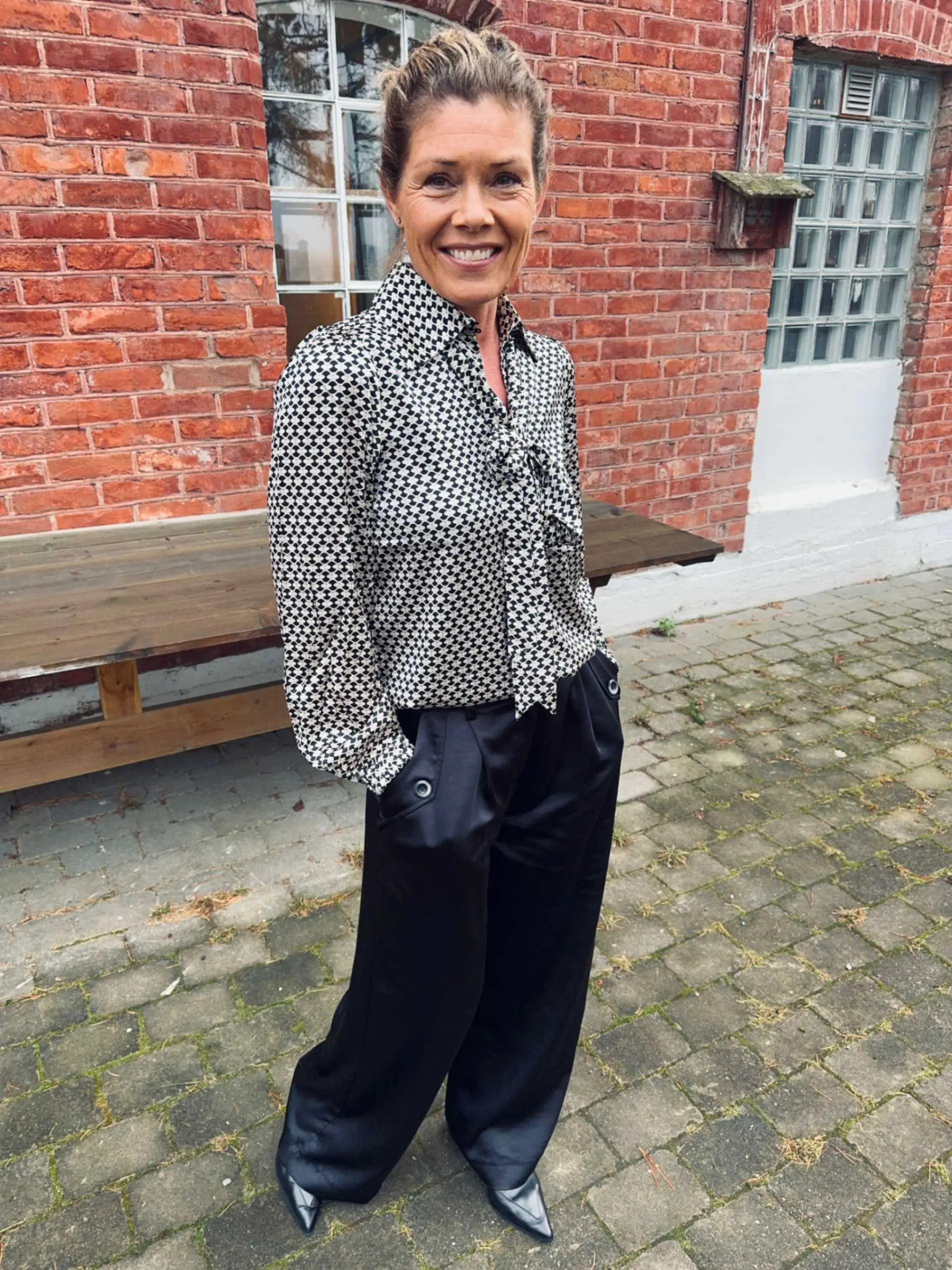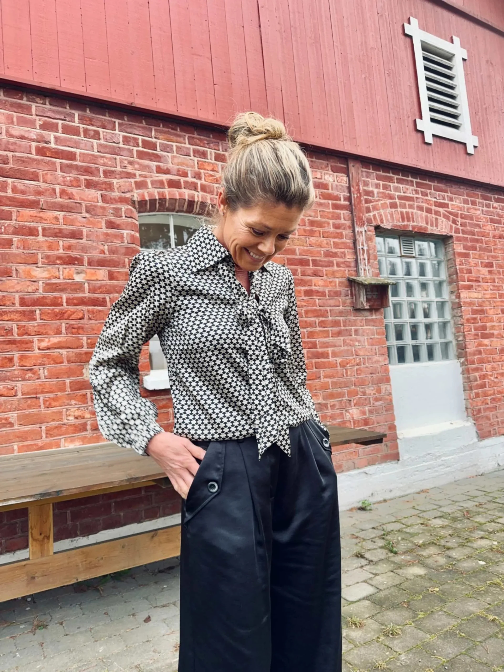 Kikki Blouse er en silkebluse med voluminøse ermer og kroppsnær silhuett. Det grafiske trykket gir et unikt preg, mens det avtakbare skjerfet kan styles som en sløyfe eller løst for en mer uformell look.