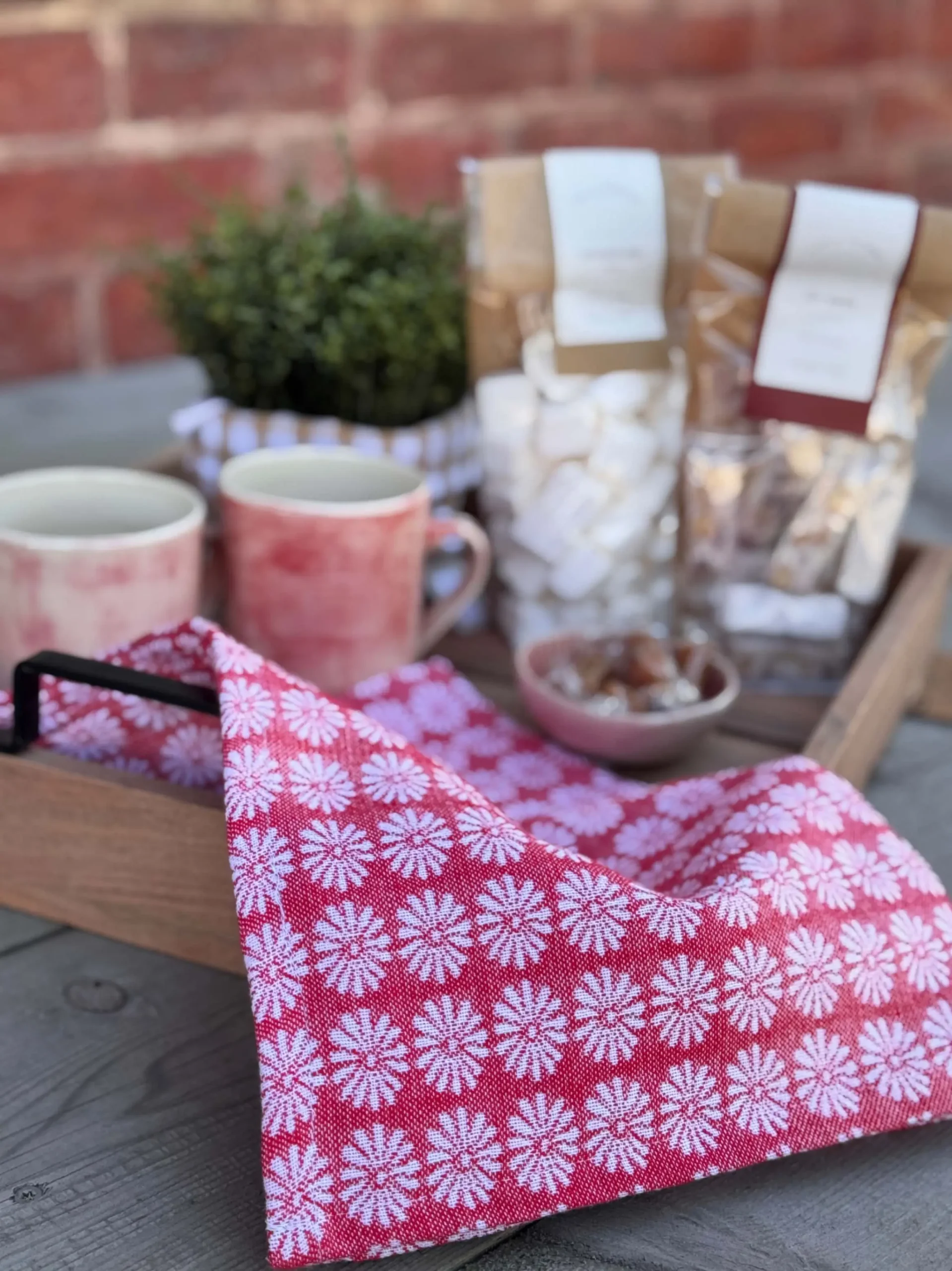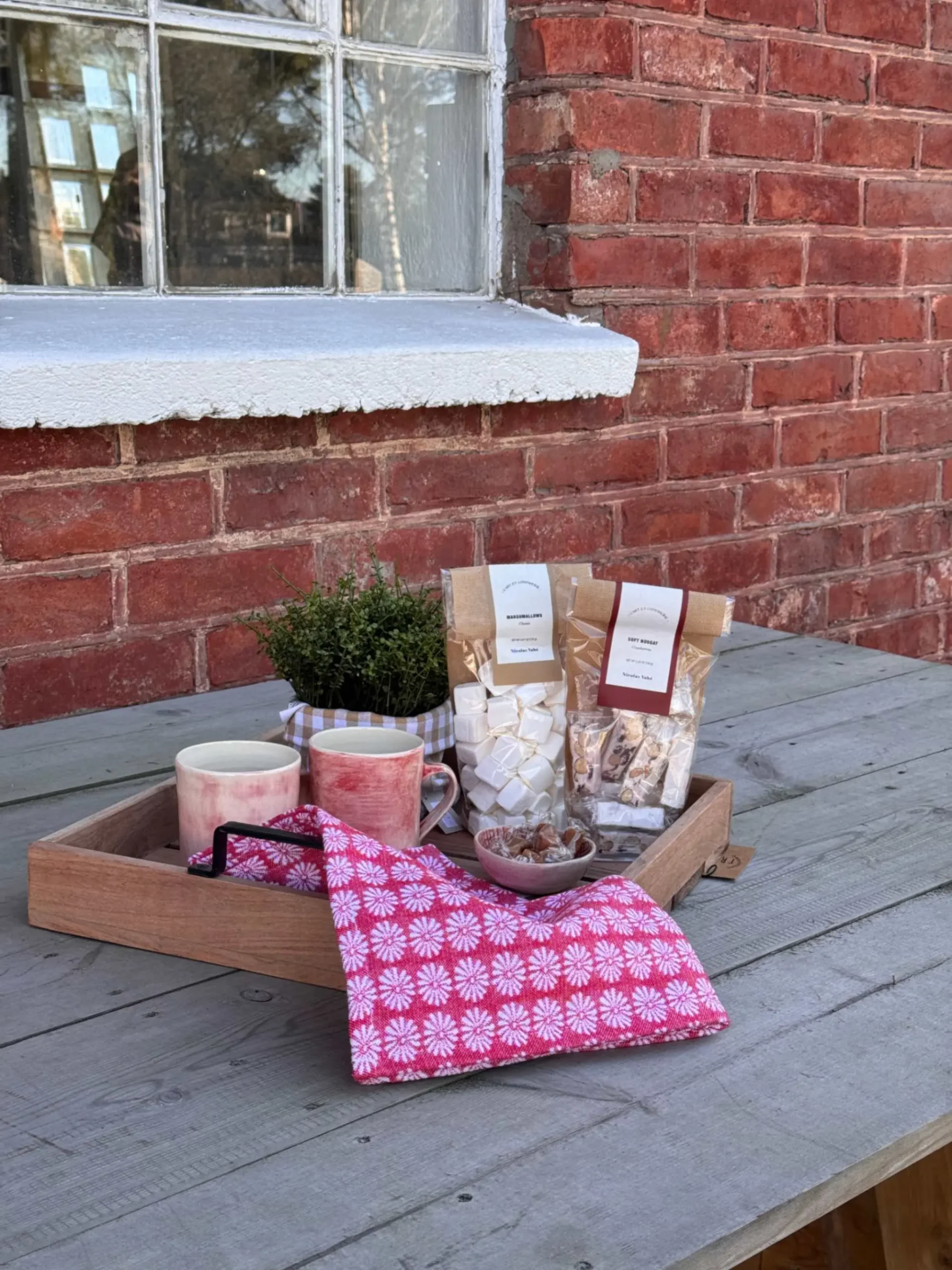 Et vakkert kjøkkenhåndkle med nostalgisk design, prydet med røde og hvite blomster, fra svenske Bruka. Det er utstyrt med praktiske hanker både på kortsiden og langsiden, som gjør det enkelt å henge på veggen.