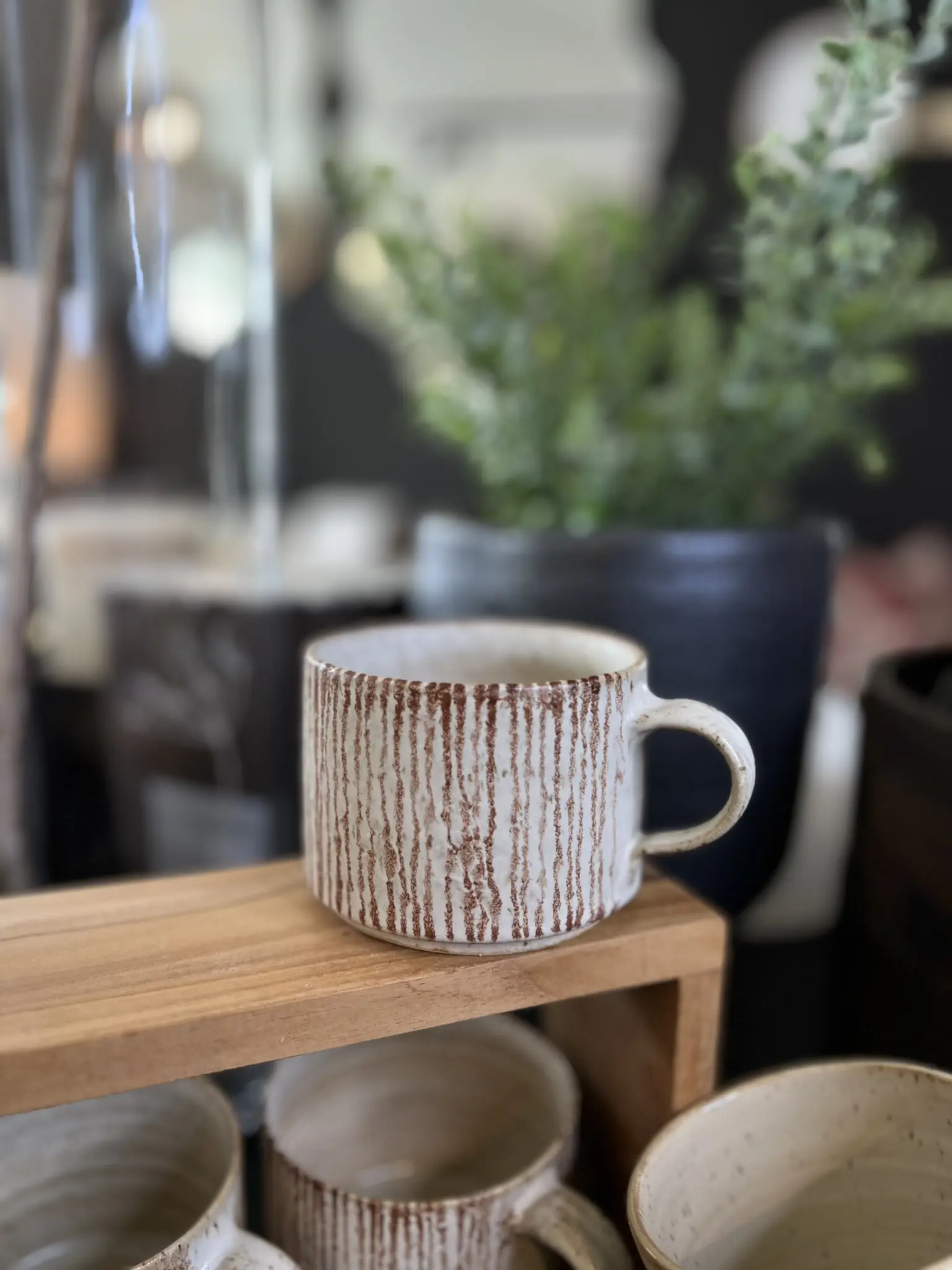 Paradisverkstadens keramikkkopper med håndmalt glasur i fargen havre/brun med fine striper. De brune smale linjene skaper en iøynefallende kontrast mot den havrefargede bunnen av koppene. Paradisverkstadens keramikkkopper er perfekte for en rekke anledninger, enten det er morgenkaffen, ettermiddagste eller en varm sjokolade på en kjølig dag.