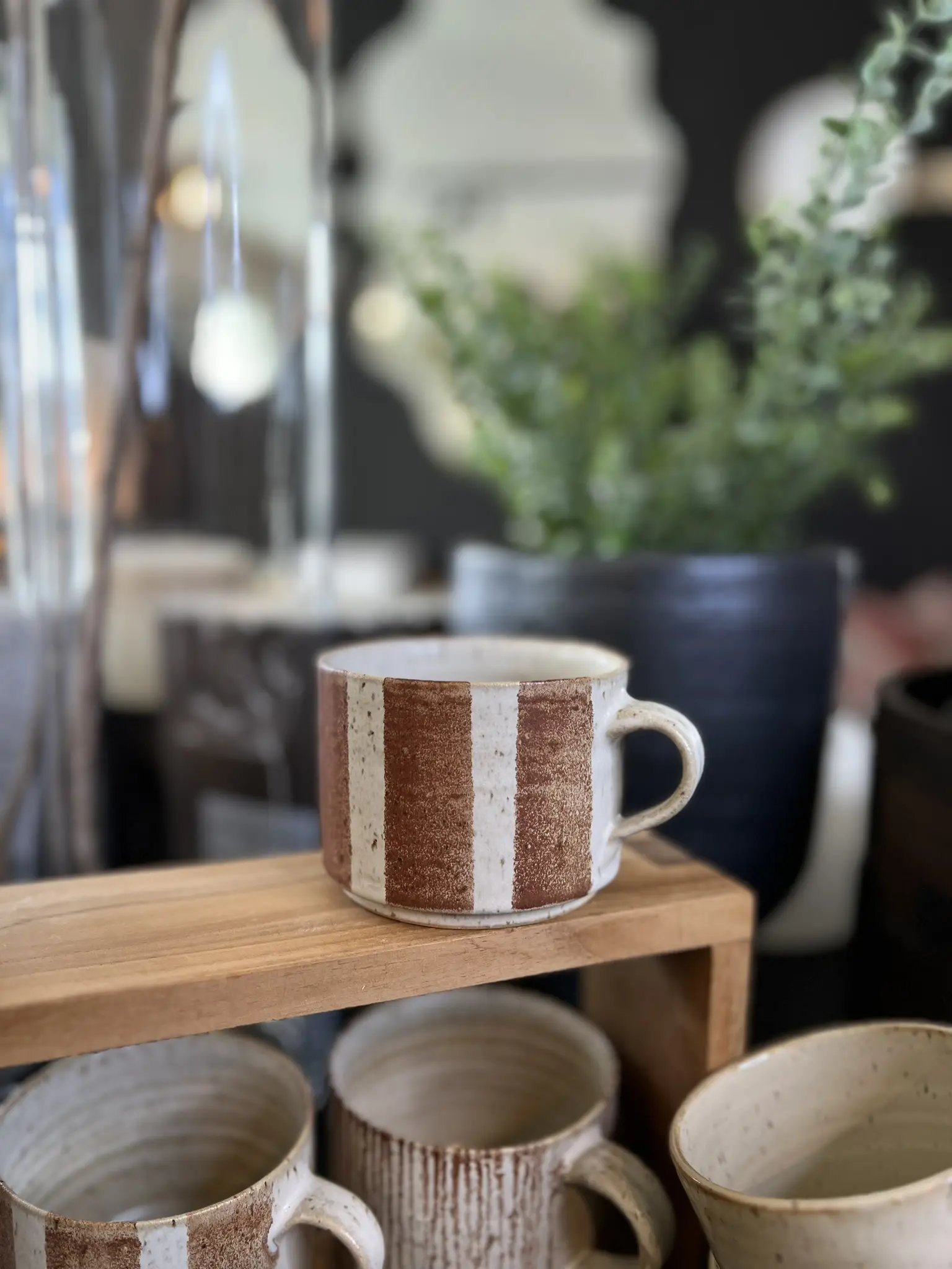 Paradisverkstadens keramikk kopper med håndmalt glasur i havre/brun. De brede linjene i brunt skaper en iøynefallende kontrast mot den havrefargede bunnen av koppene. Paradisverkstadens keramikk kopper er perfekte for en rekke anledninger, enten det er morgen kaffen, ettermiddagste eller en varm sjokolade på en kjølig dag.
