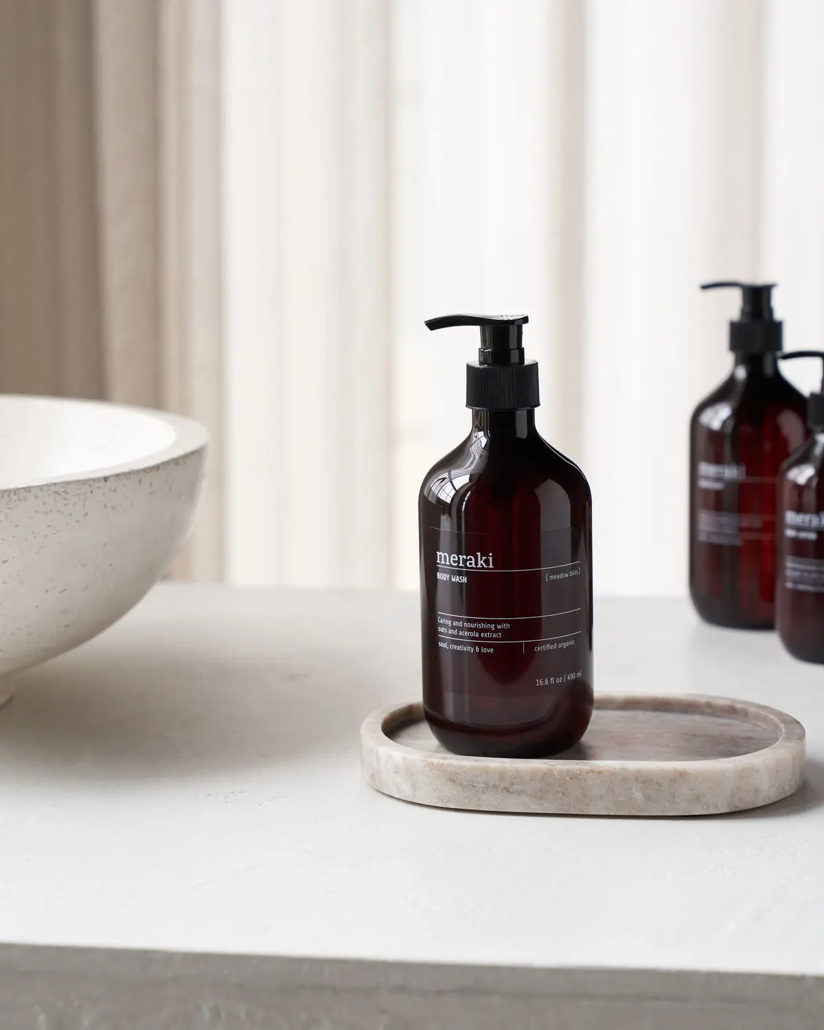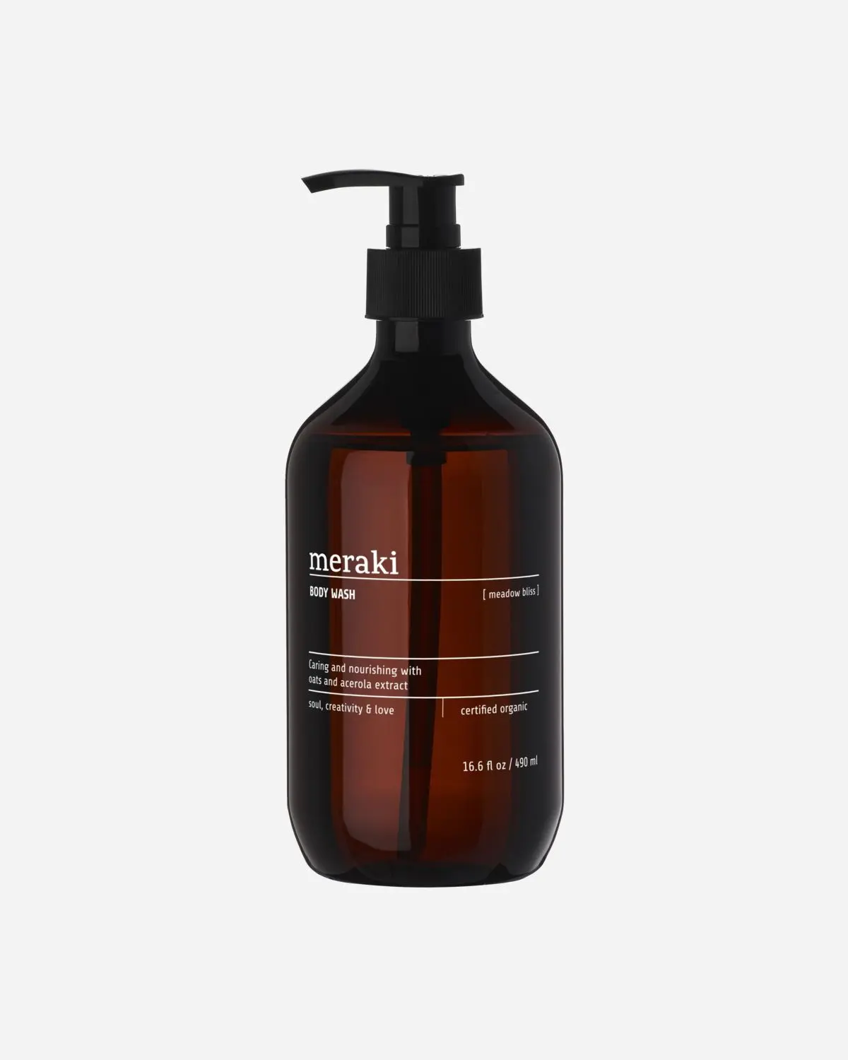 Denne Meadow Bliss kroppsvasken fra Meraki renser og skjemmer bort huden din uten å tørke den ut. Et organisk havreekstrakt nærer huden og har en beroligende effekt, mens glyserin og organisk aloe vera holder på fuktigheten. Huden din drar også nytte av fuktighetsgivende og nærende acerolaberries, som er rike på karbohydrater og antioksidant vitamin C. Body washen har en duft av bitter sitrus, tre, verbena og te. Sertifisert økologisk fra Ecocert Cosmos. Pump ut en passende mengde såpe og skum kroppen inn. Skyll grundig med vann. Passer til daglig bruk og for alle hudtyper.