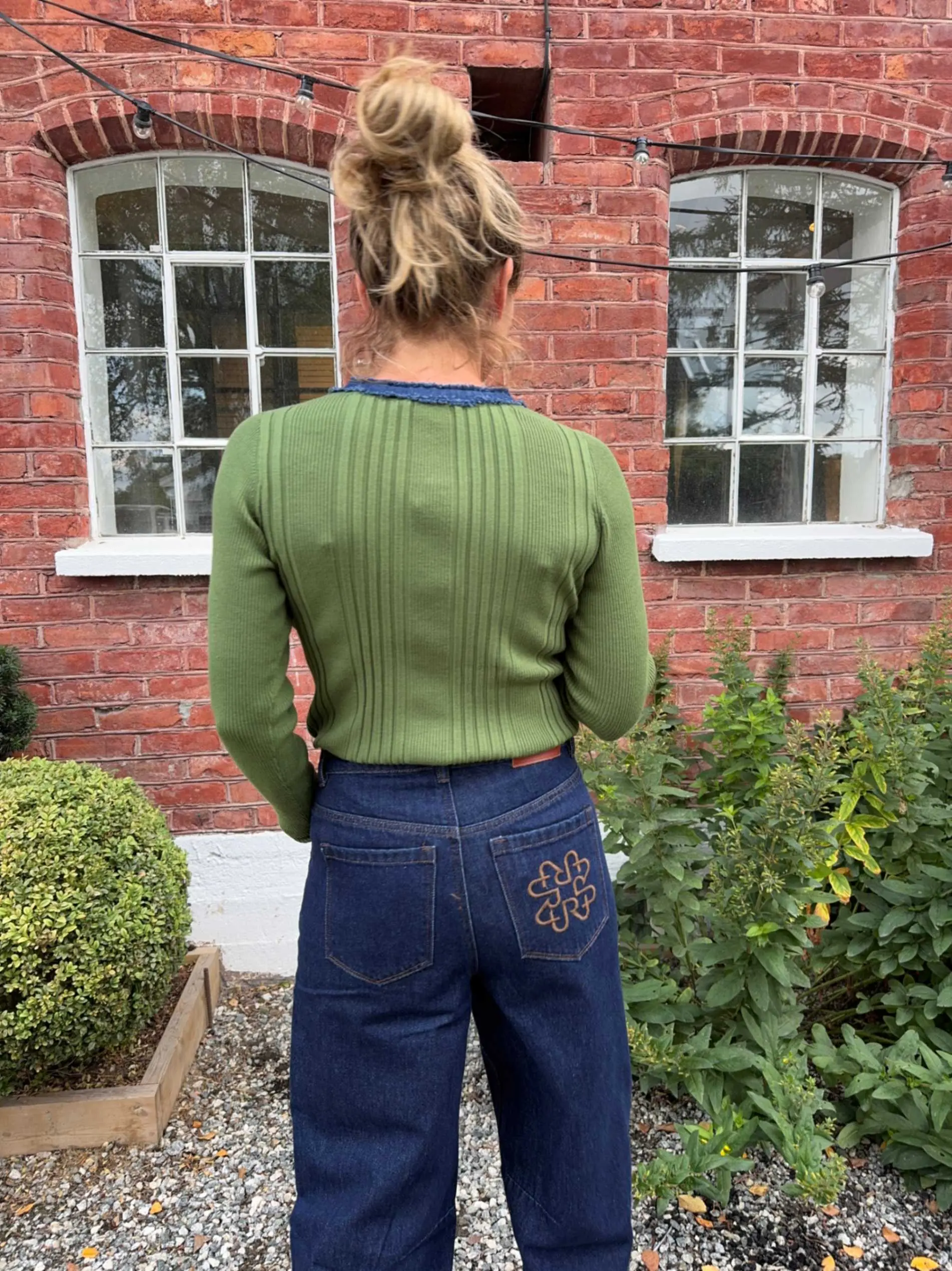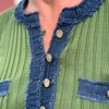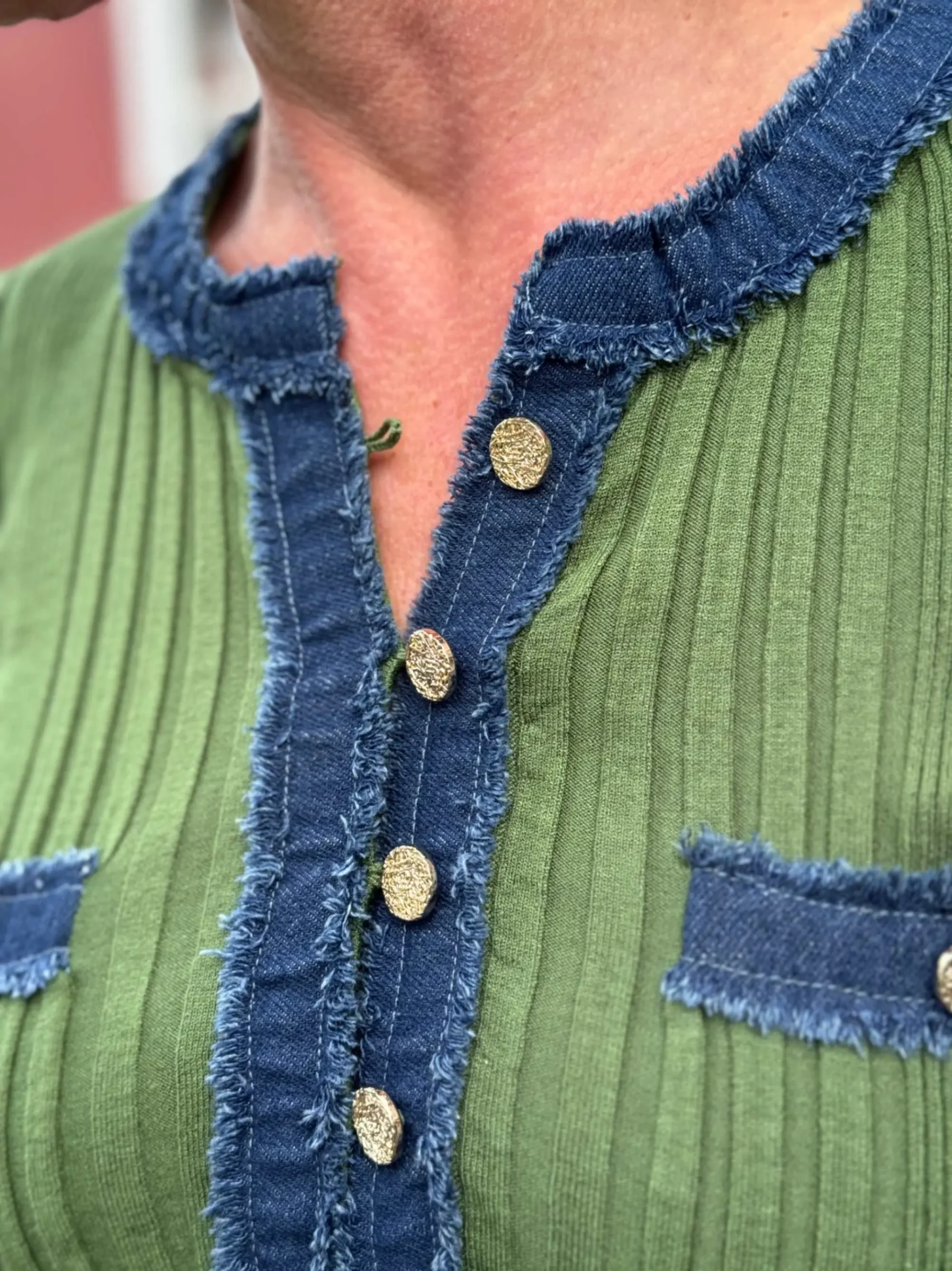 Oppdag en stilig ribbestrikket topp med denimdetaljer og dekorative gullknapper som setter prikken over i-en. Den myke og behagelige viskoseblandingen gir topp komfort, samtidig som designet skaper et eksklusivt og moderne uttrykk. Perfekt både til hverdags og til mer pyntede anledninger.