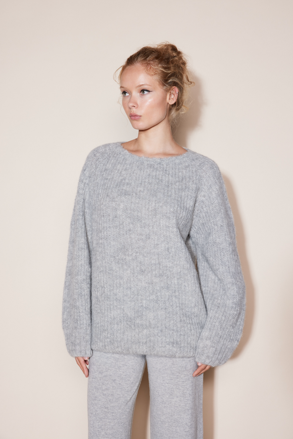Lerke genser er en fluffy og myk genser i 89% alpakka og 11% resirkulert polyamid. Patentstrikk gjør at den er både superlett og chunky på samme tid. Genseren er lang og har rib på nedre kant og på ermene. Produsert av Woodling i Norge.