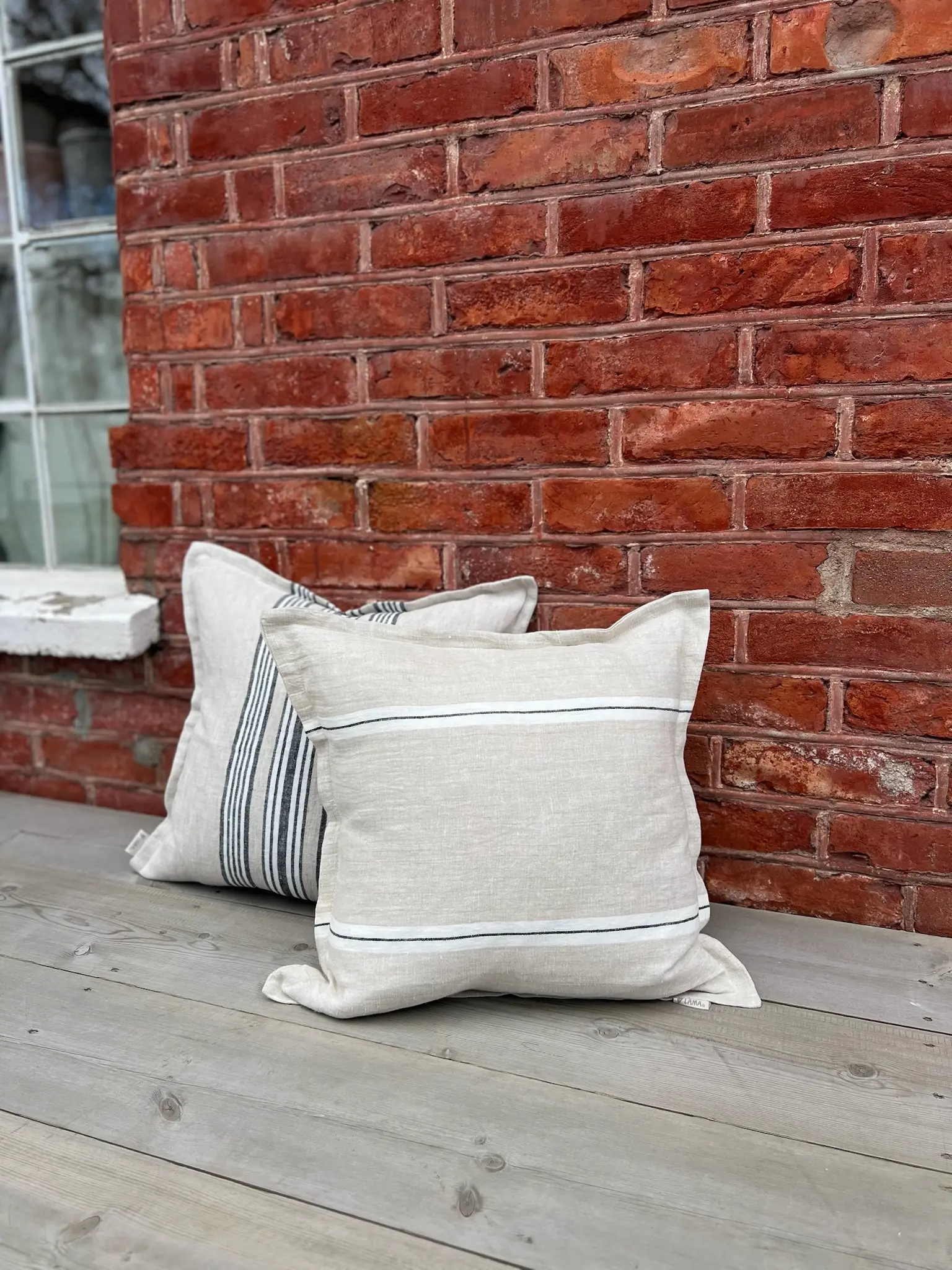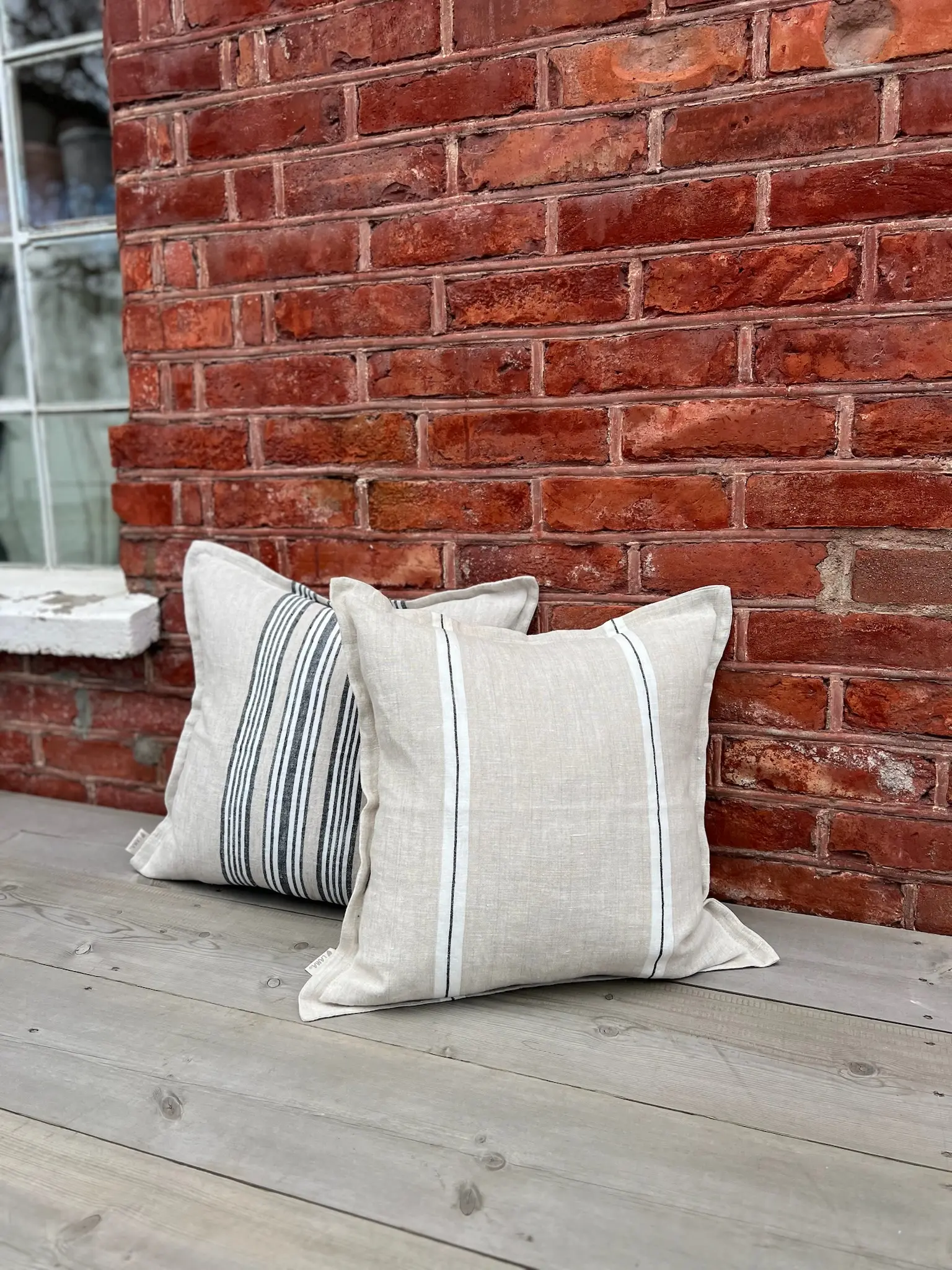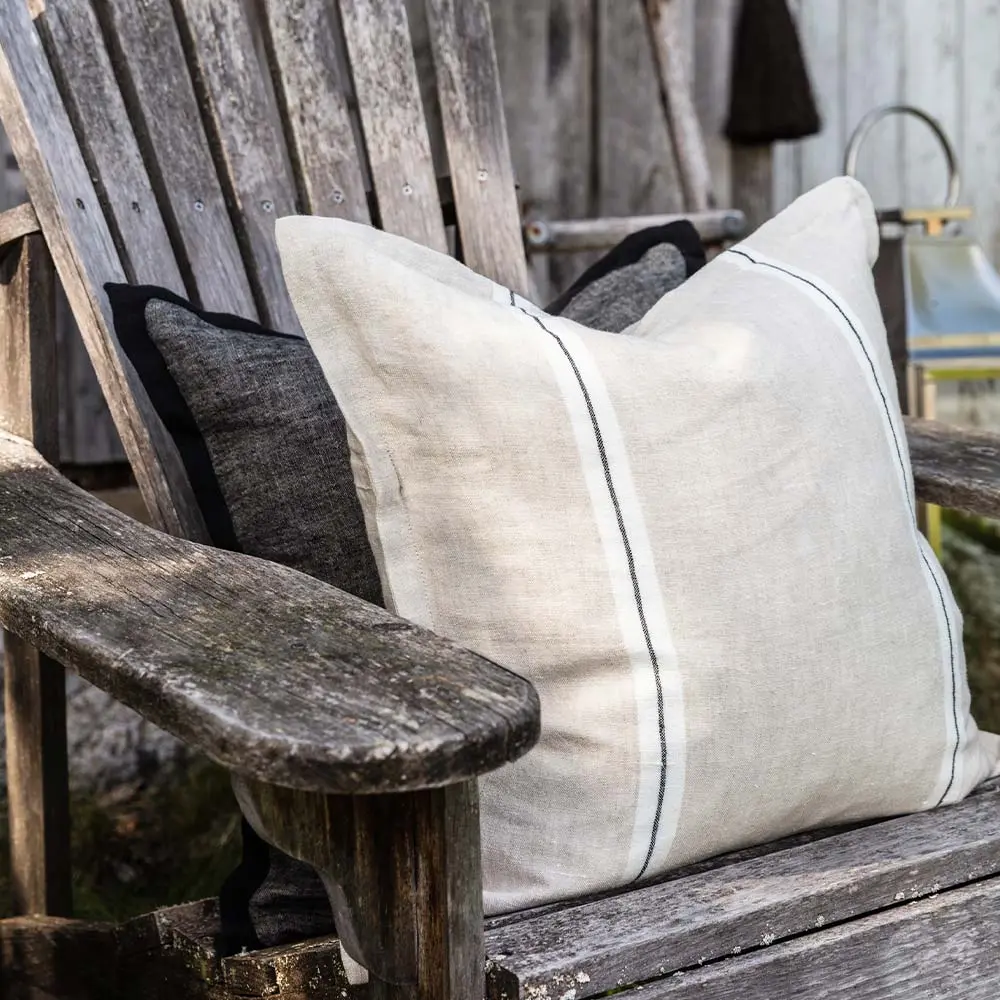 Klassisk linpute med minimalistisk preg. Naturbeige lin med to enkle, tynne striper i naturhvitt og sort over midten av puten. Denne puten er flott å style flere like samlet, eller i kombinasjon med våre andre puter. Miks den med puter i andre materialer som fløyel eller skinn for en spennende kontrast.