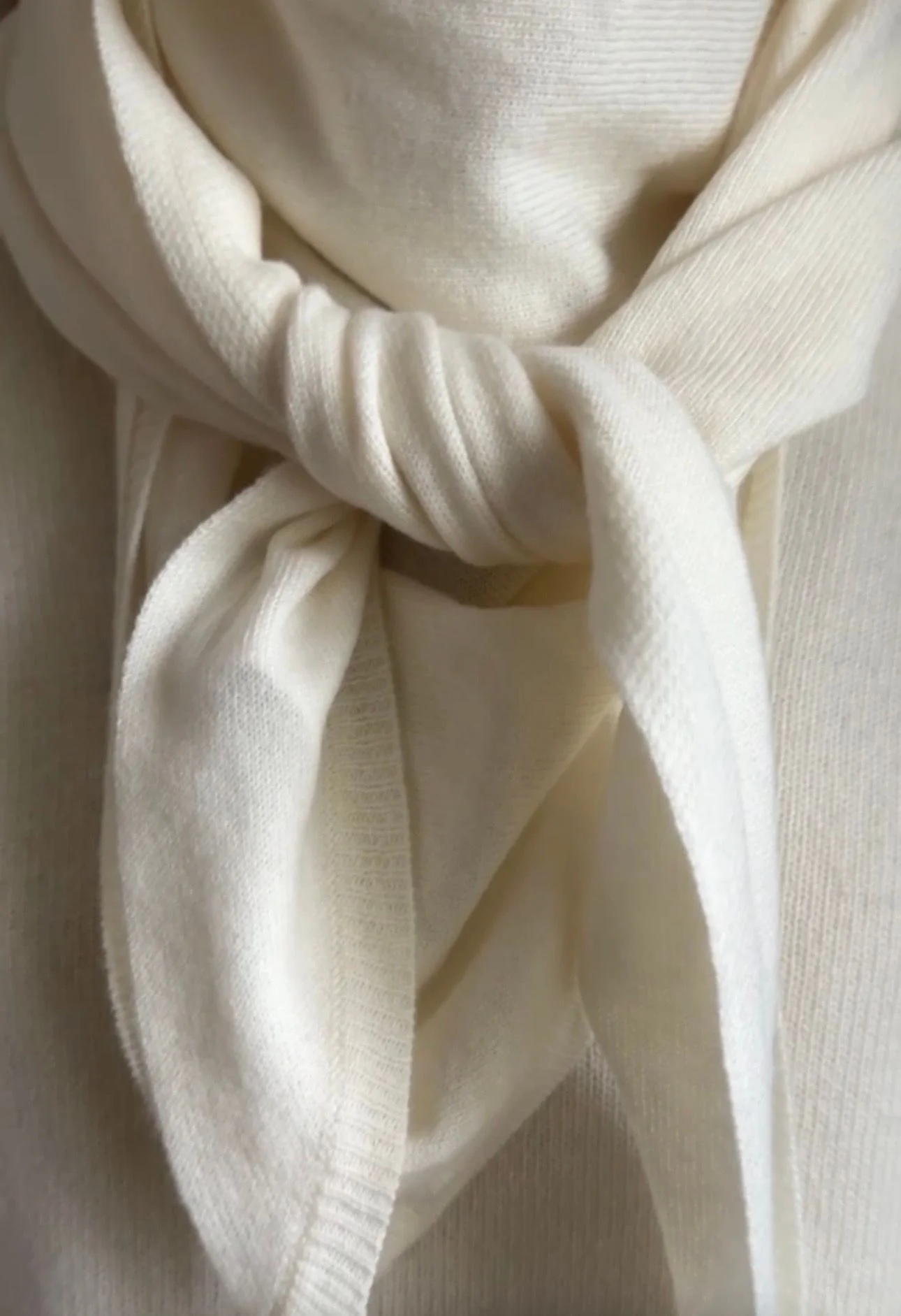 Nydelig, mykt trekantskjerf i off-white fra norske Rève. Et allsidig sjal som er like fint til vår og sommer som til høst og vinter.