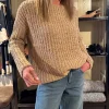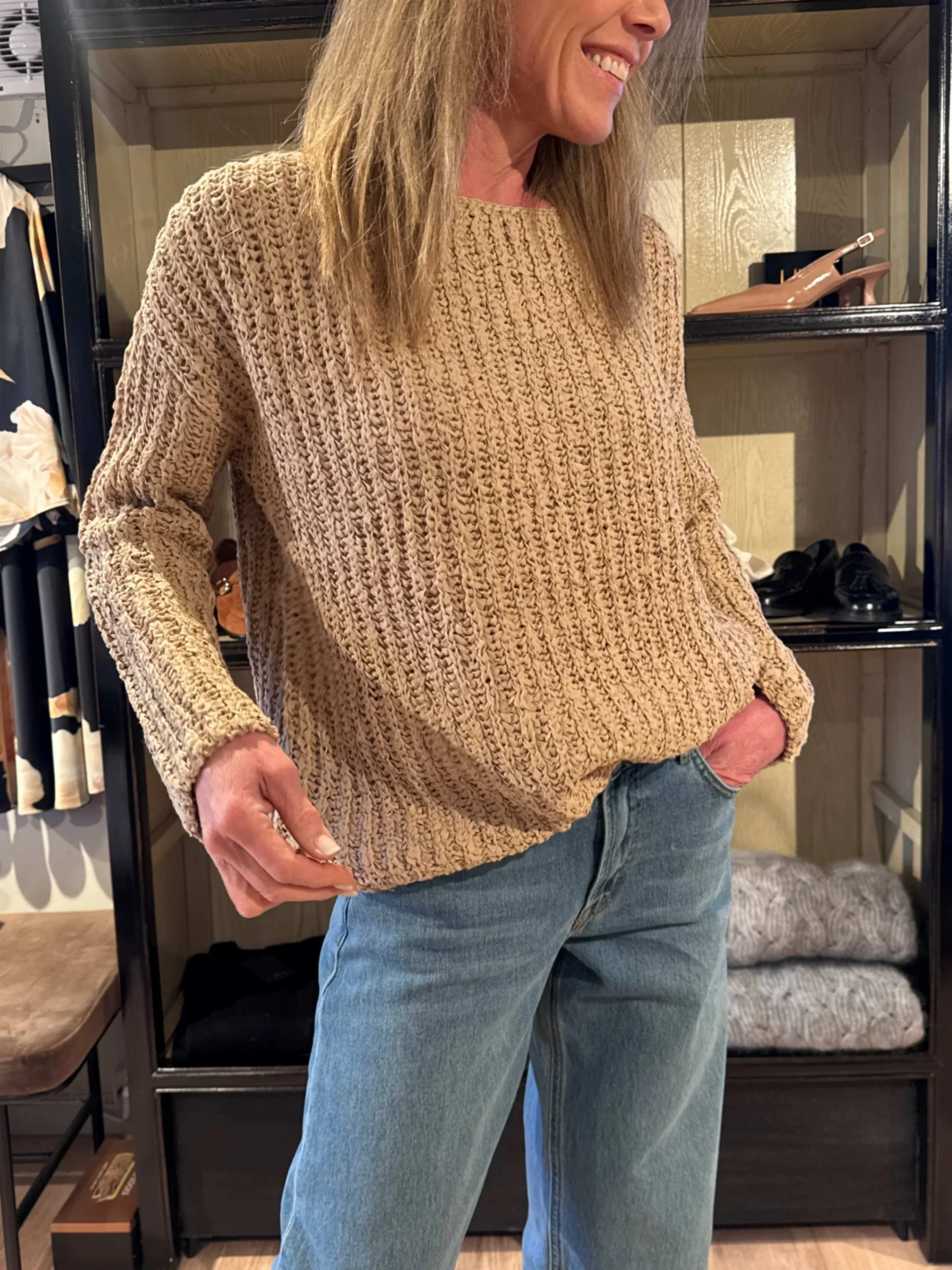 En lekker, sandfarget strikkegenser med en avslappet passform som gjør den perfekt til hverdagsbruk. Den er utrolig myk mot huden og gir både komfort og stil i ett – et allsidig plagg som enkelt kan styles til enhver anledning.