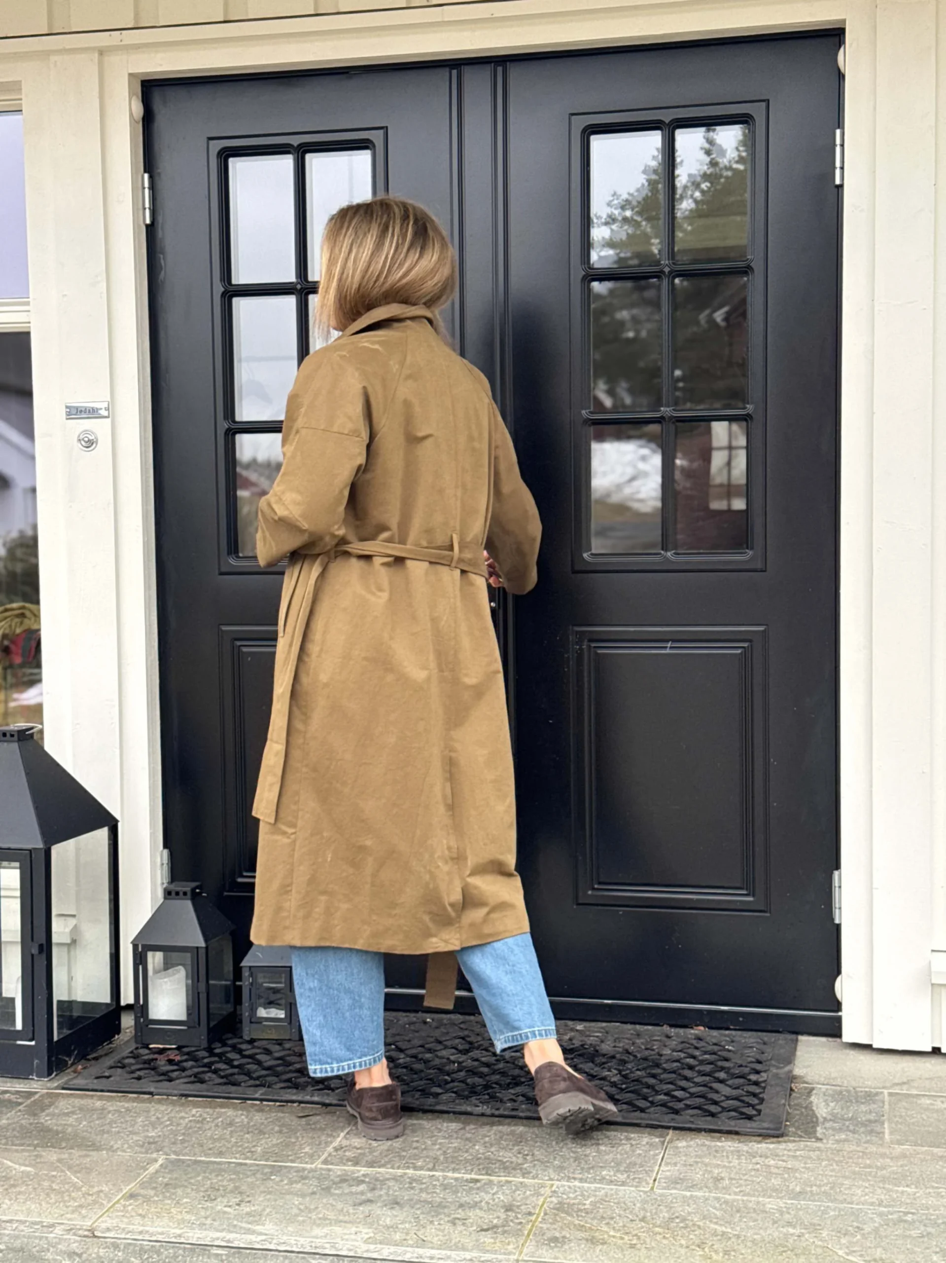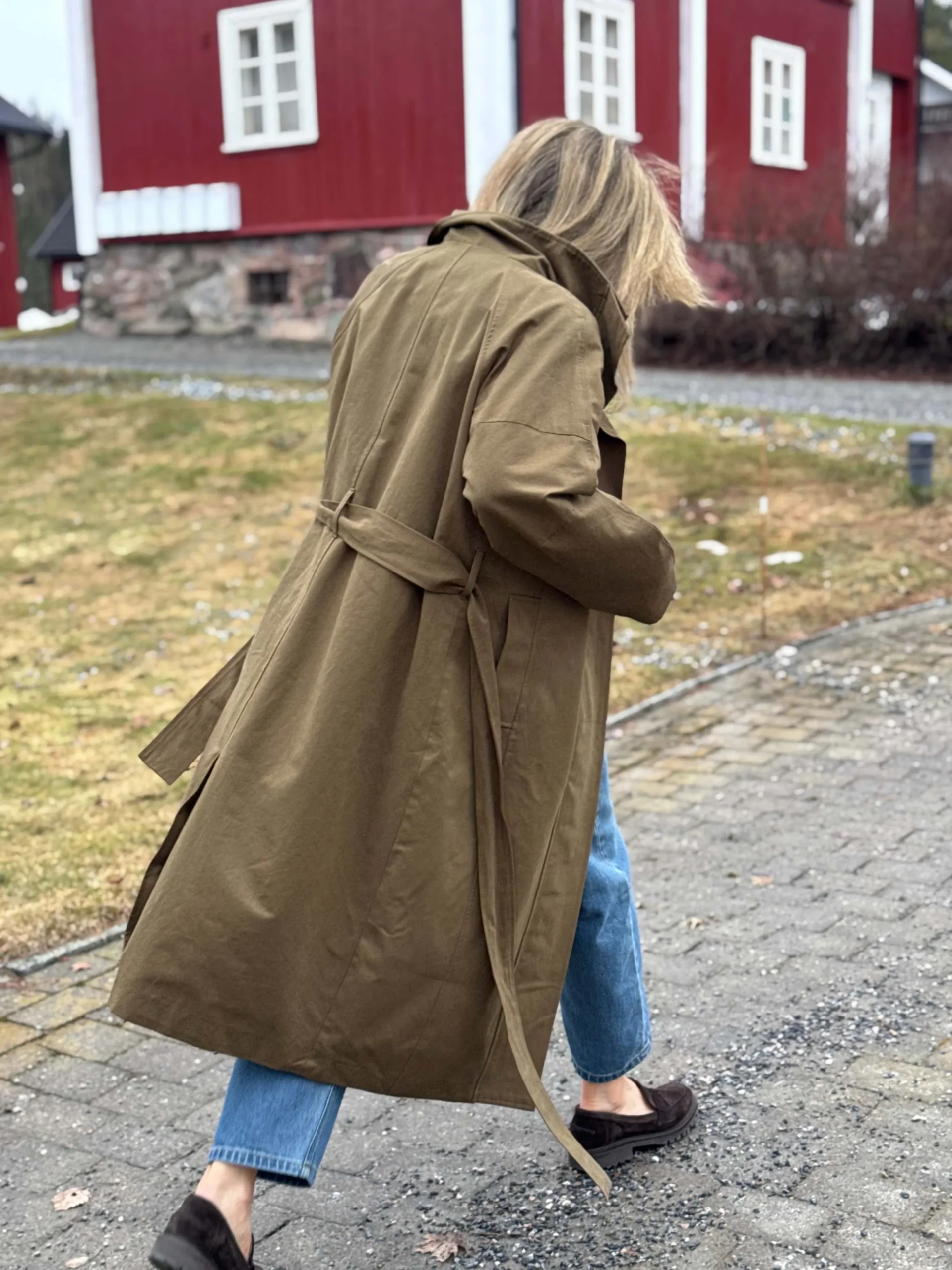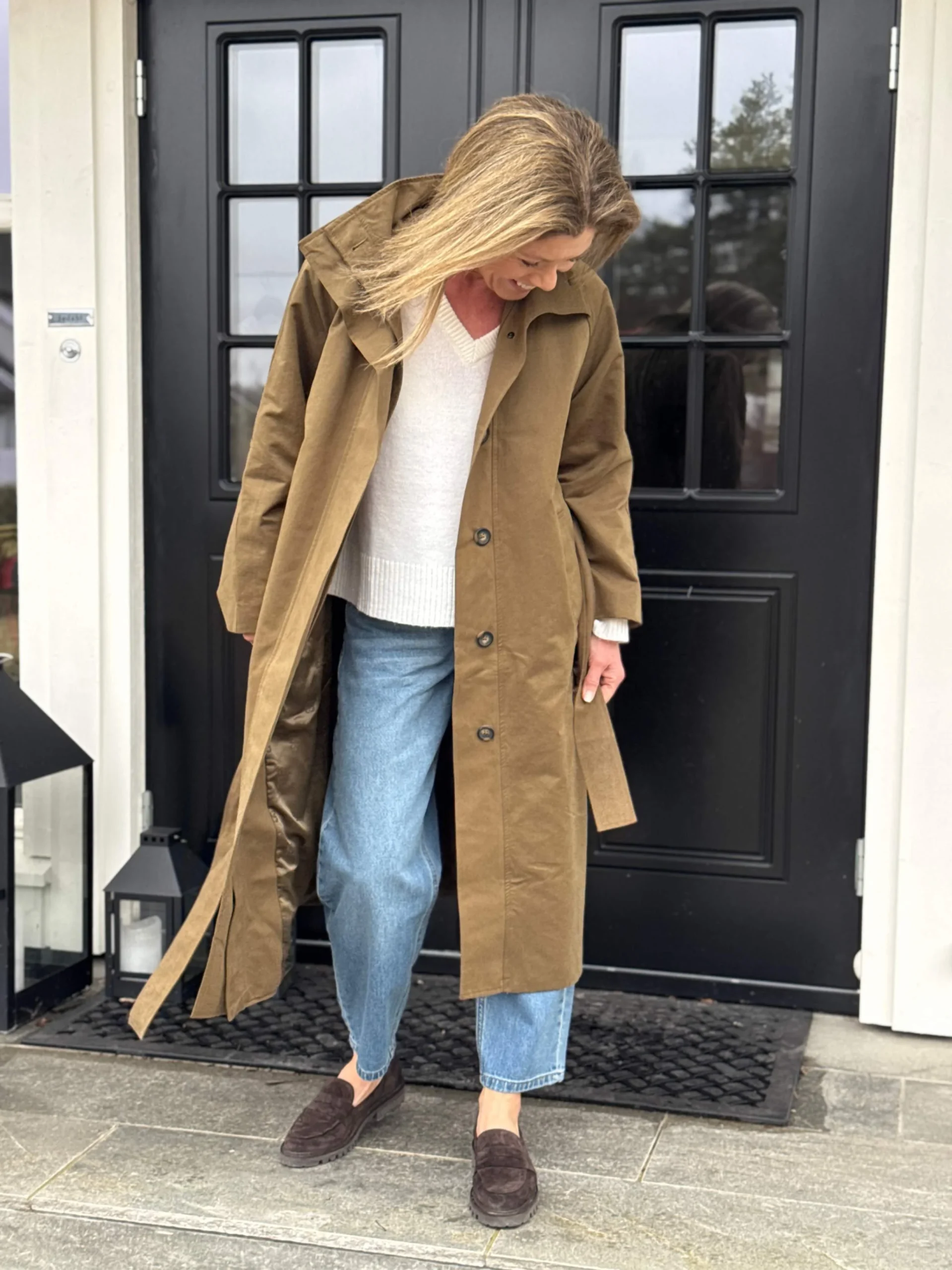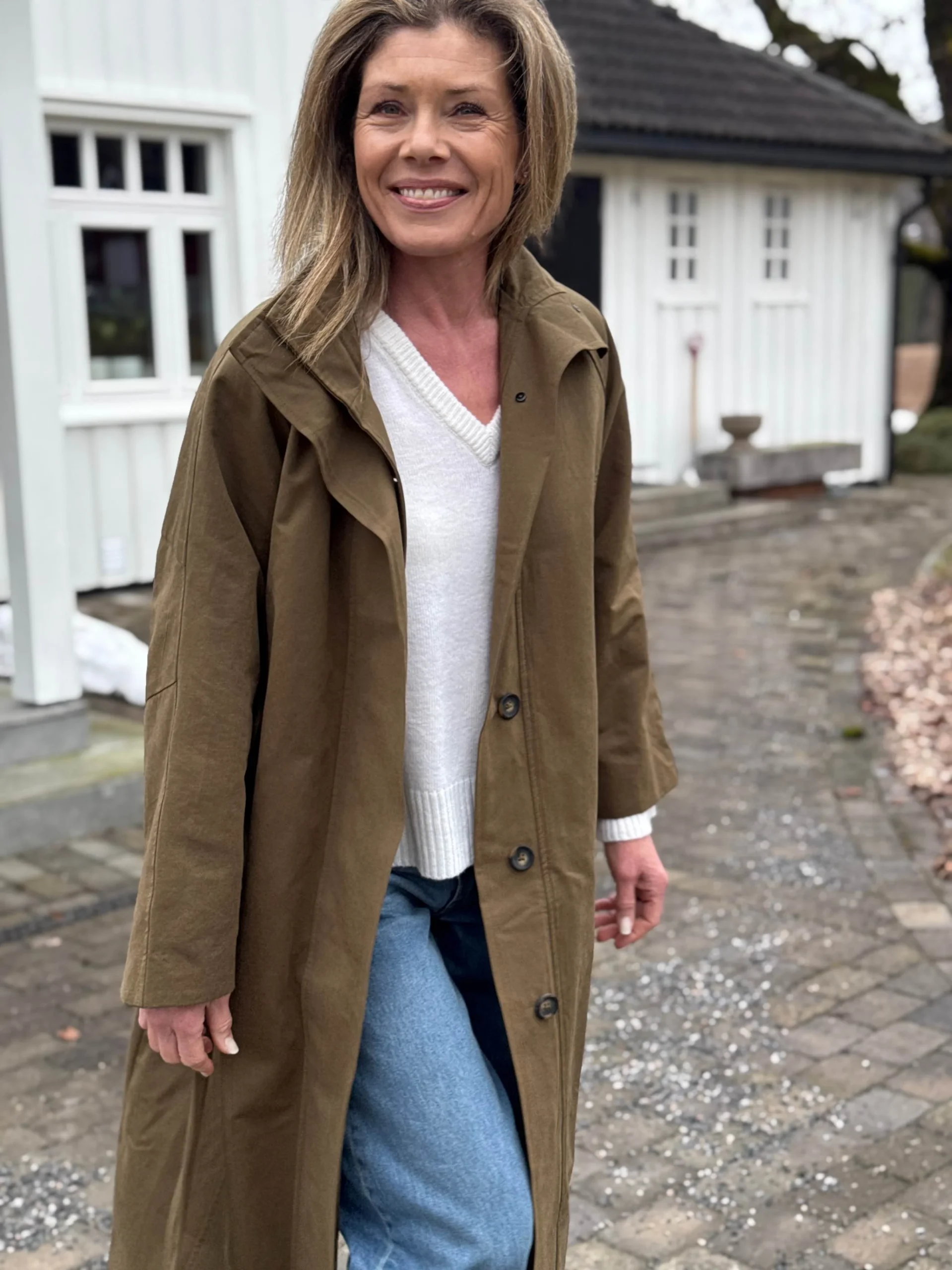 Lekker lang trenchcoat med en stilren høy krage og skjult knappelukking foran. Kåpen har sidelommer og et avtakbart knytebelte i livet. Et flott og allsidig plagg!